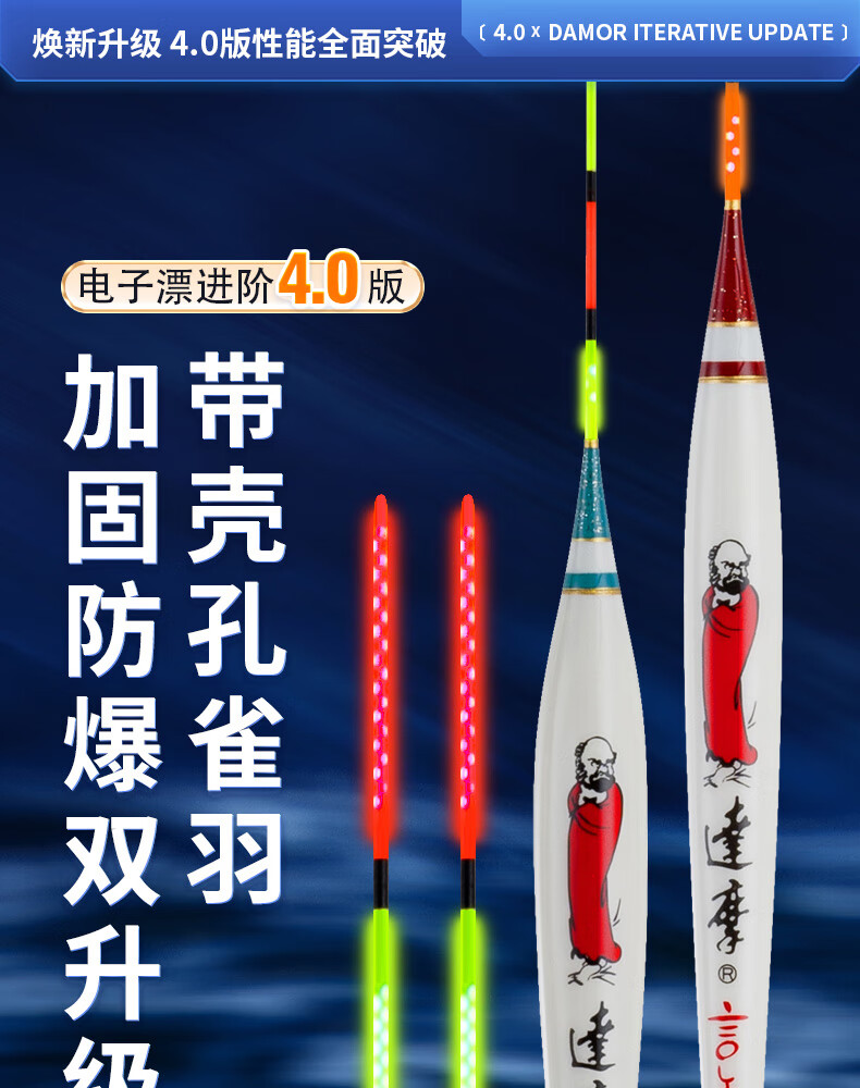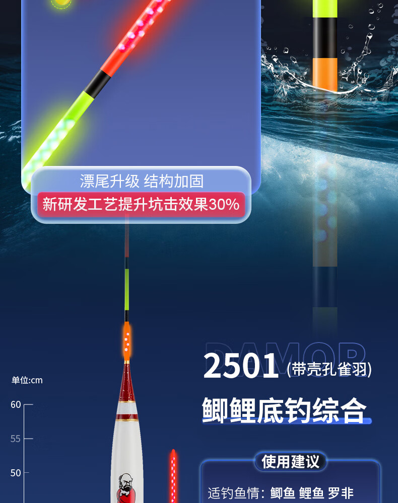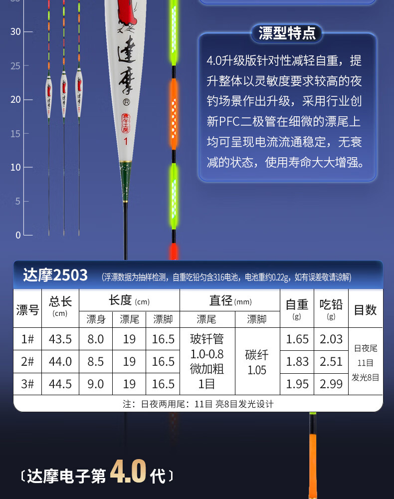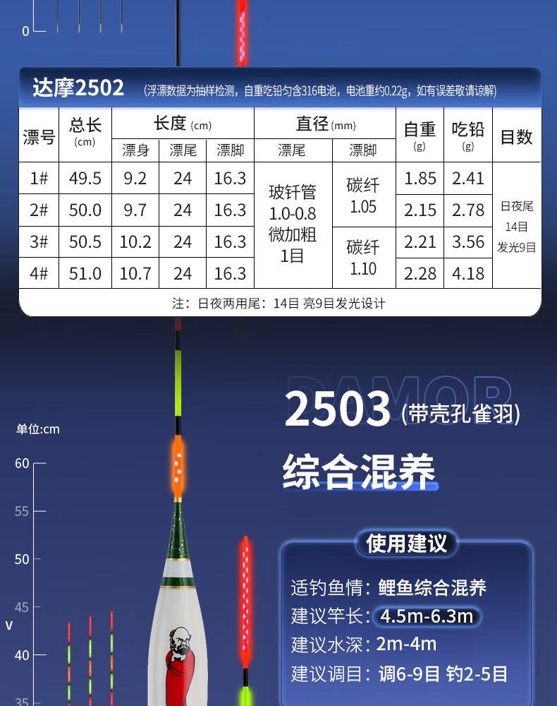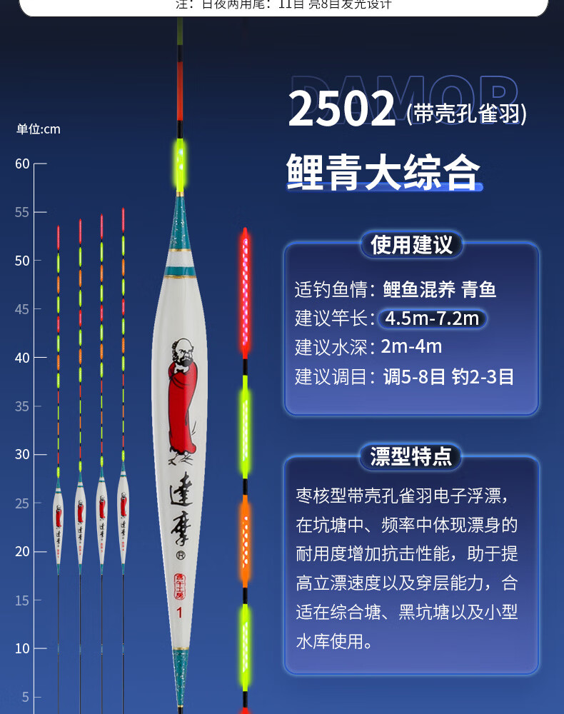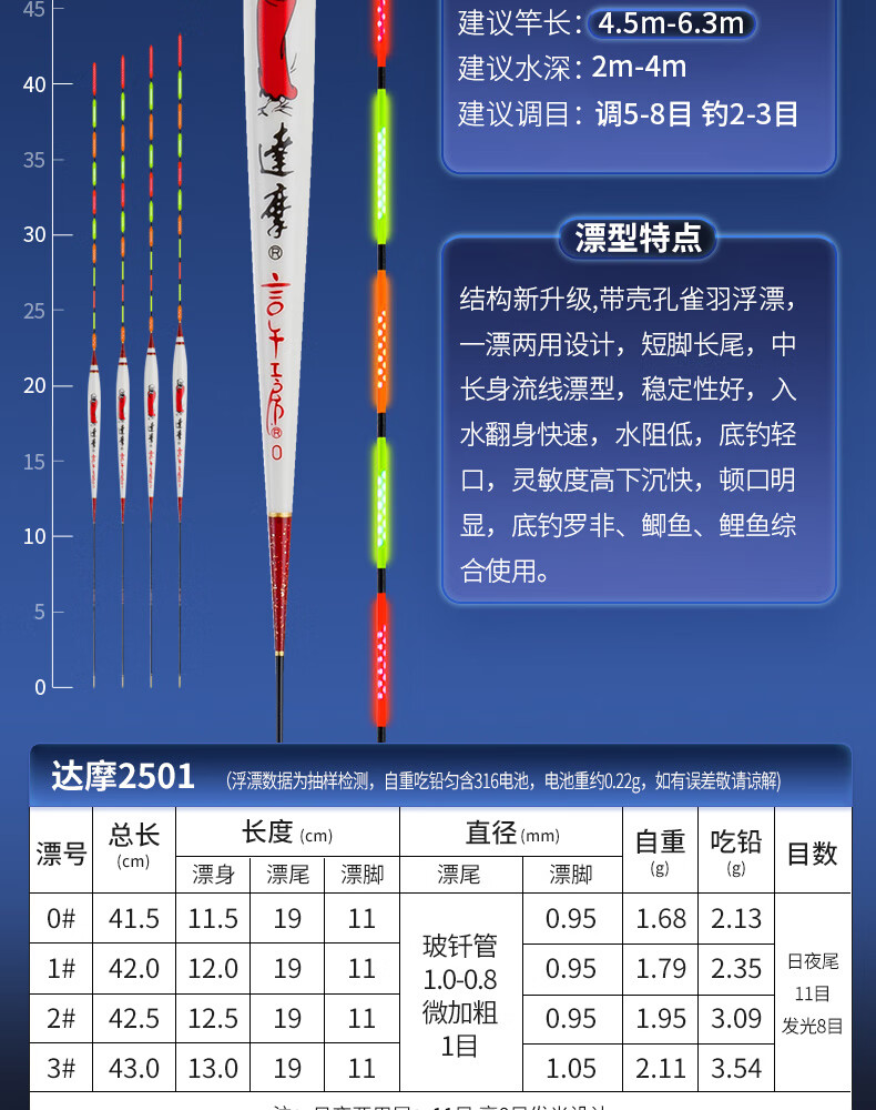 达摩夜光漂2501浮漂日夜两用带壳孔雀羽鱼漂高灵敏鲤鱼鲫鱼电子夜钓漂 新品2501【鲫鲤底钓综合夜光漂】 3号