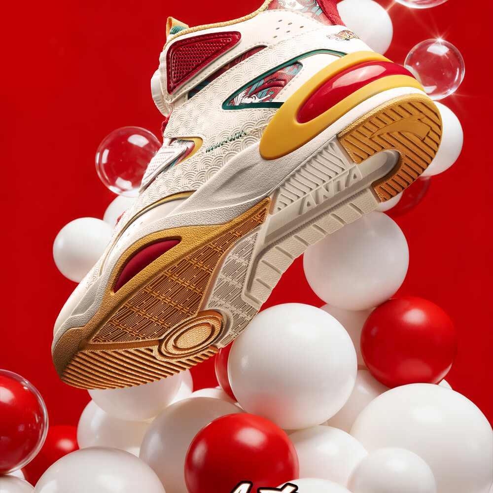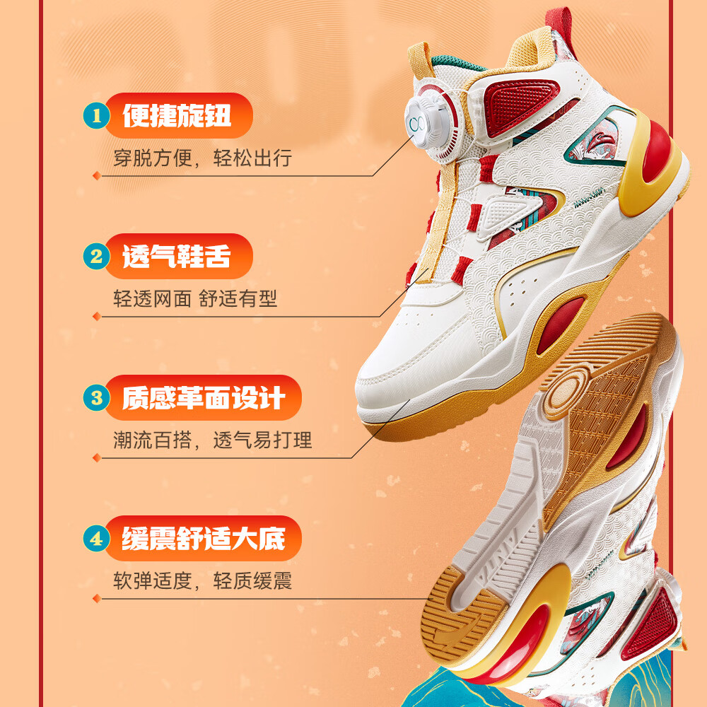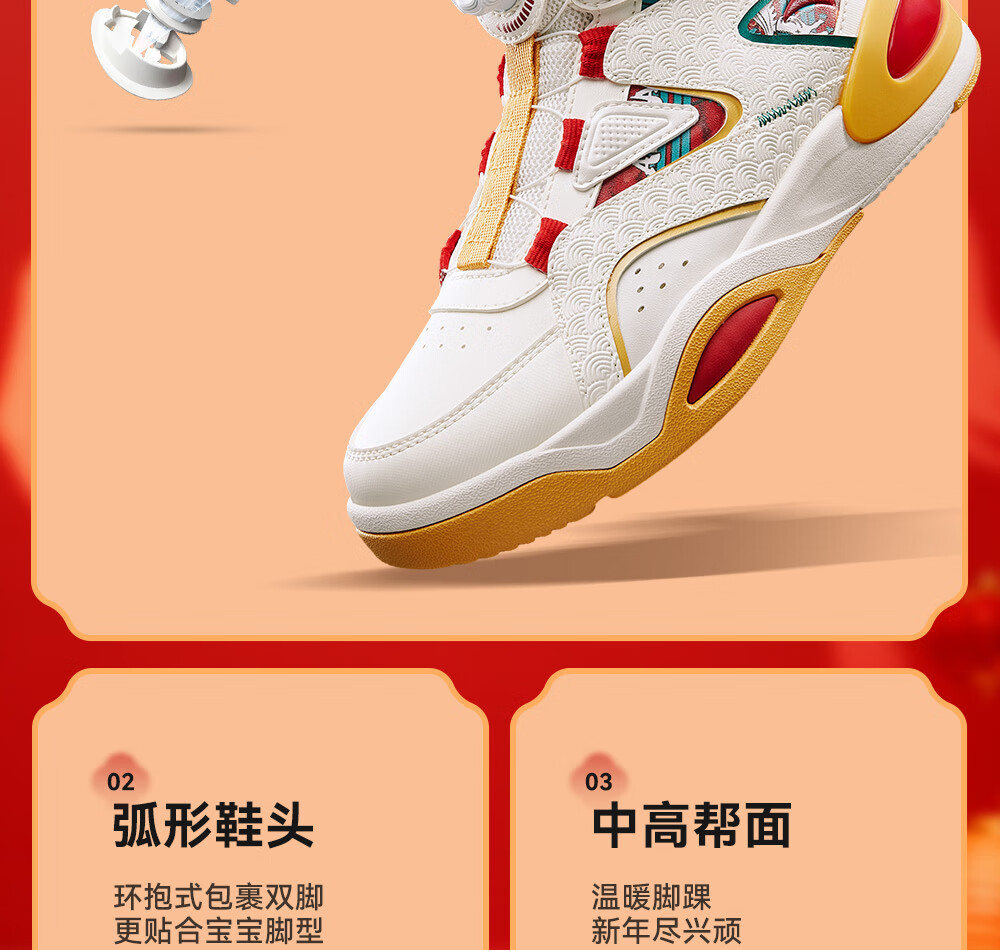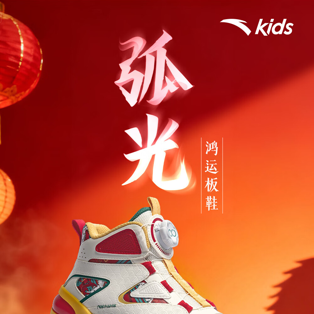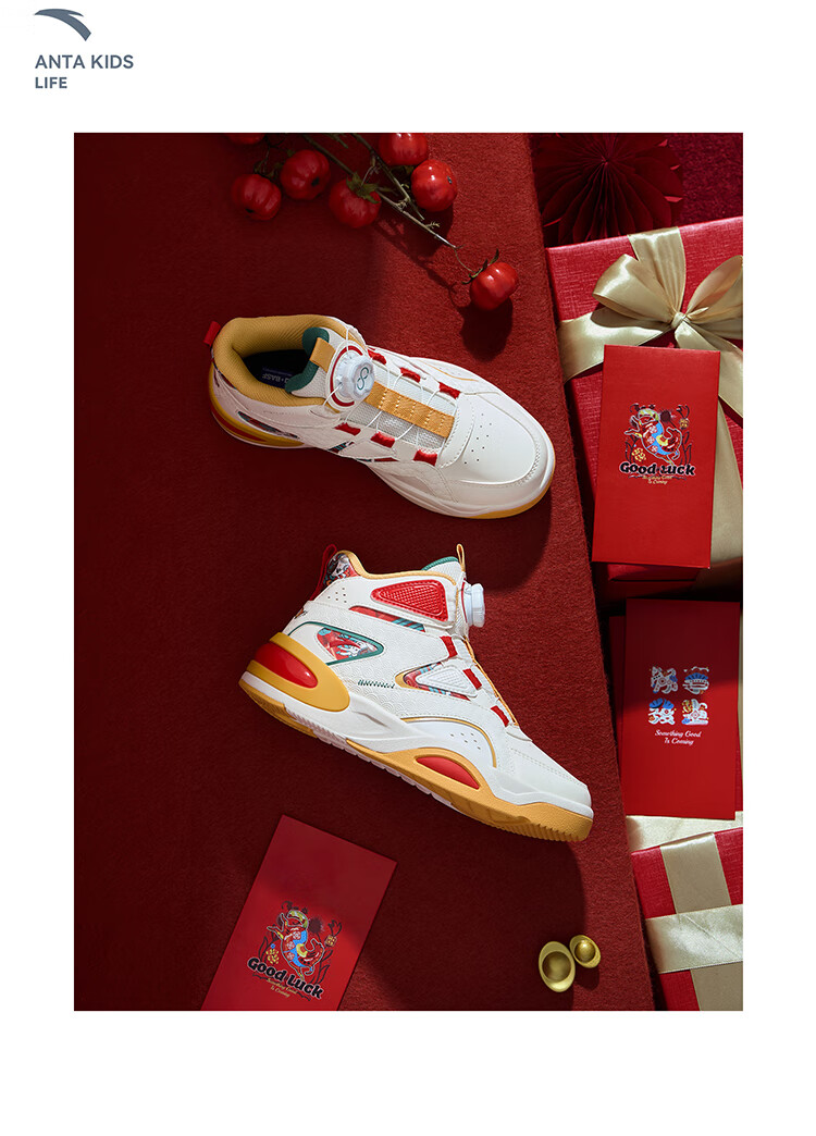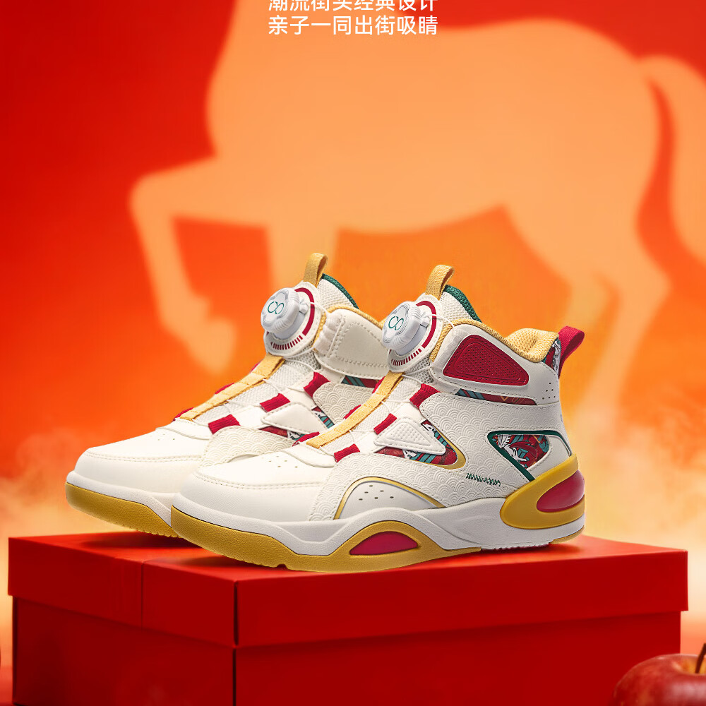 安踏童鞋男女大童弧光高帮板鞋26新年鸿运国潮风革面旋钮儿童运动鞋 【店长推荐】象牙白/经典红-1 37 鞋内长23.5cm
