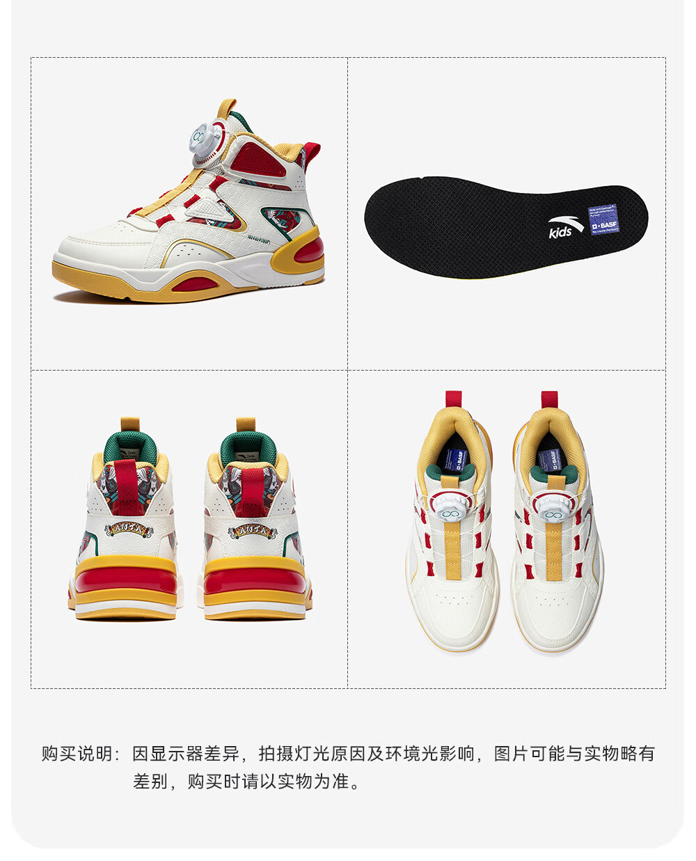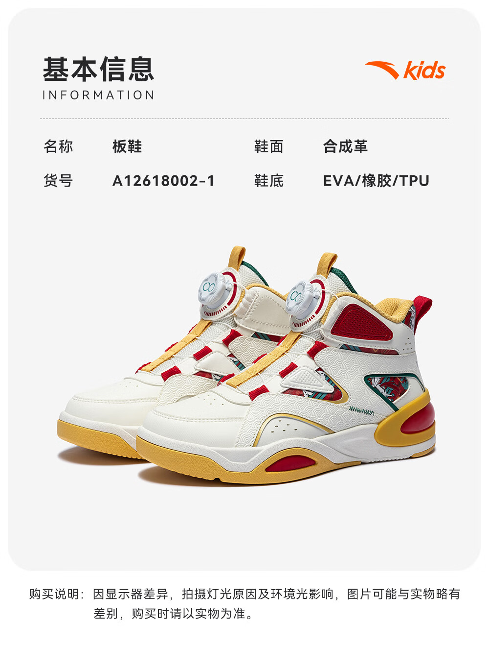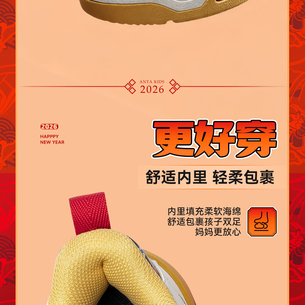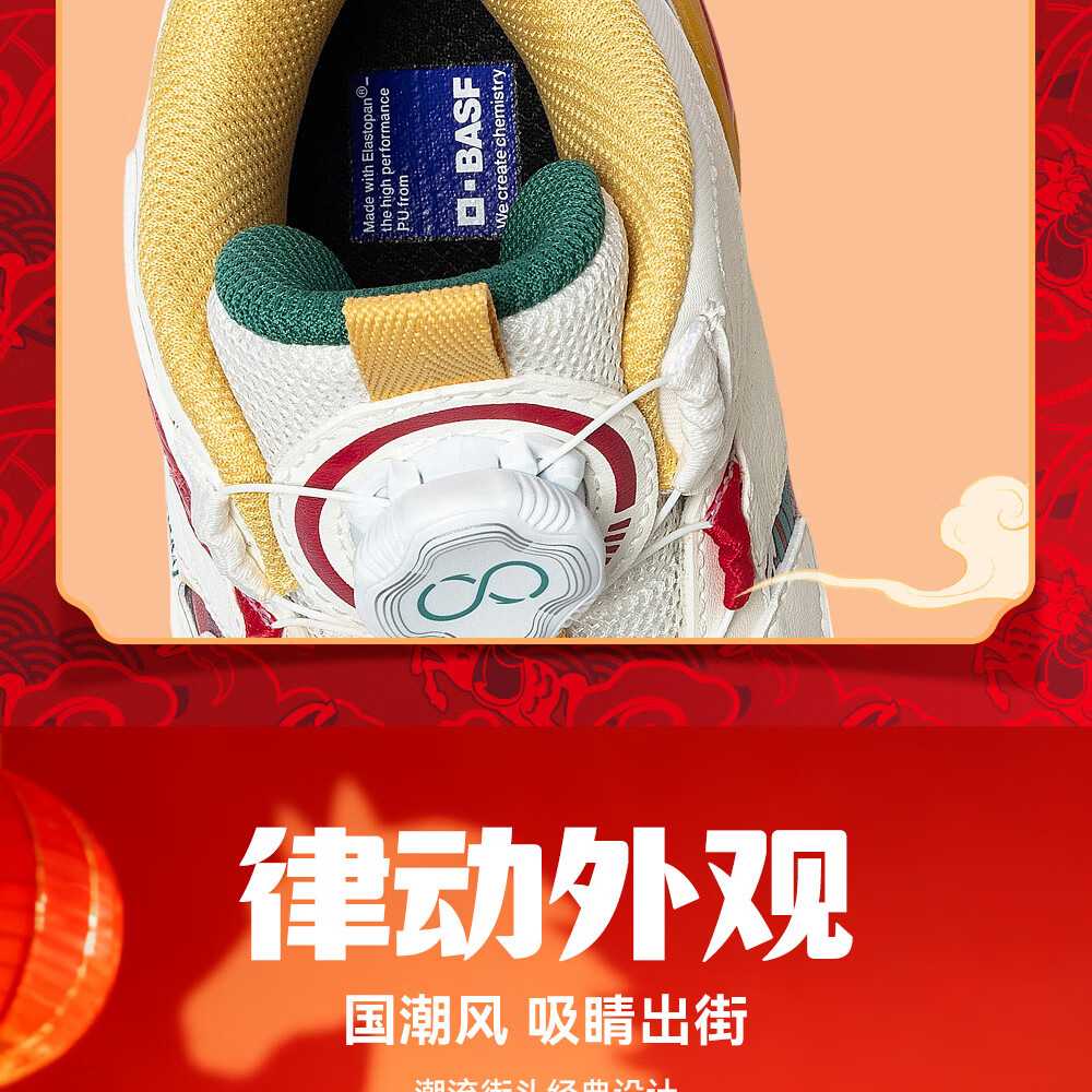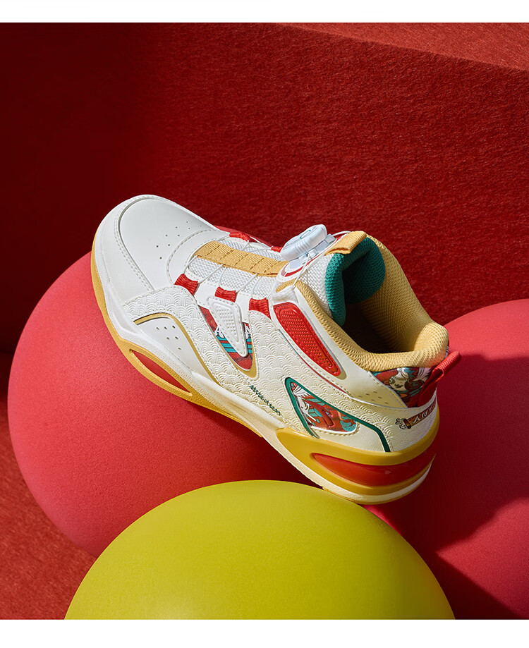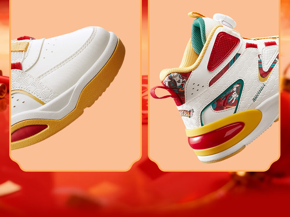 安踏童鞋男女大童弧光高帮板鞋26新年鸿运国潮风革面旋钮儿童运动鞋 【店长推荐】象牙白/经典红-1 37 鞋内长23.5cm