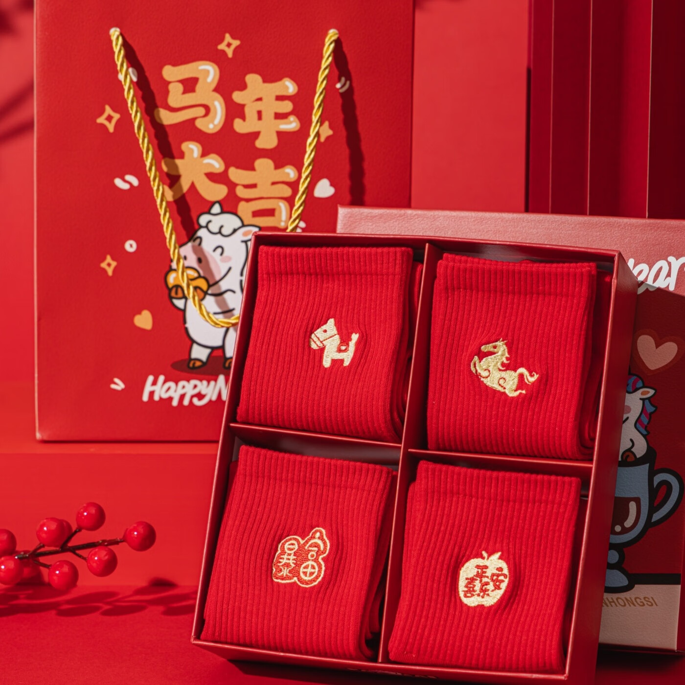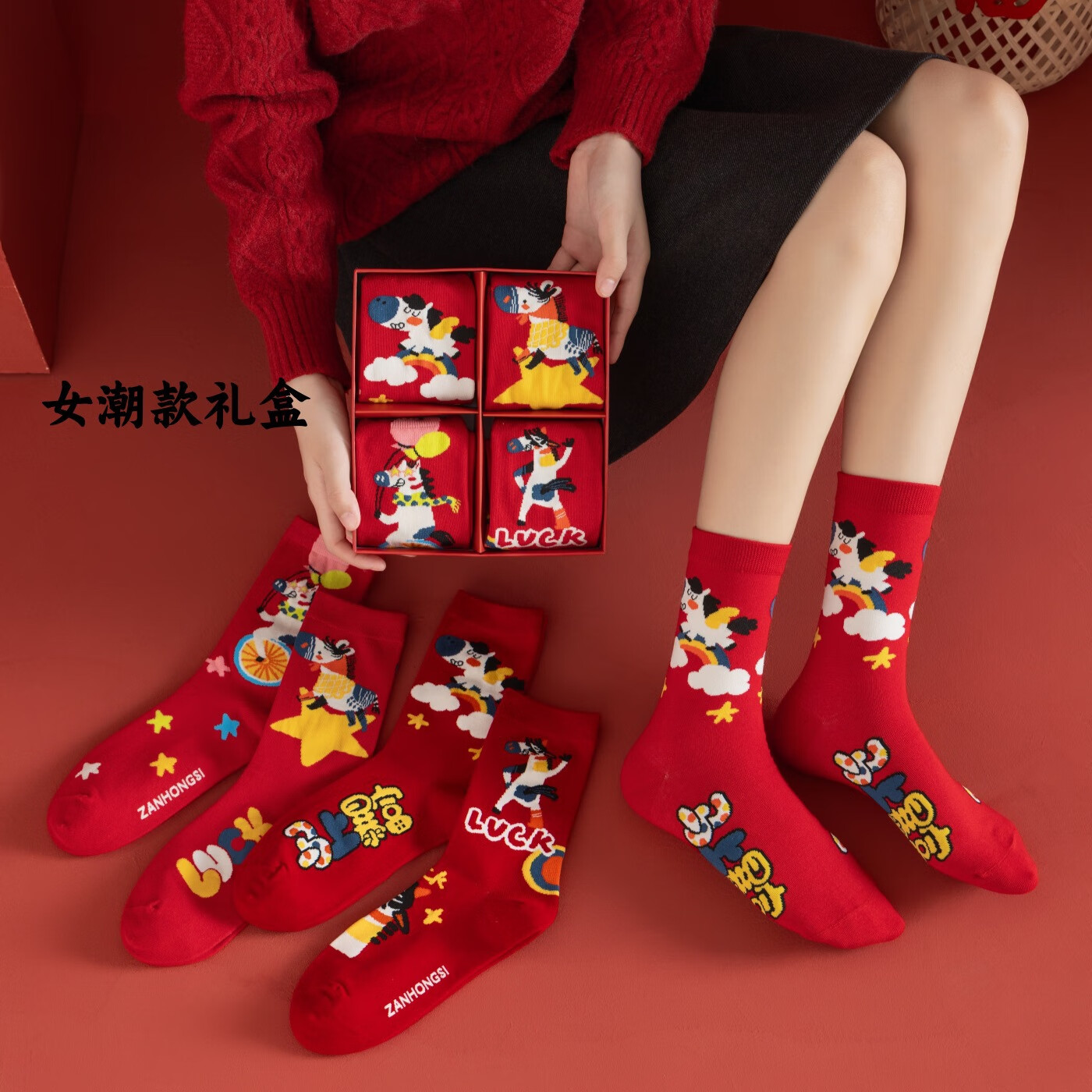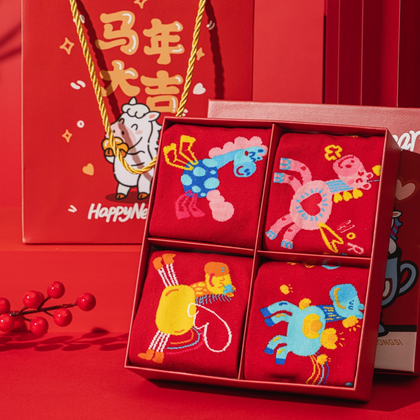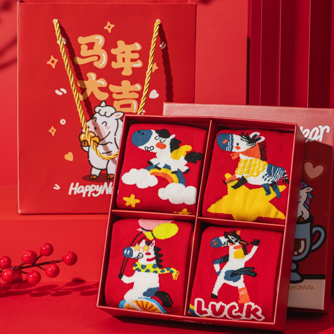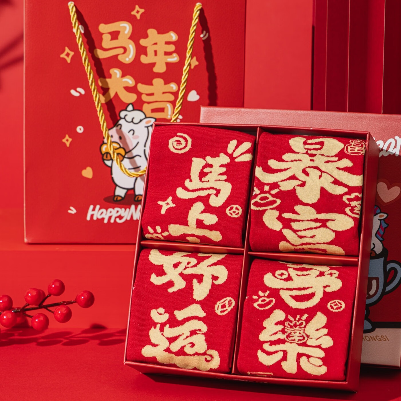 相于中马年本命年大红新年袜子男女中筒鸿运袜男女送礼礼盒秋冬中筒袜子 本村首富款 礼盒装 4双