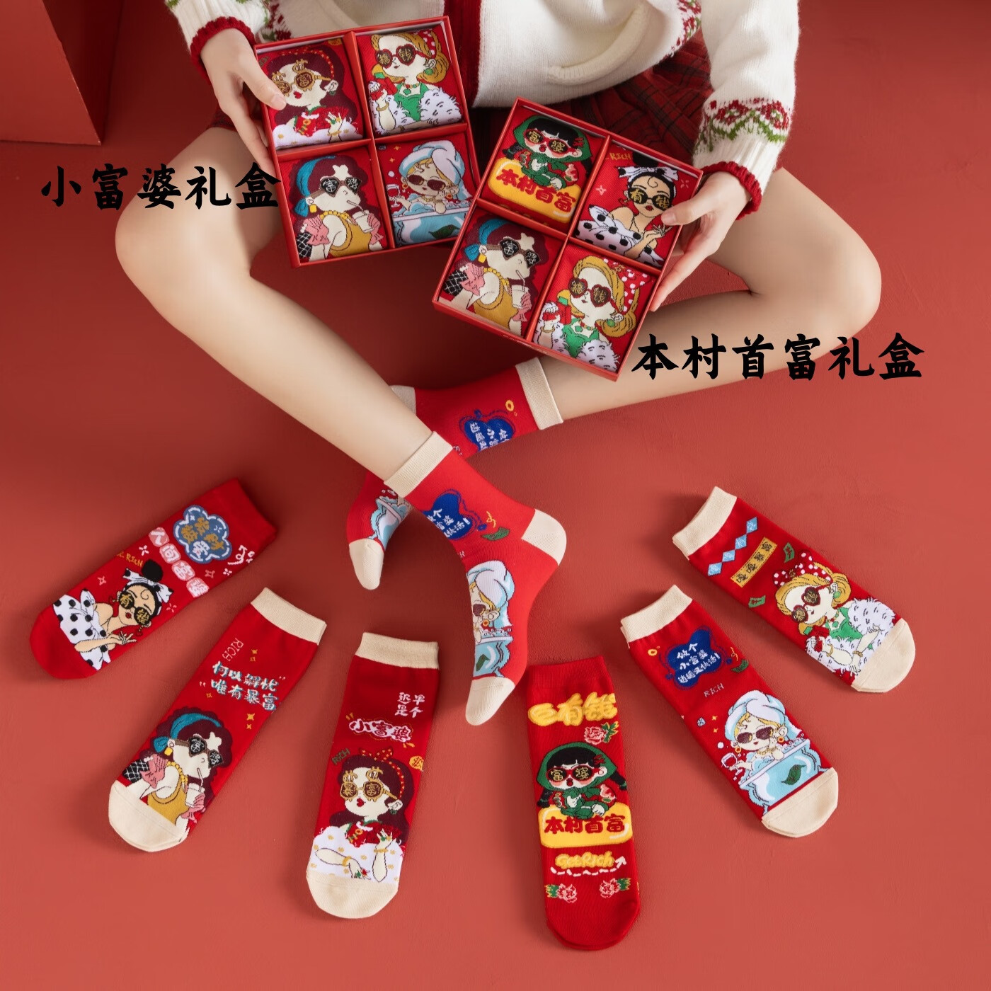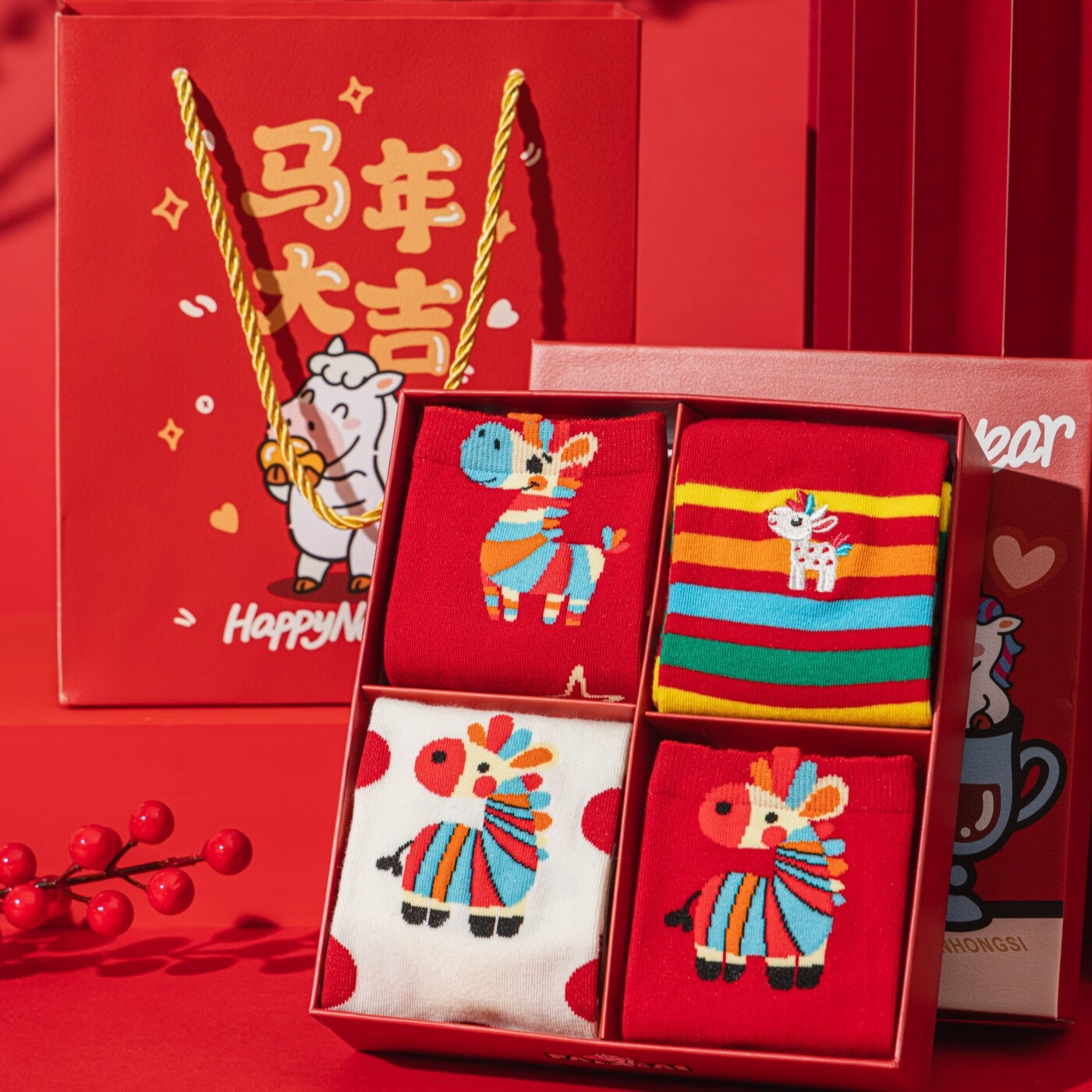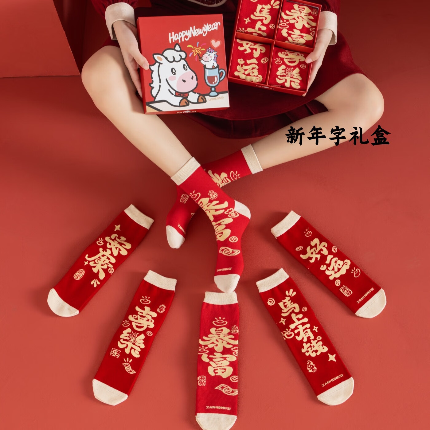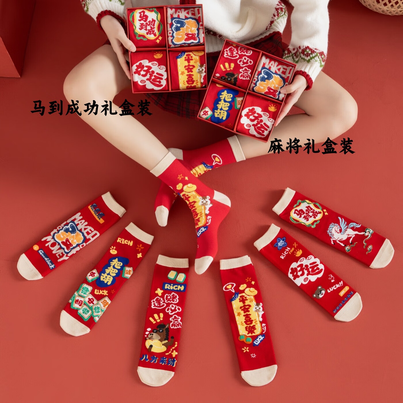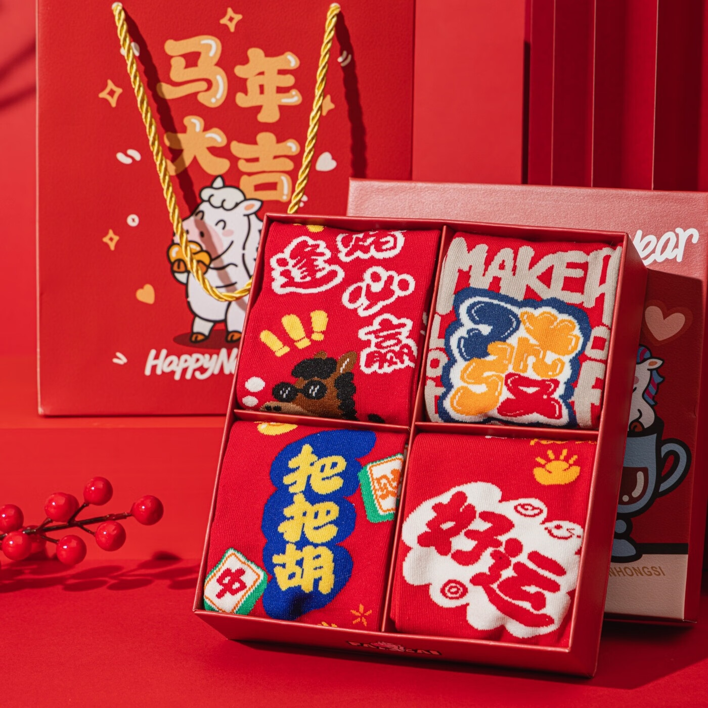 相于中马年本命年大红新年袜子男女中筒鸿运袜男女送礼礼盒秋冬中筒袜子 本村首富款 礼盒装 4双