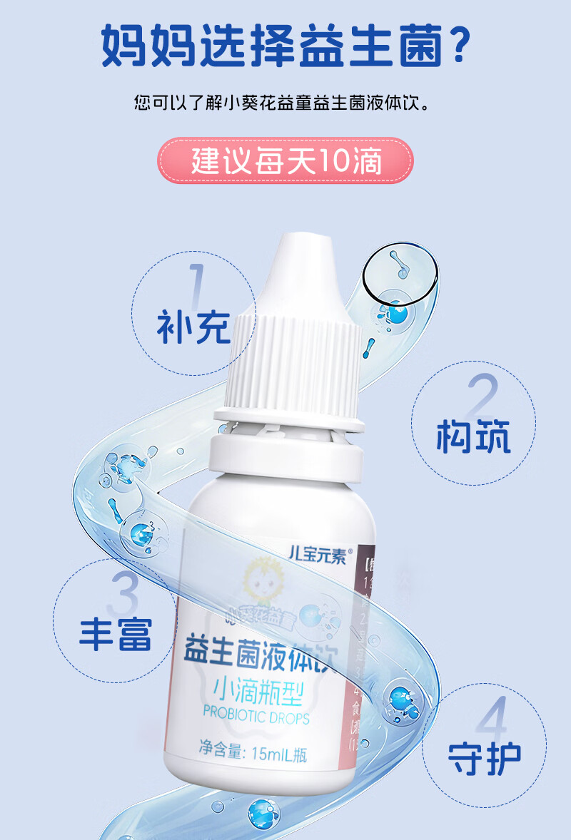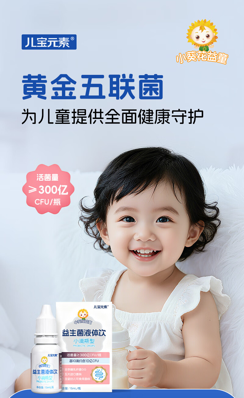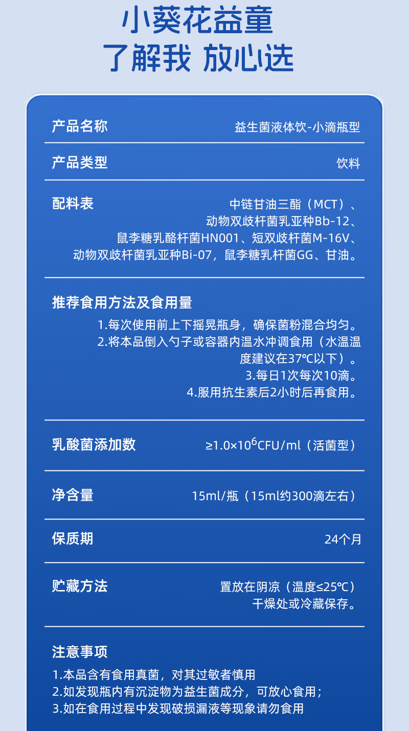 小葵花益童益生菌液体饮15ml儿童滴剂进口活菌鼠李糖乳杆菌动物双歧杆菌Bb12 15ml*3盒 【赠1盒益生菌粉】