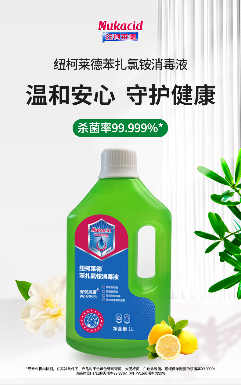 纽柯莱德苯扎氯铵消毒液 灭活甲流HPV16型 衣物消毒水除菌除螨家居 1L*1瓶【灭活HPV16型】
