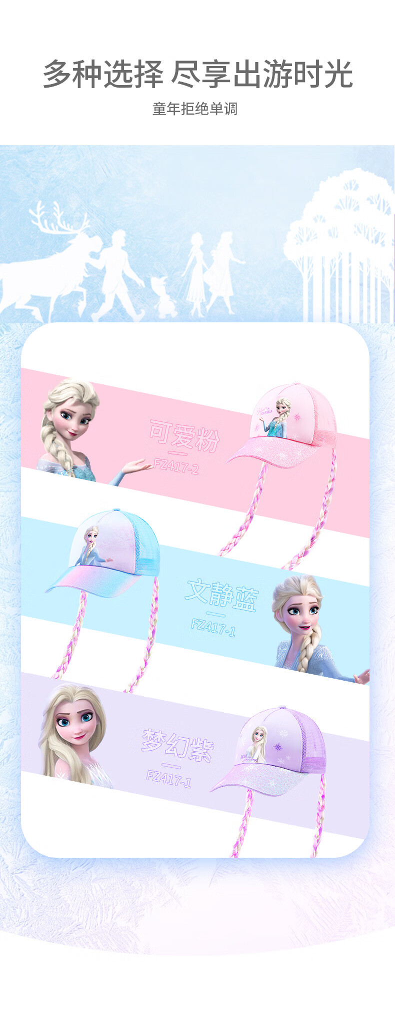 迪士尼(Disney)爱莎公主儿童帽子女孩夏季女童2025新款辫子帽鸭舌帽遮阳帽帽 【艾莎公主】辫子帽紫色 适合3以上