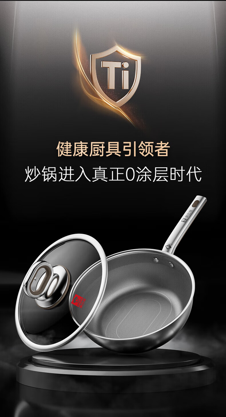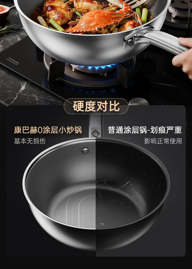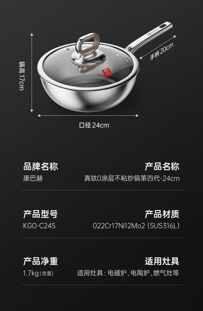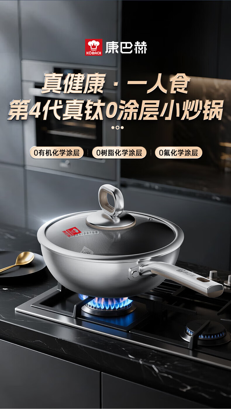 康巴赫第四代真钛0涂层不粘锅仿生小炒锅煎炒两用平底深煎锅家用锅具 【0涂层】【1人轻食】 24cm