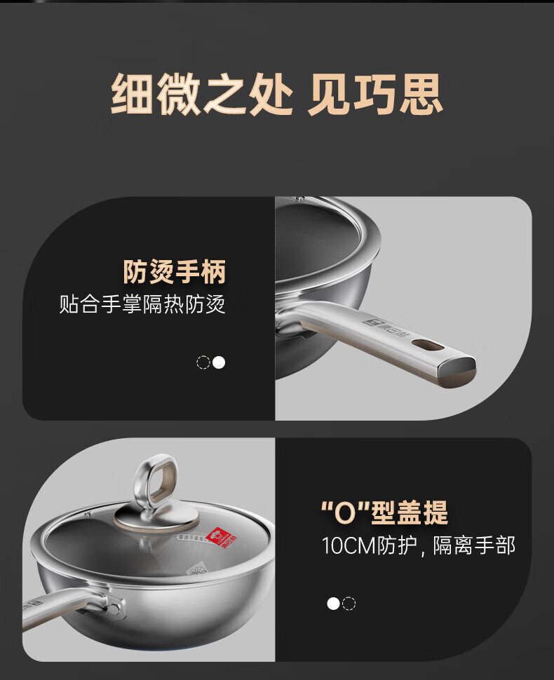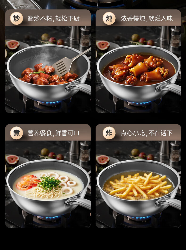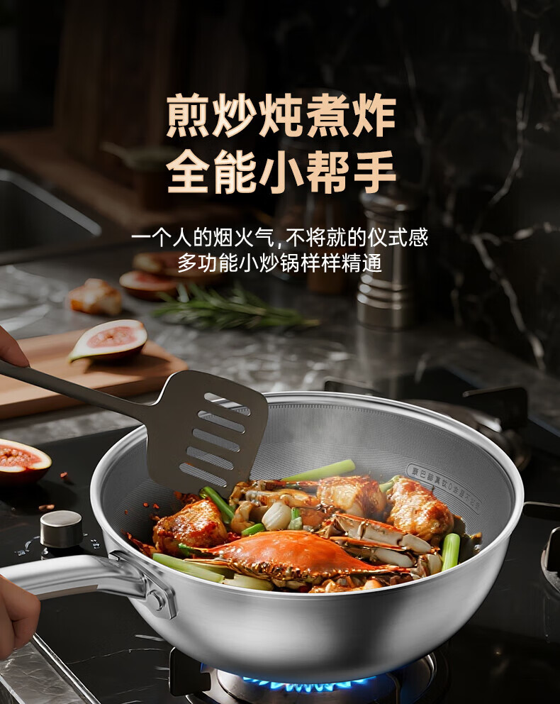 炊大皇 炒锅 304不锈钢炒菜锅煎锅 平底不粘炒锅32cm 可立可视盖不挑灶