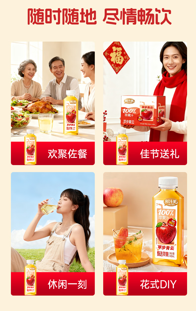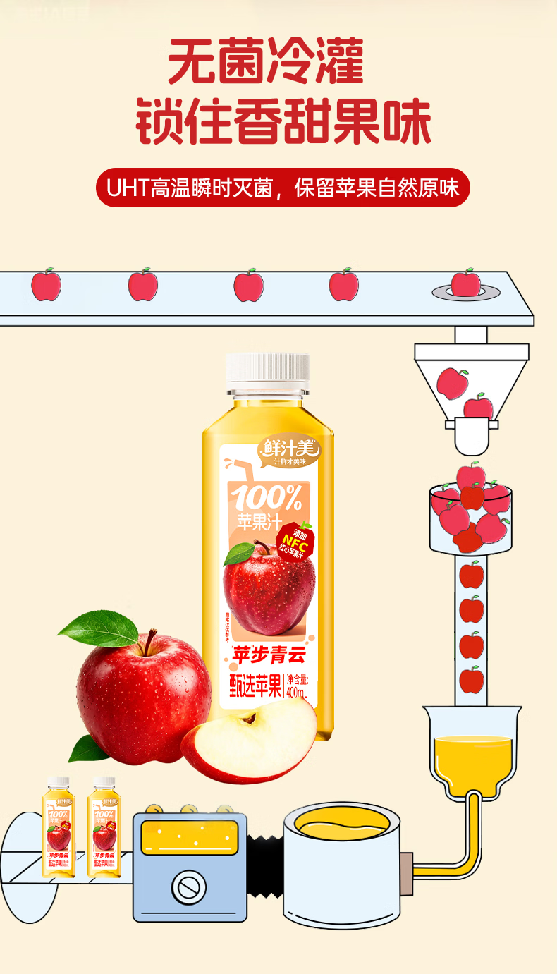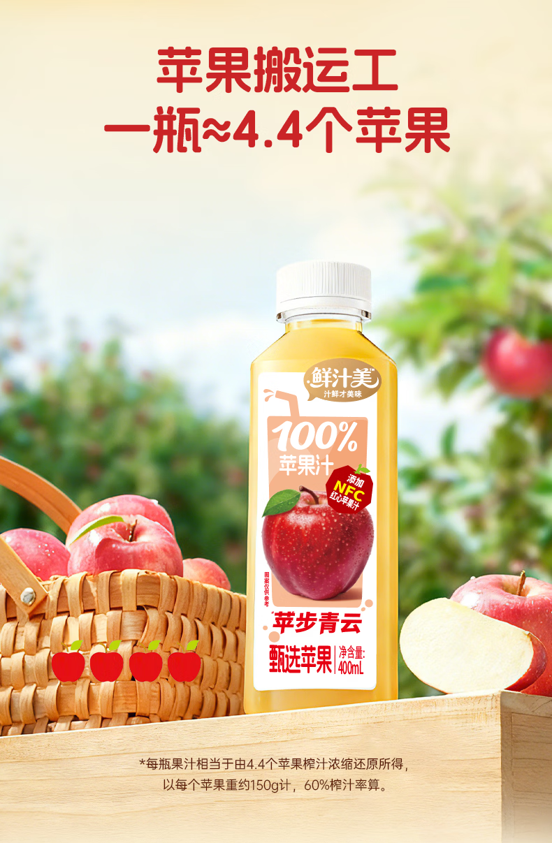 鲜汁美100%果汁含量苹果汁新疆阿克苏NFC红心苹果汁饮料年货饮料礼盒 100%果汁含量苹果汁400ml*6瓶