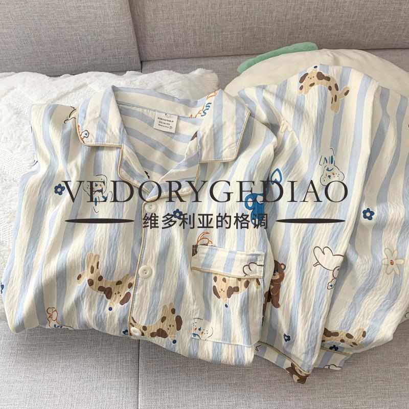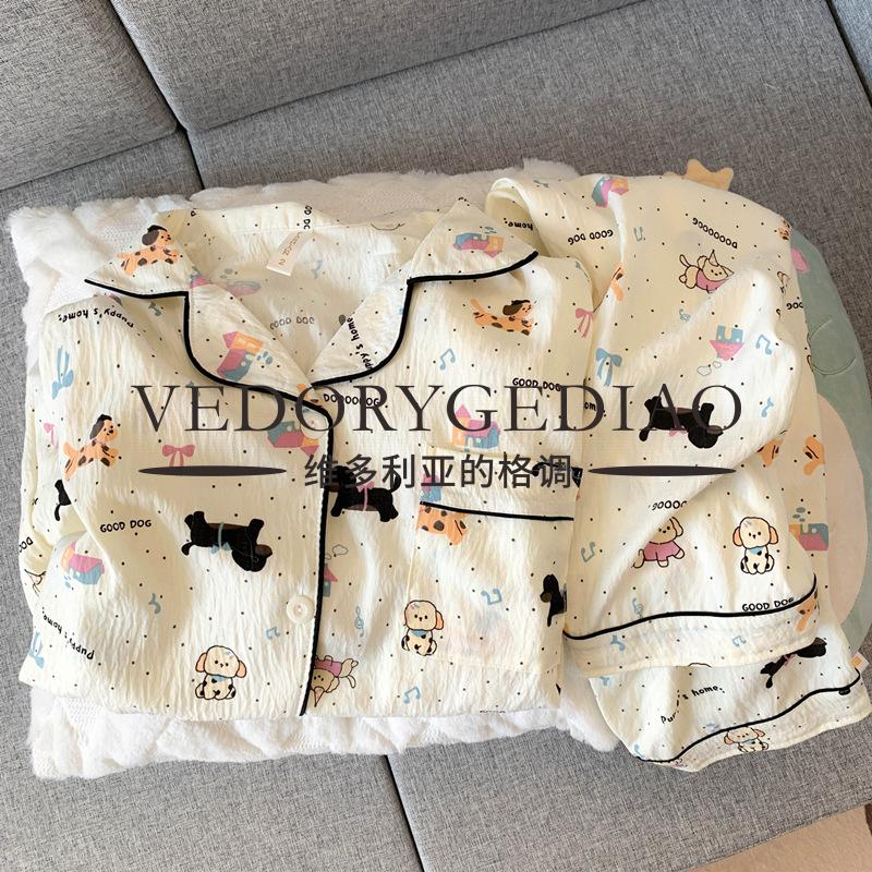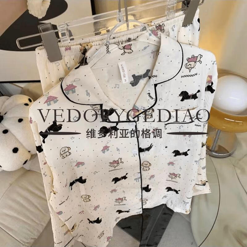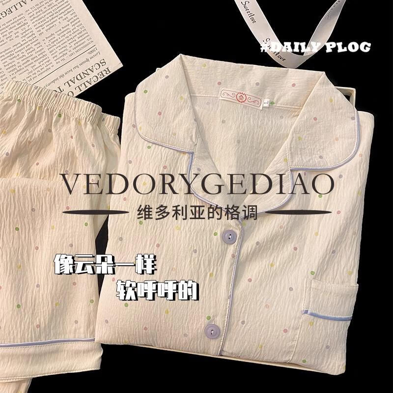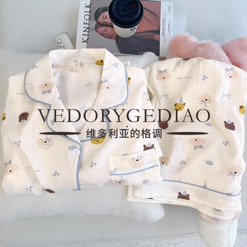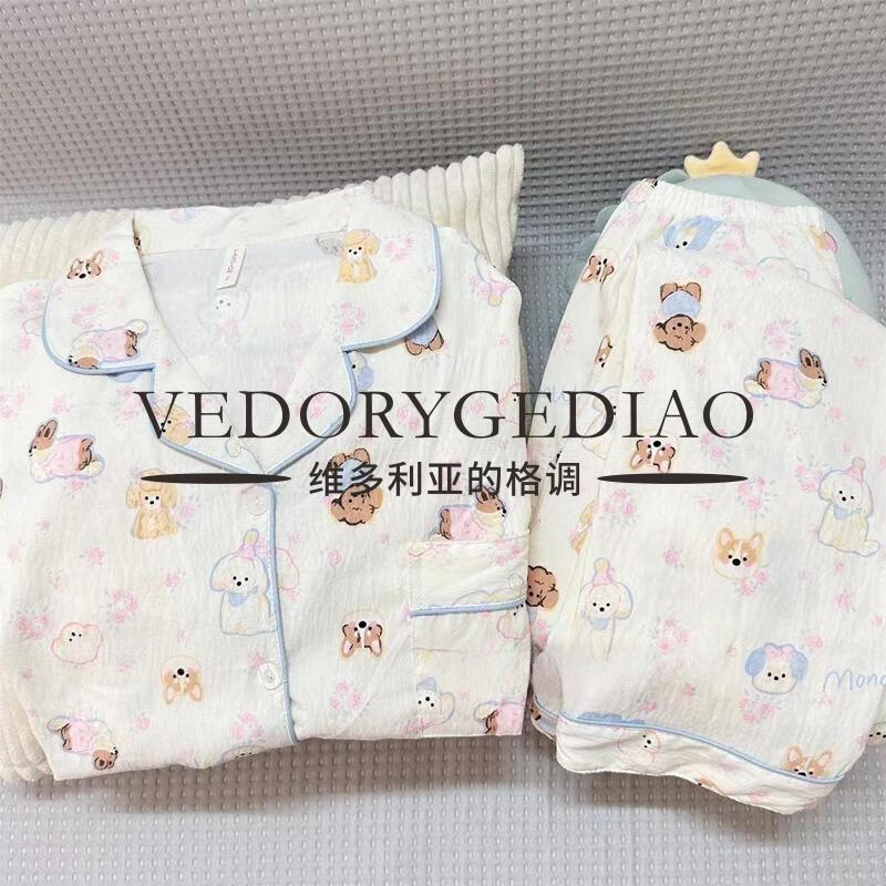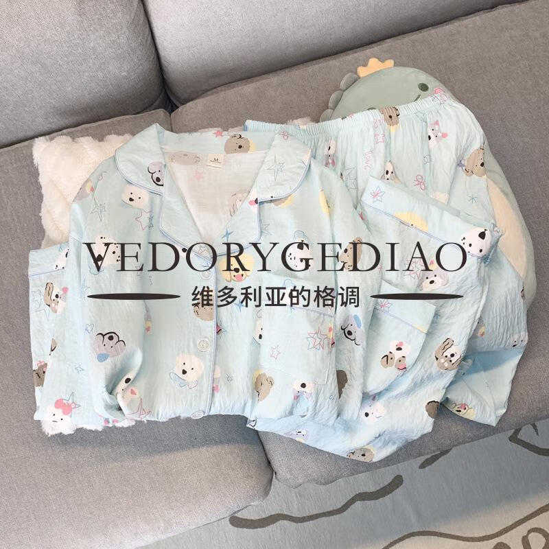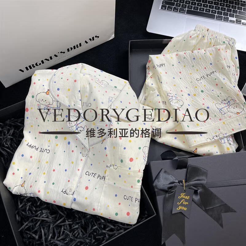 维多利亚的格调可爱小狗睡衣女春秋款云朵棉纱2025年新款开衫夏季家居服套装 云朵棉-J1810#彩色波点蓝边 M 【建议75-100斤】