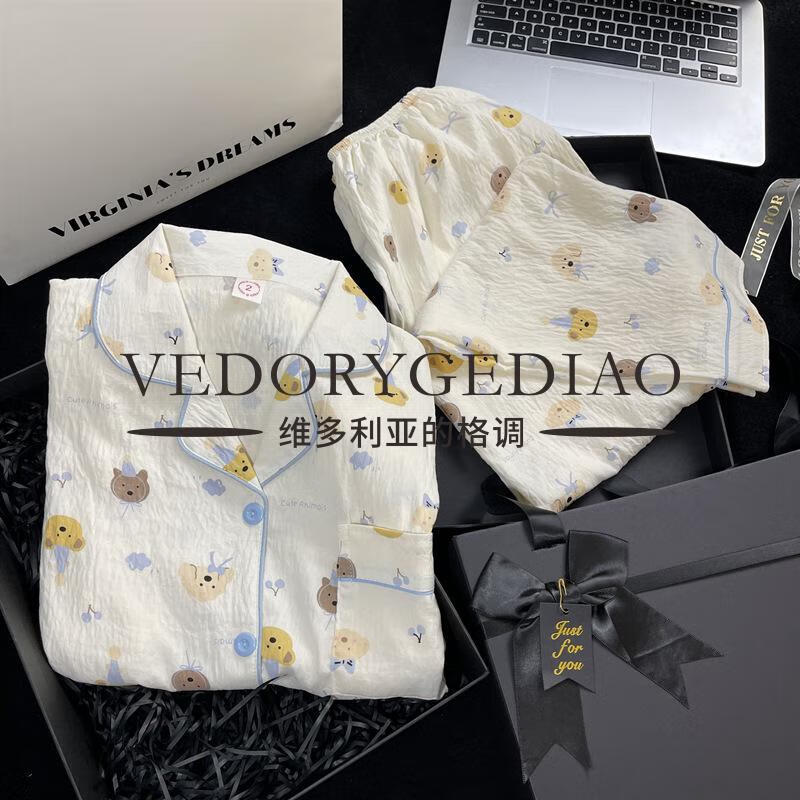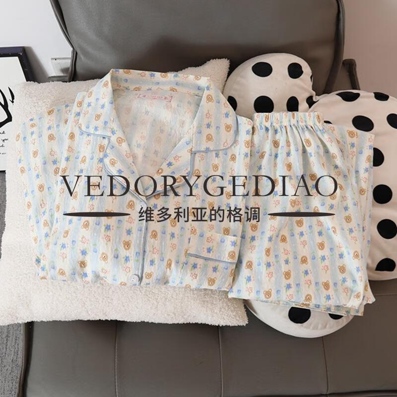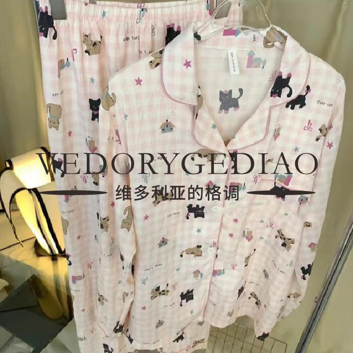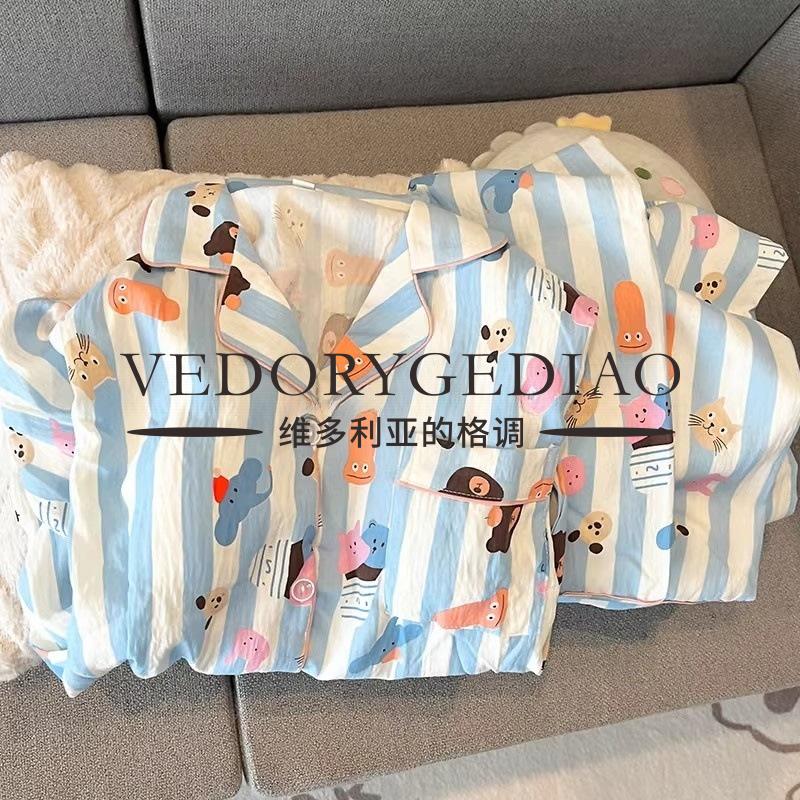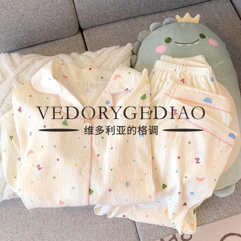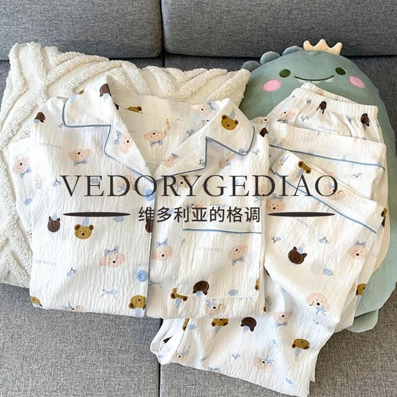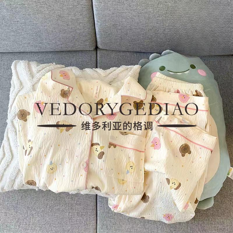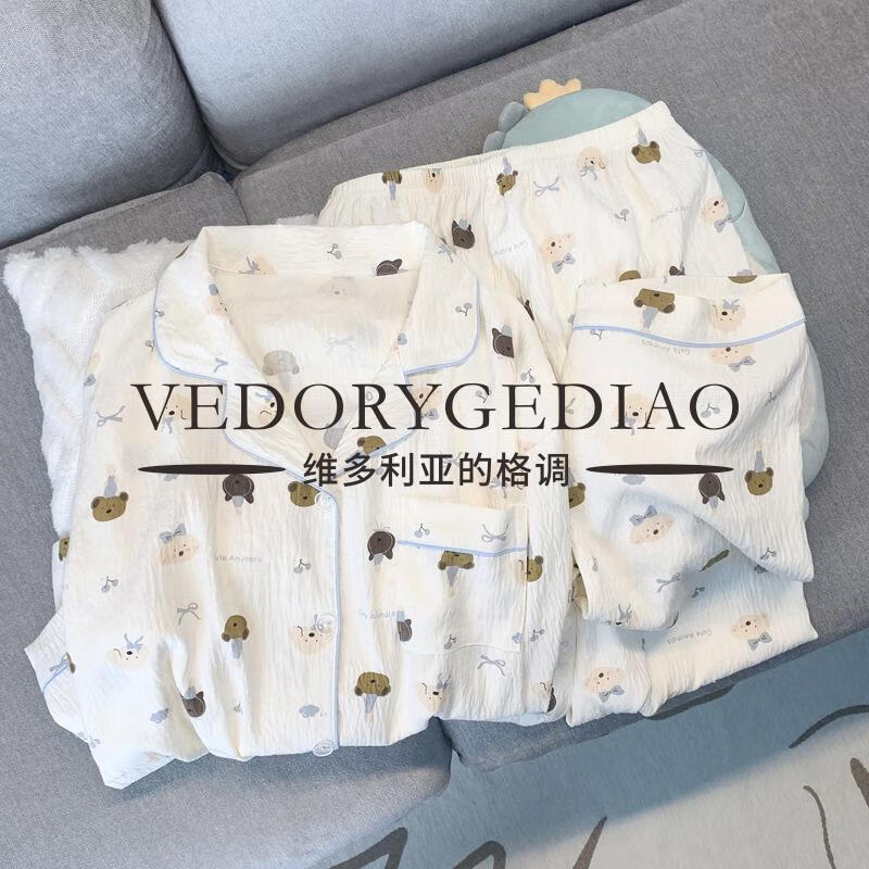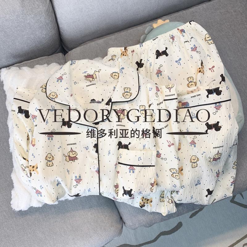 维多利亚的格调可爱小狗睡衣女春秋款云朵棉纱2025年新款开衫夏季家居服套装 云朵棉-J1810#彩色波点蓝边 M 【建议75-100斤】