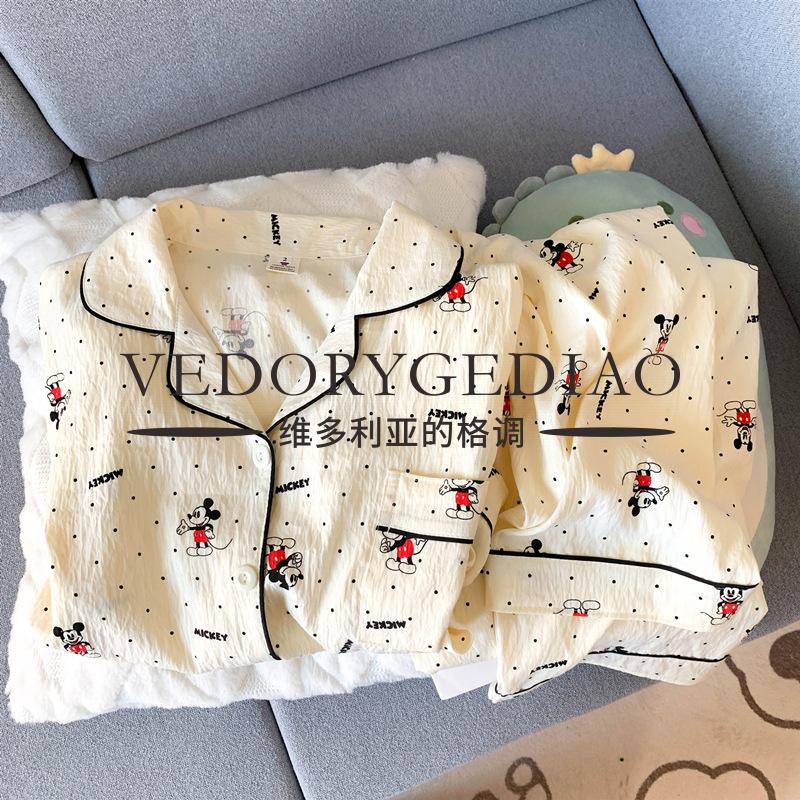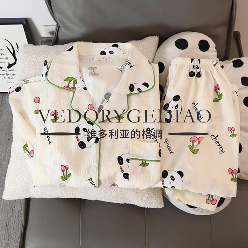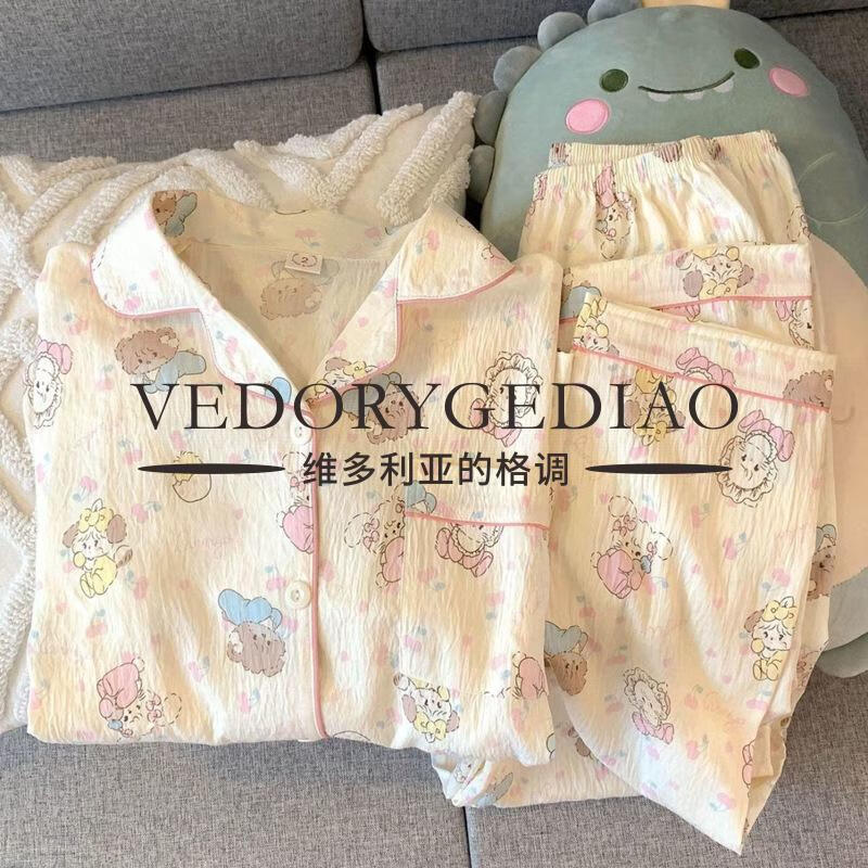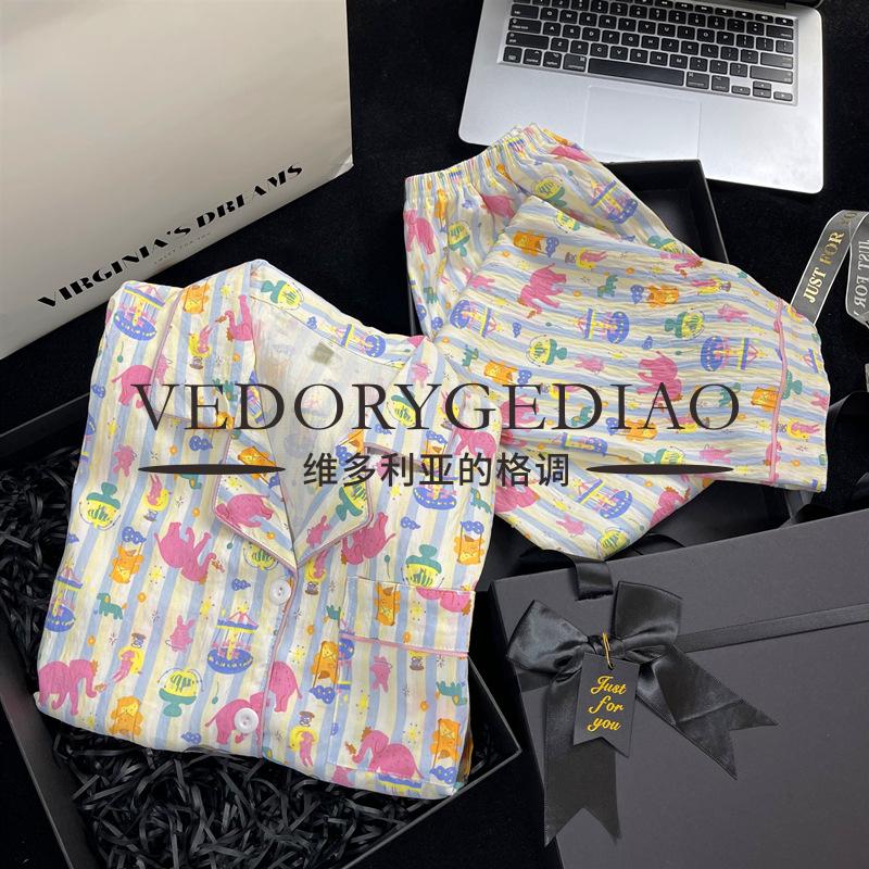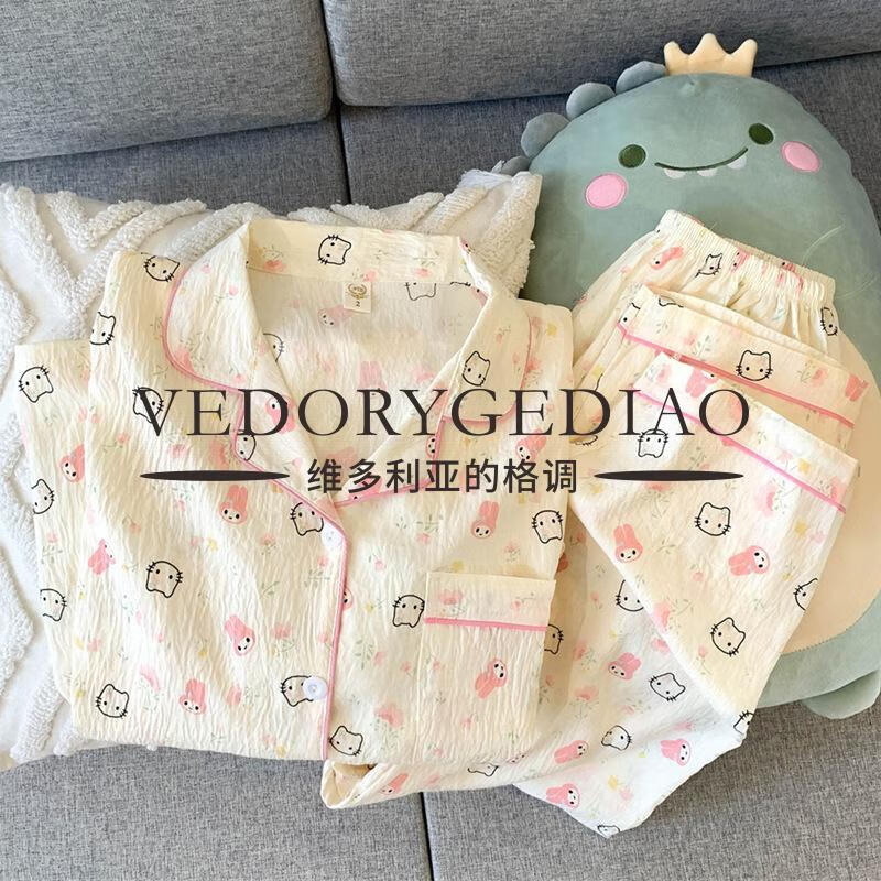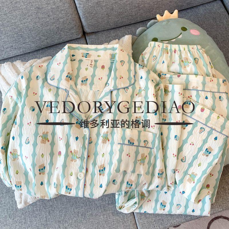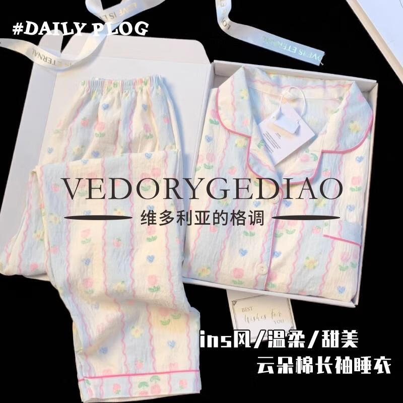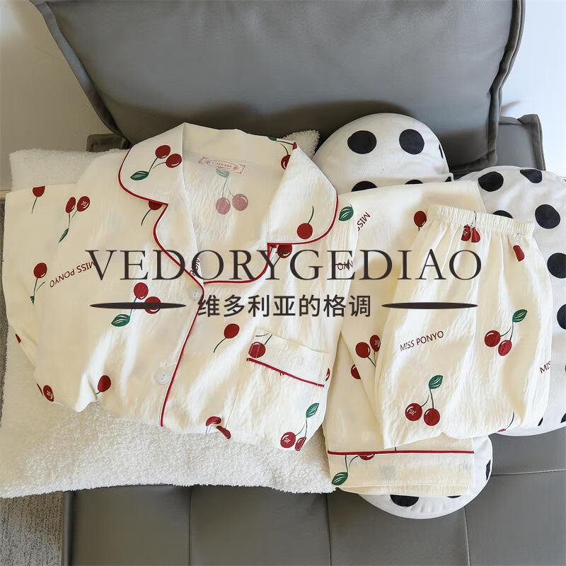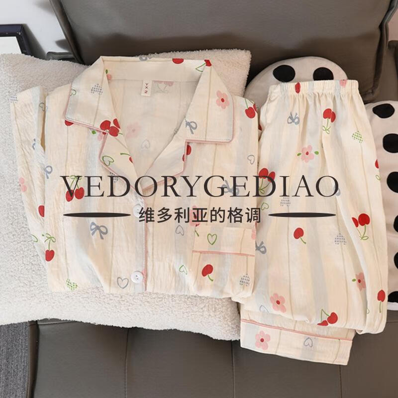 维多利亚的格调可爱小狗睡衣女春秋款云朵棉纱2025年新款开衫夏季家居服套装 云朵棉-J1810#彩色波点蓝边 M 【建议75-100斤】