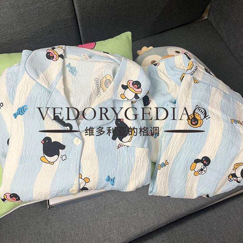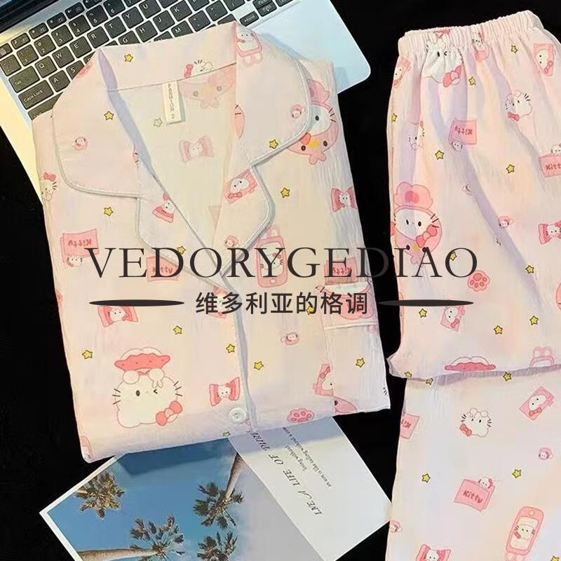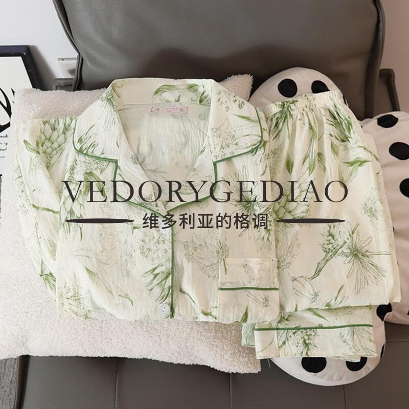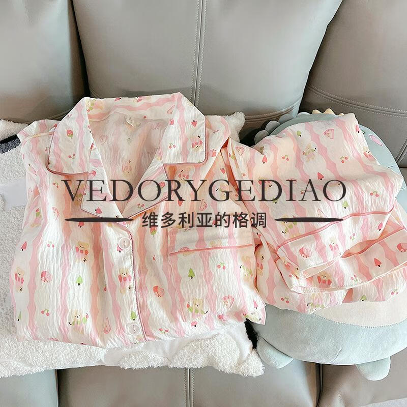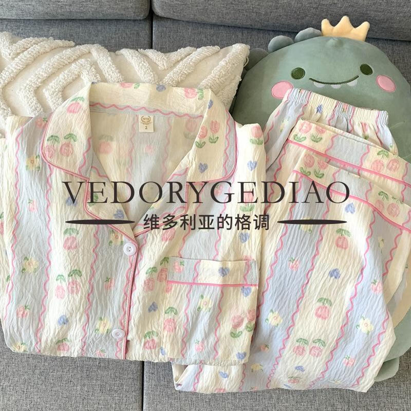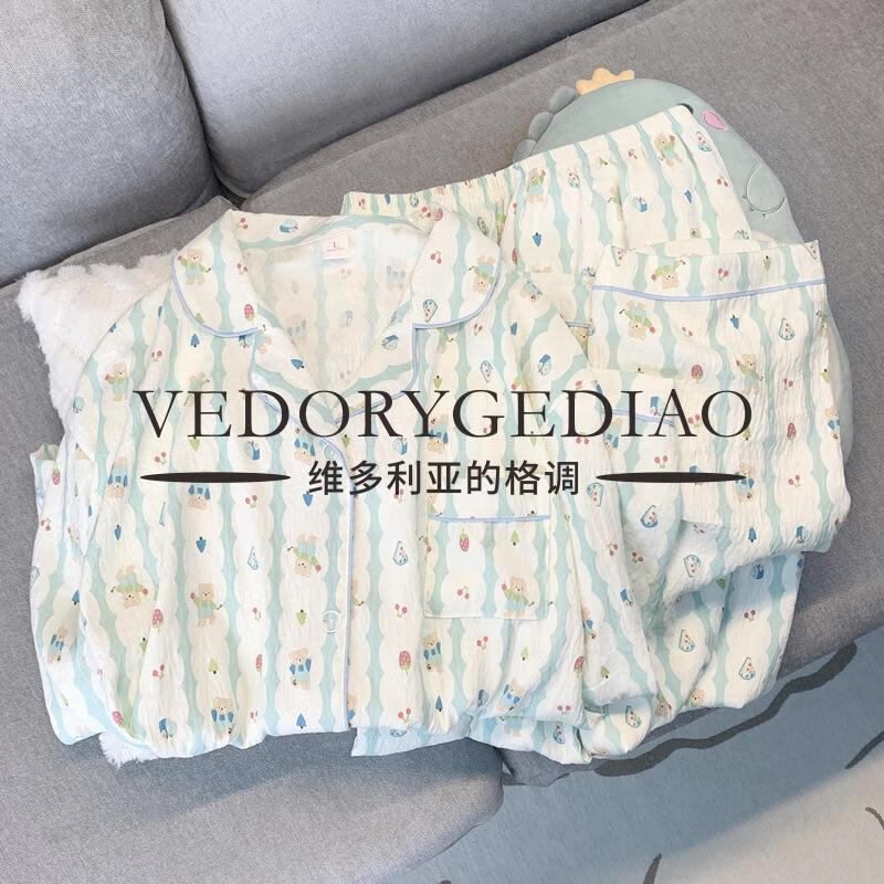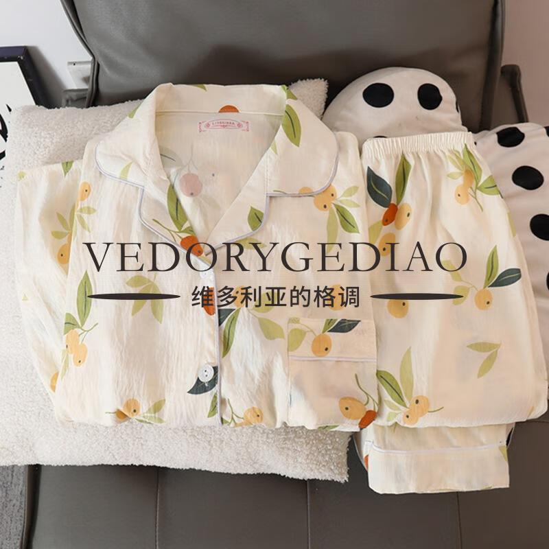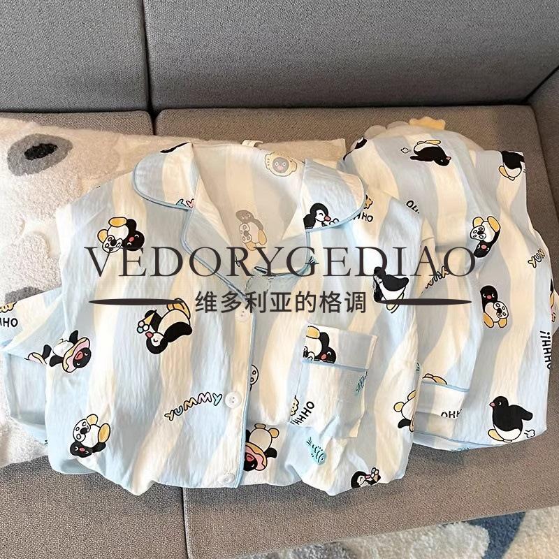 维多利亚的格调可爱小狗睡衣女春秋款云朵棉纱2025年新款开衫夏季家居服套装 云朵棉-J1810#彩色波点蓝边 M 【建议75-100斤】