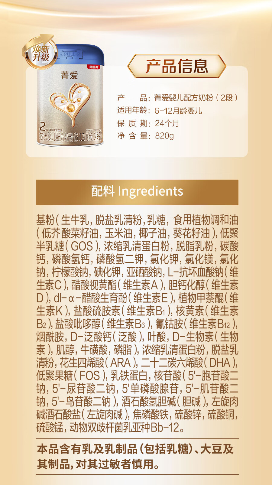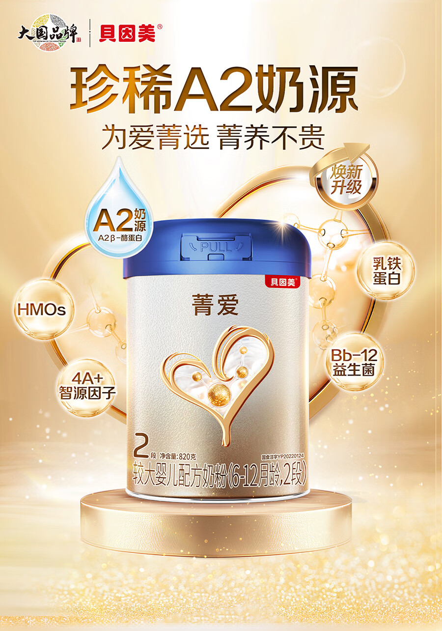 贝因美【焕新】菁爱A2奶源婴儿配方奶粉大罐2段820g含A2-β酪蛋白