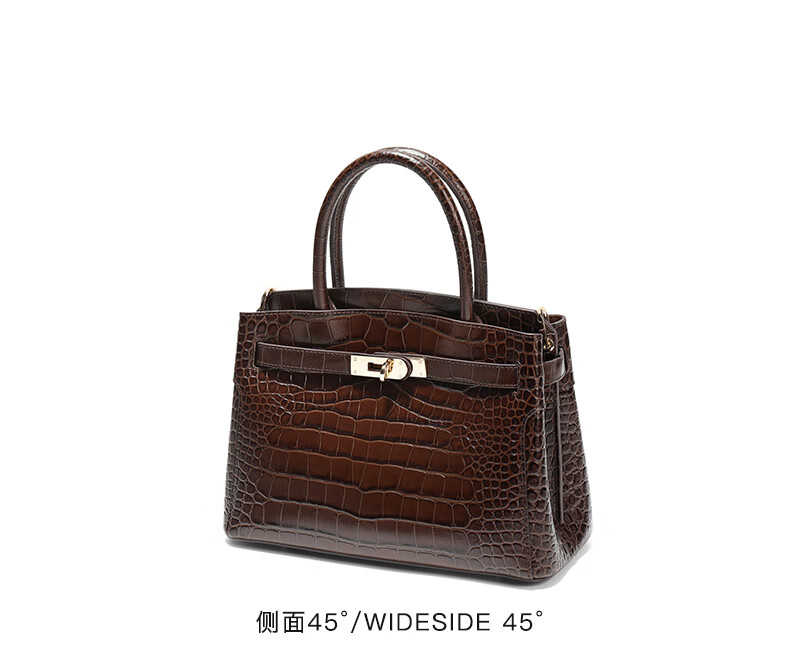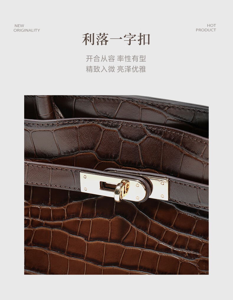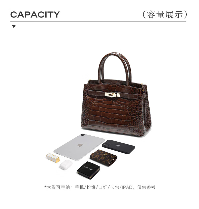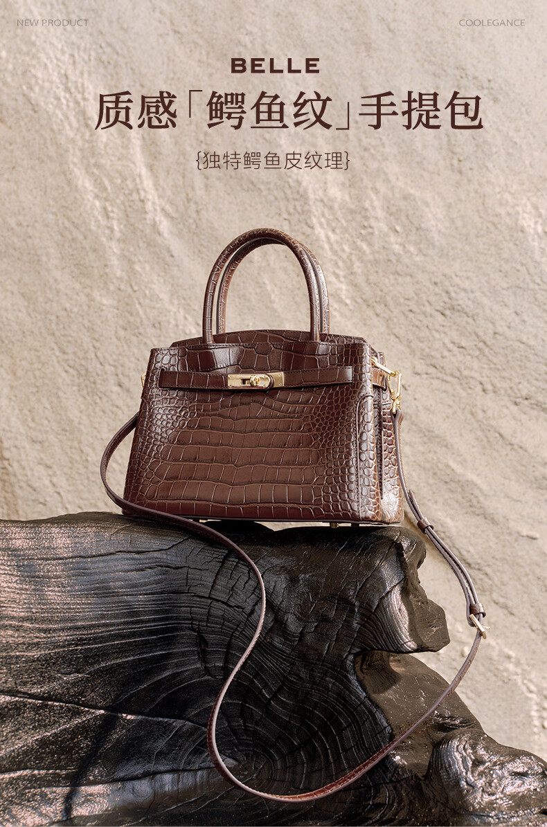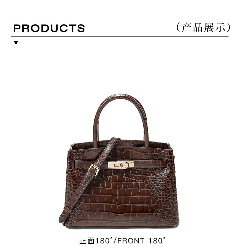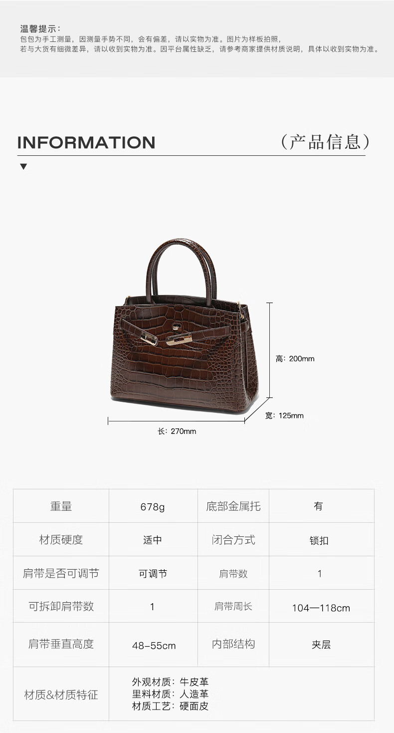 百丽包女25新鳄鱼纹头层牛皮革通勤铂金包单肩斜挎手提包X7429DX5 啡色 F