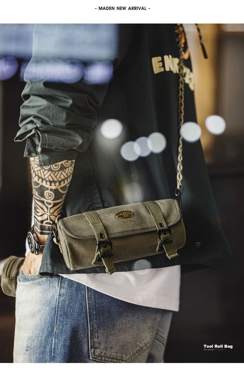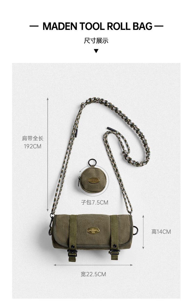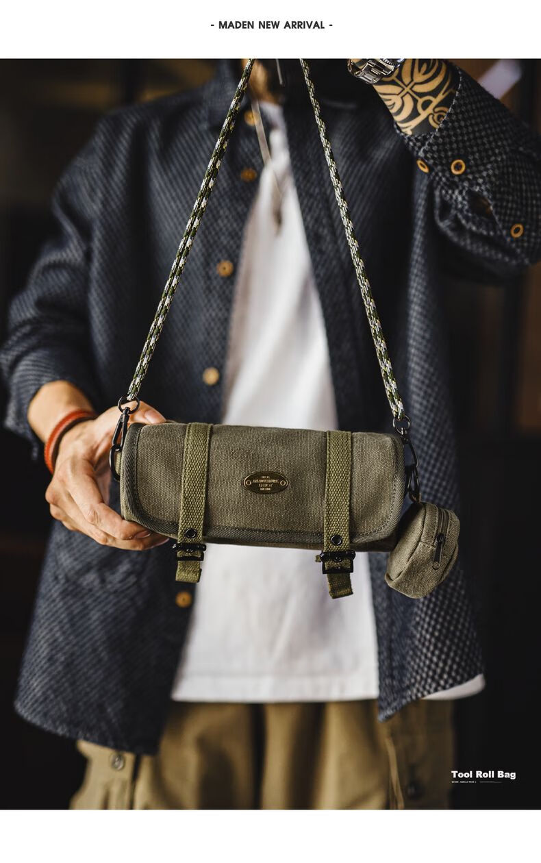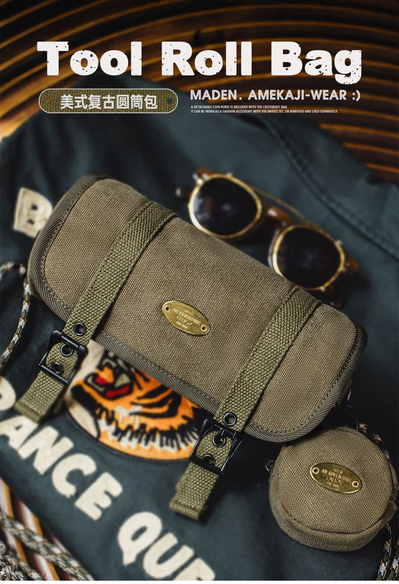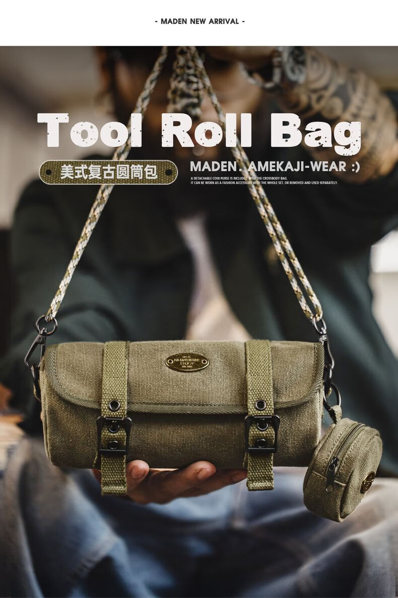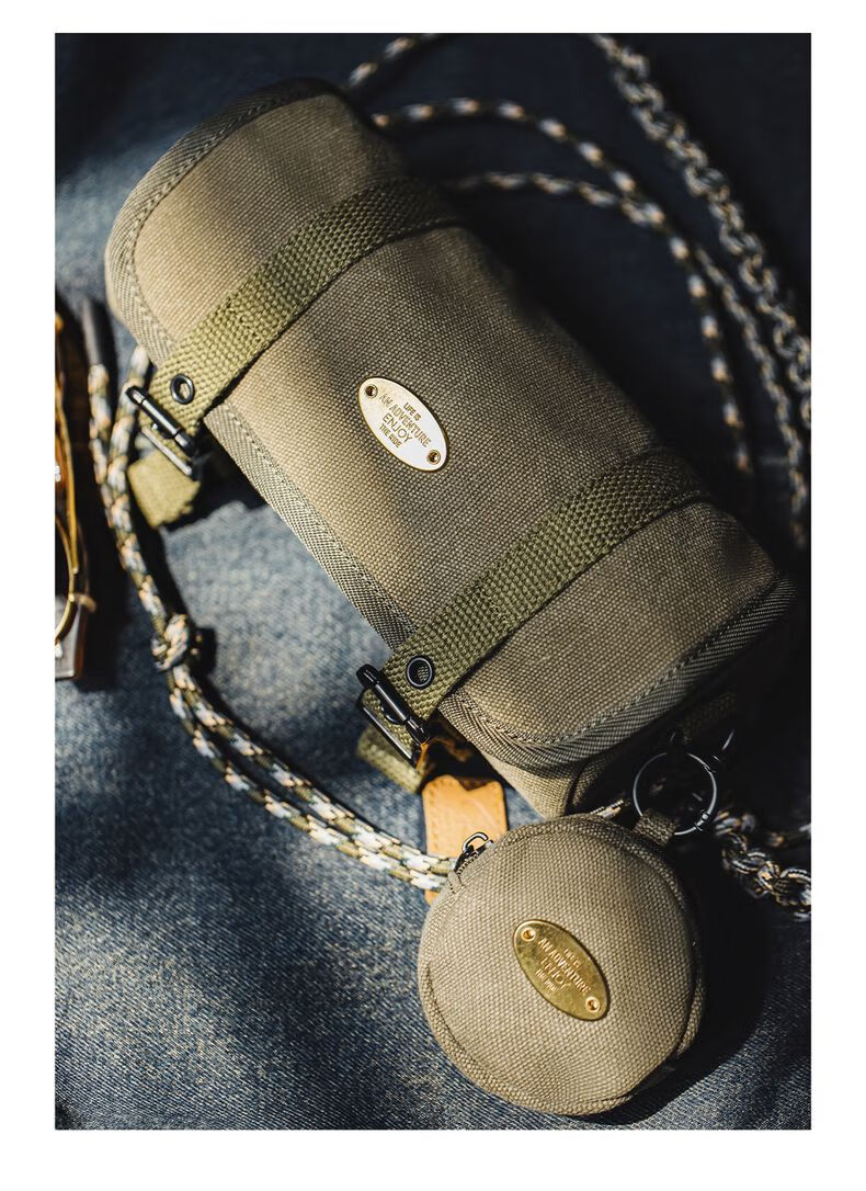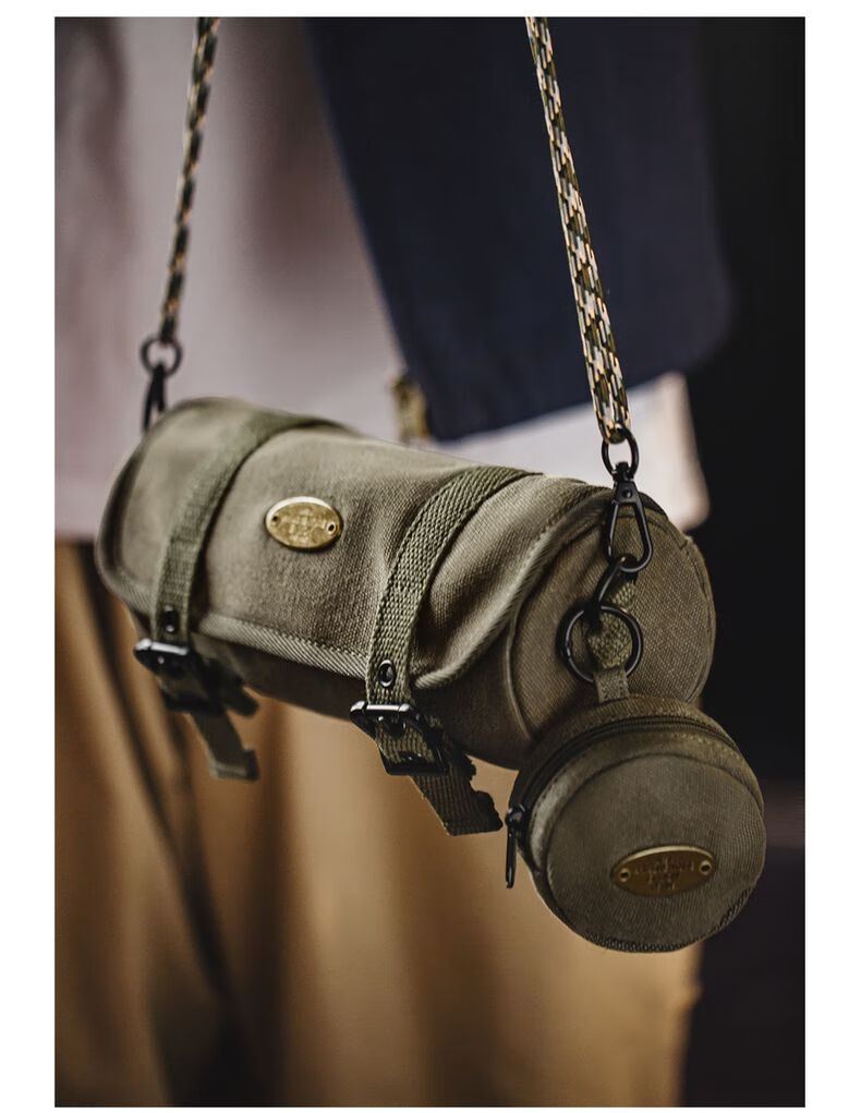 马登工装全棉帆布圆筒包通勤百搭斜挎包时尚子母零钱包男款单肩包 苔藓绿 (22.5cm x 14cm)