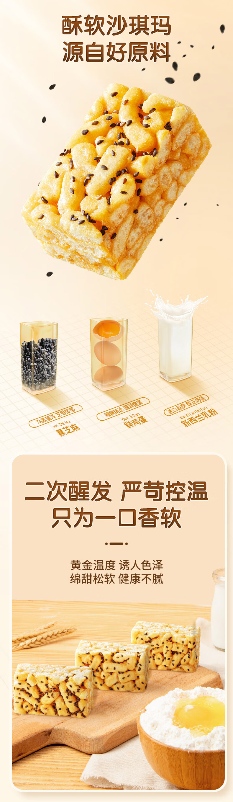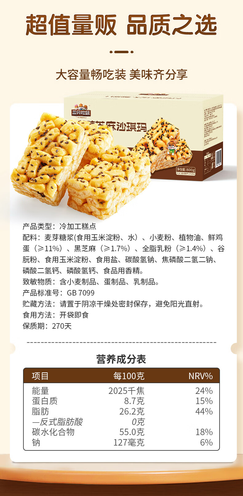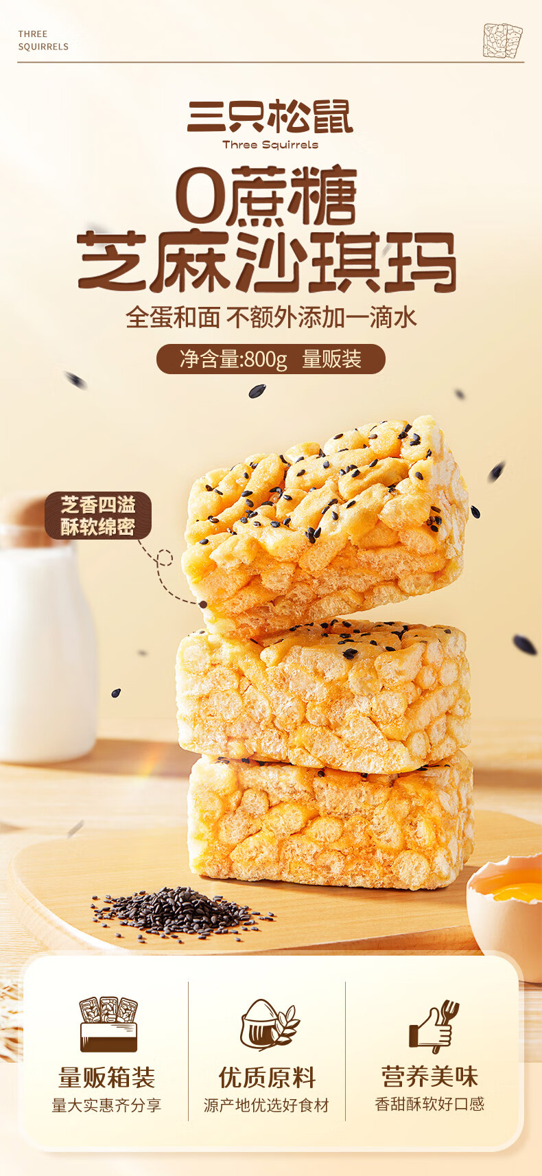 三只松鼠0蔗糖芝麻沙琪玛800g 早餐代餐中式糕点点心休闲零食整箱