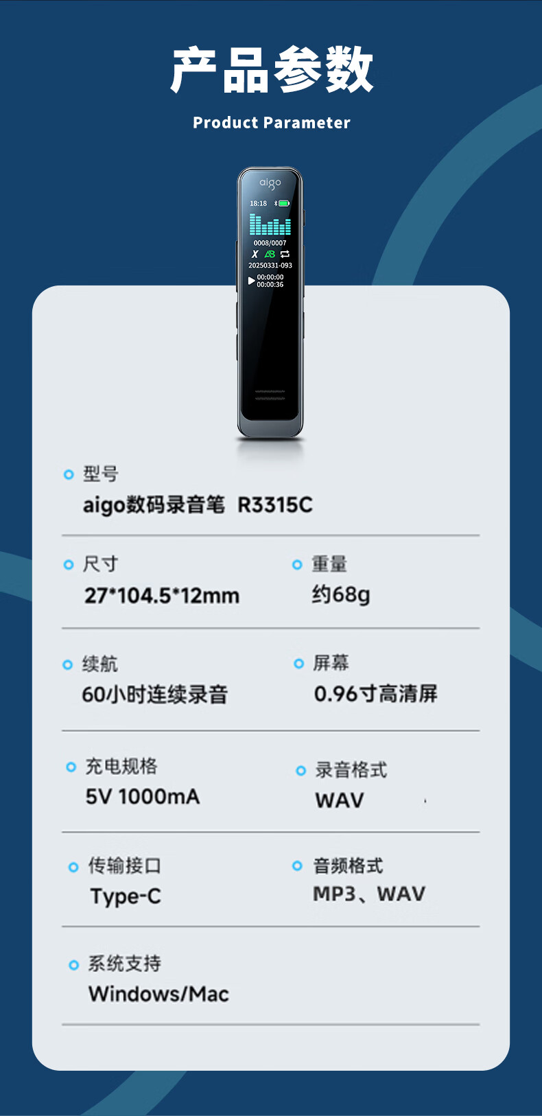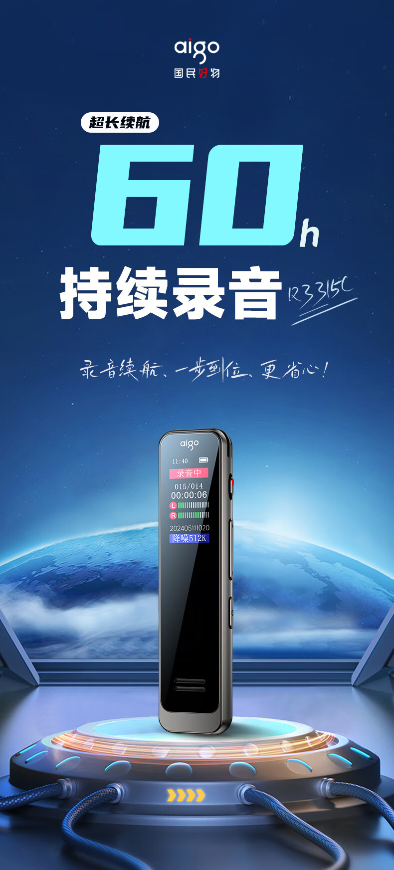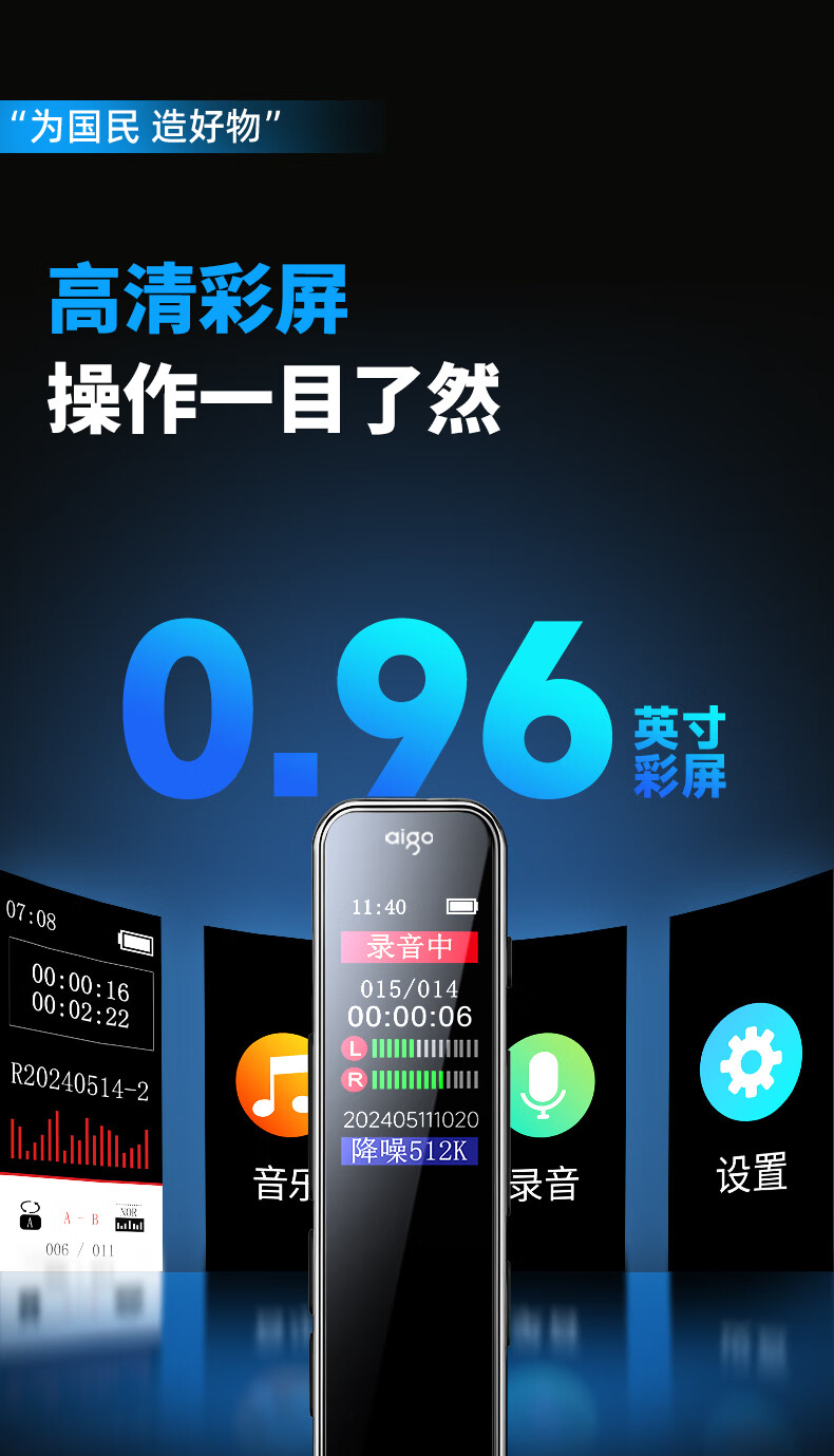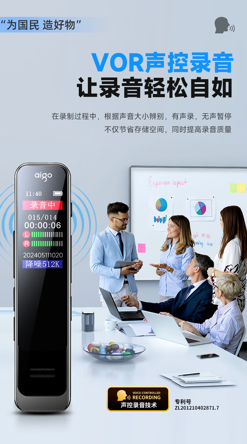 爱国者(aigo)录音笔60小时超长待机R3315C 128G大内存专业录音器高清降噪学习培训商务会议采访 MP3播放