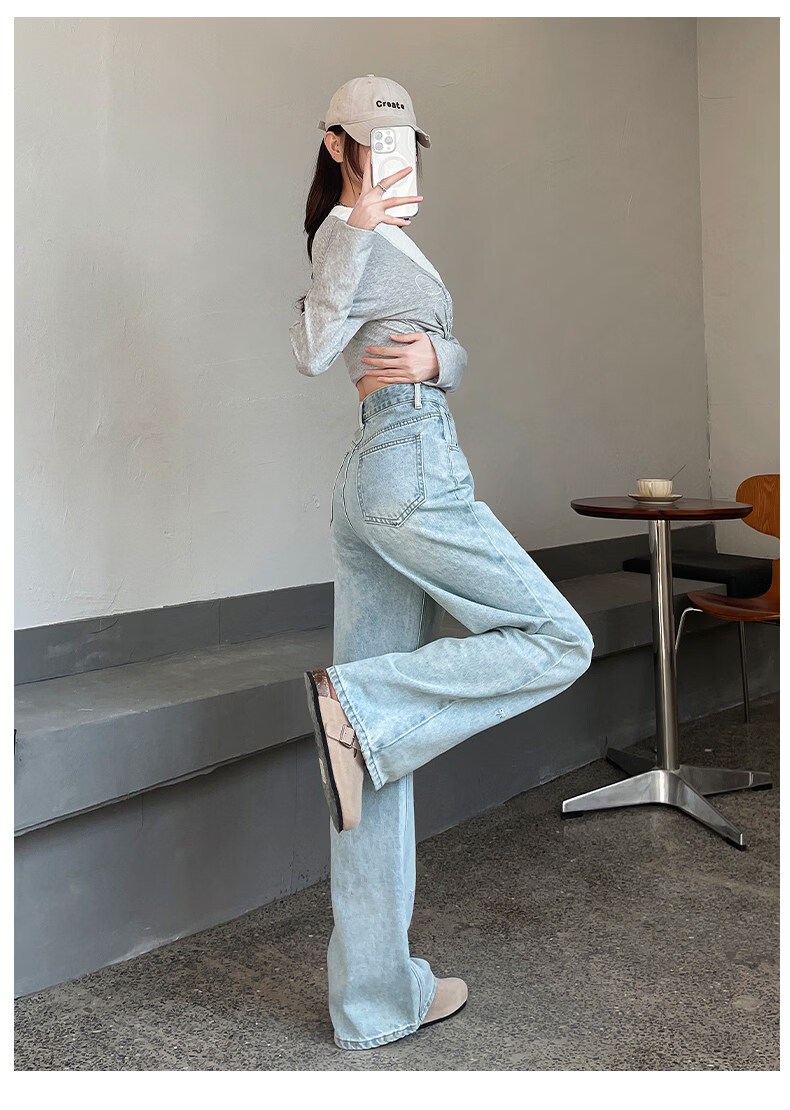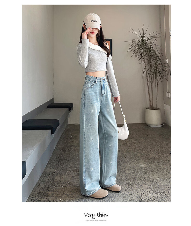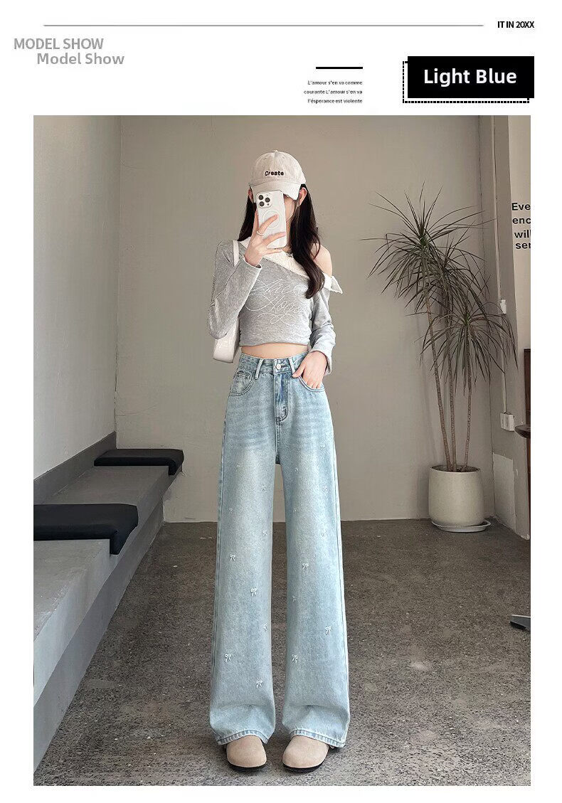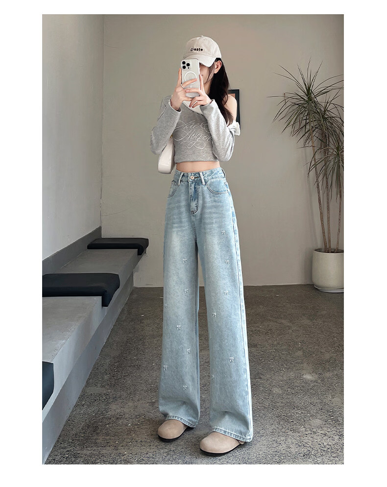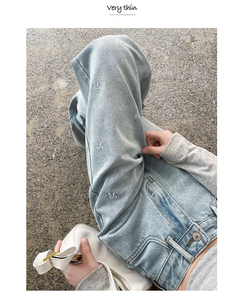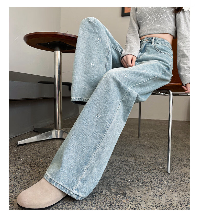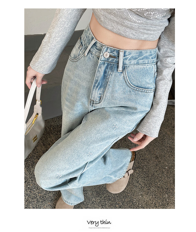 MODX绣花阔腿牛仔裤2026年春季新高腰修身浅色流行窄直筒裤 浅蓝色【长裤】 XS