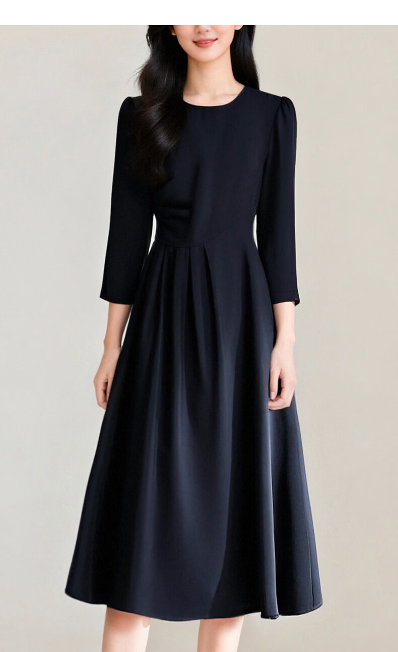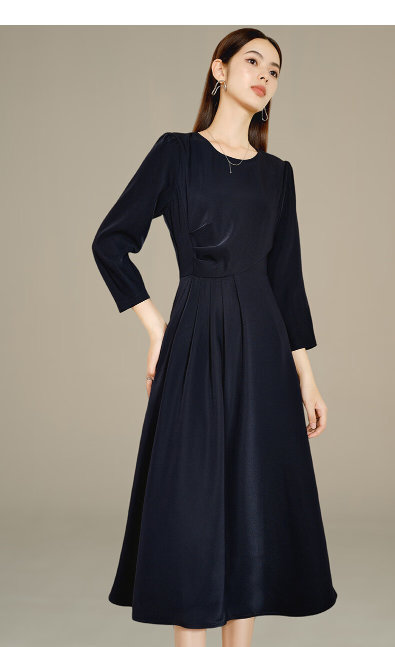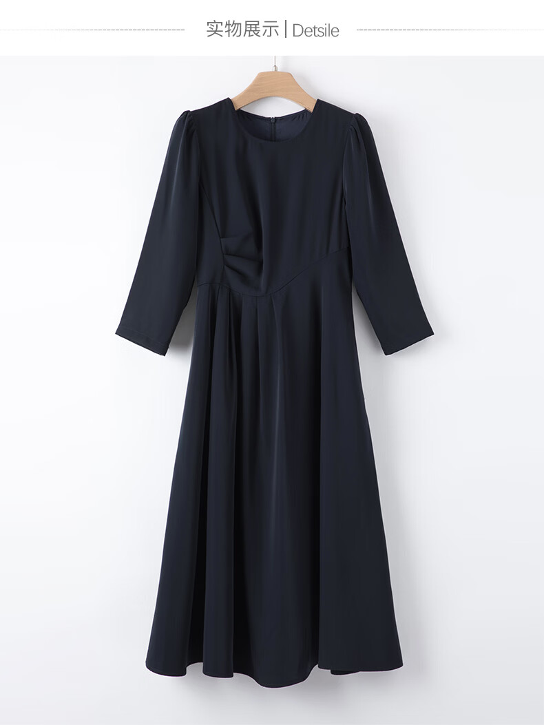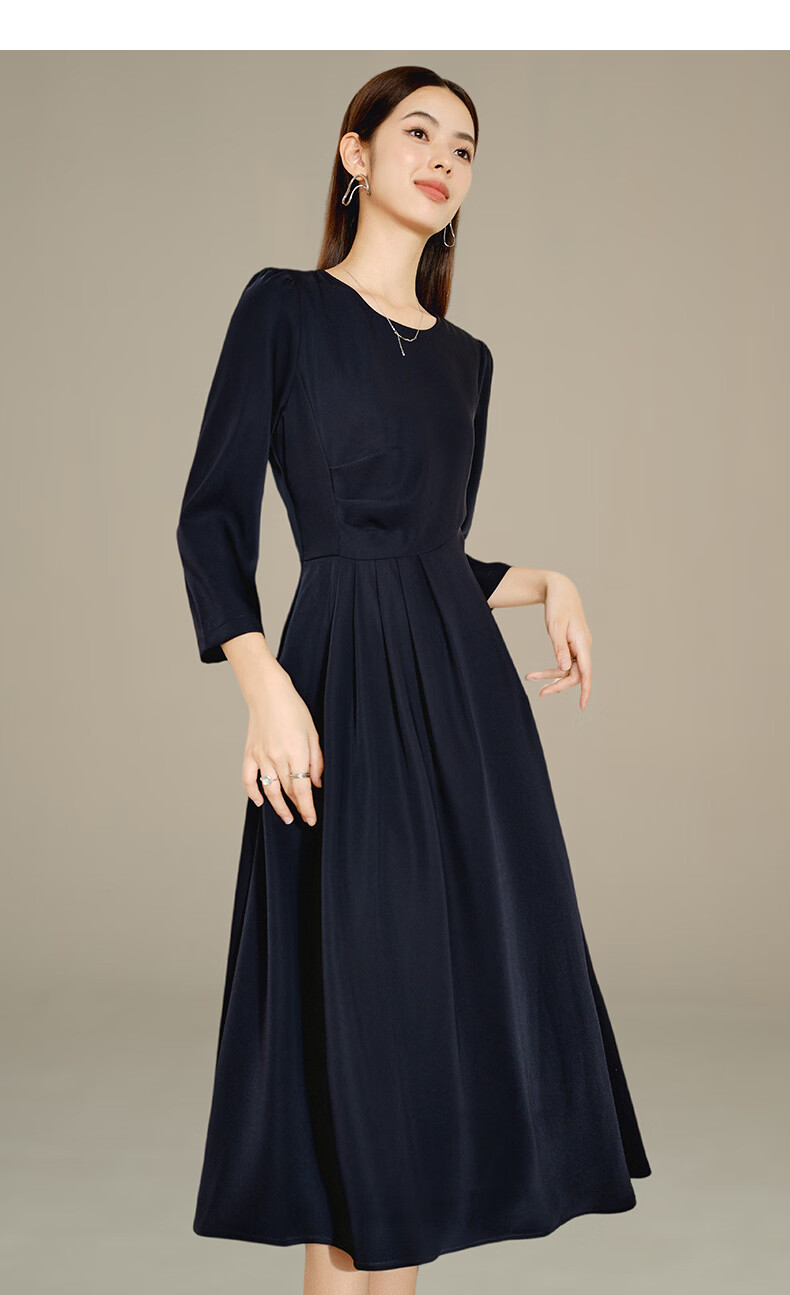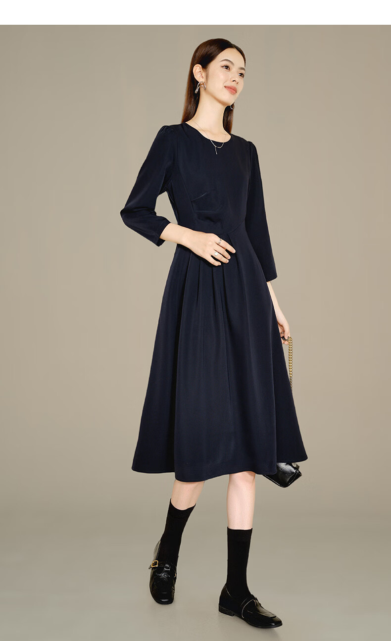 晚白【新品】2026春款知性轻熟风中袖裙子收腰显瘦气质通勤连衣裙 深蓝色 L