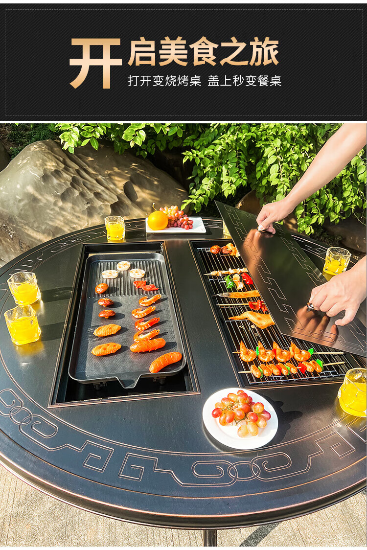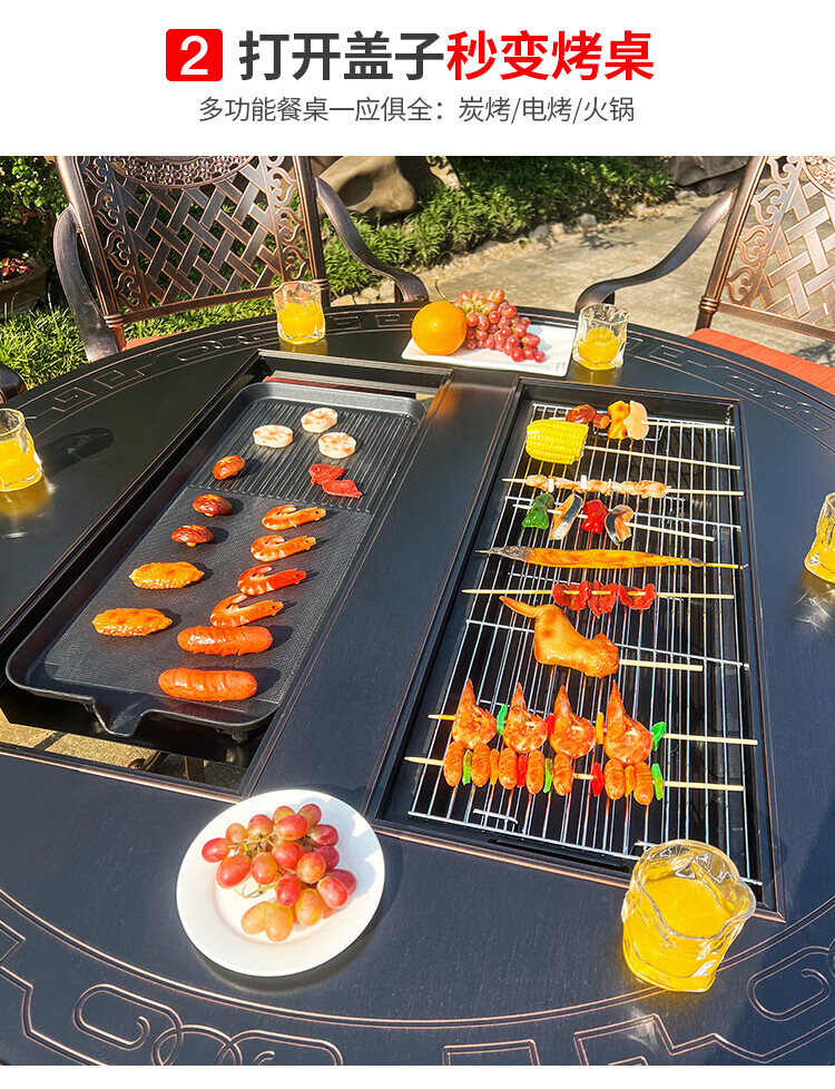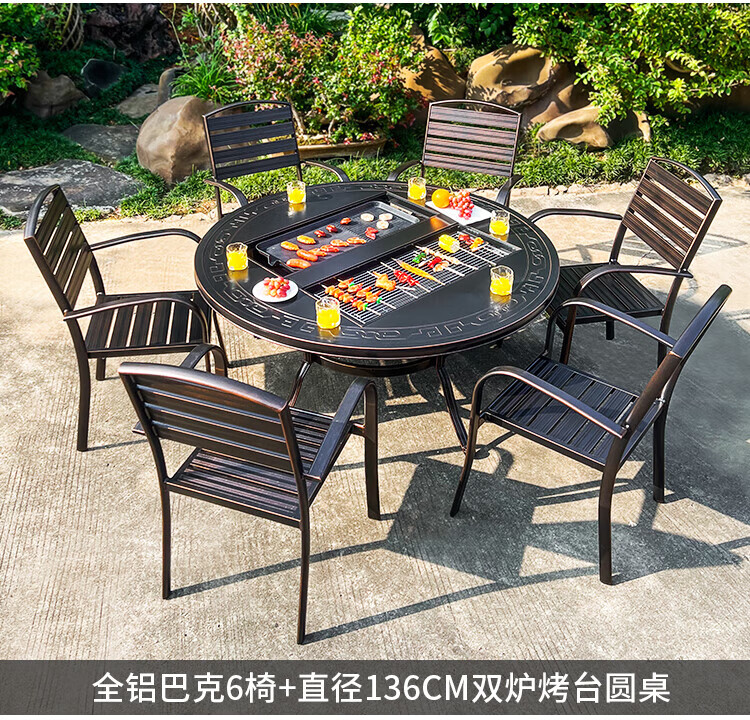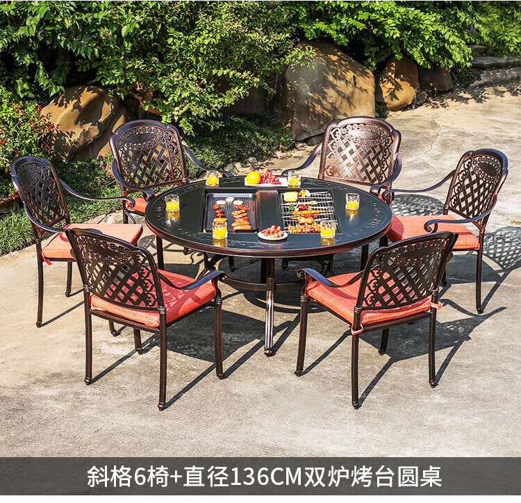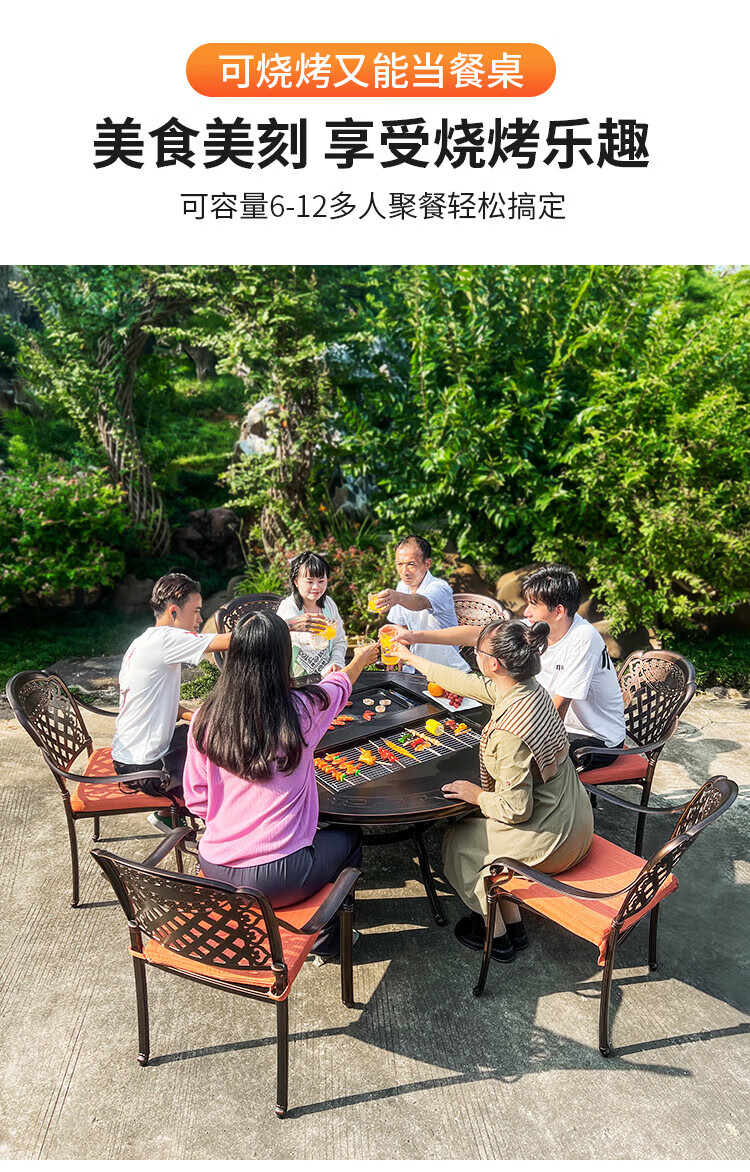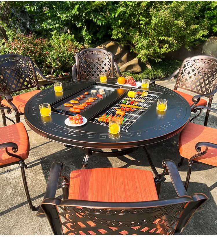 gosoo户外桌椅庭院别墅围炉煮茶餐桌烧烤桌电烤火锅铸铝6椅136cm双炉桌