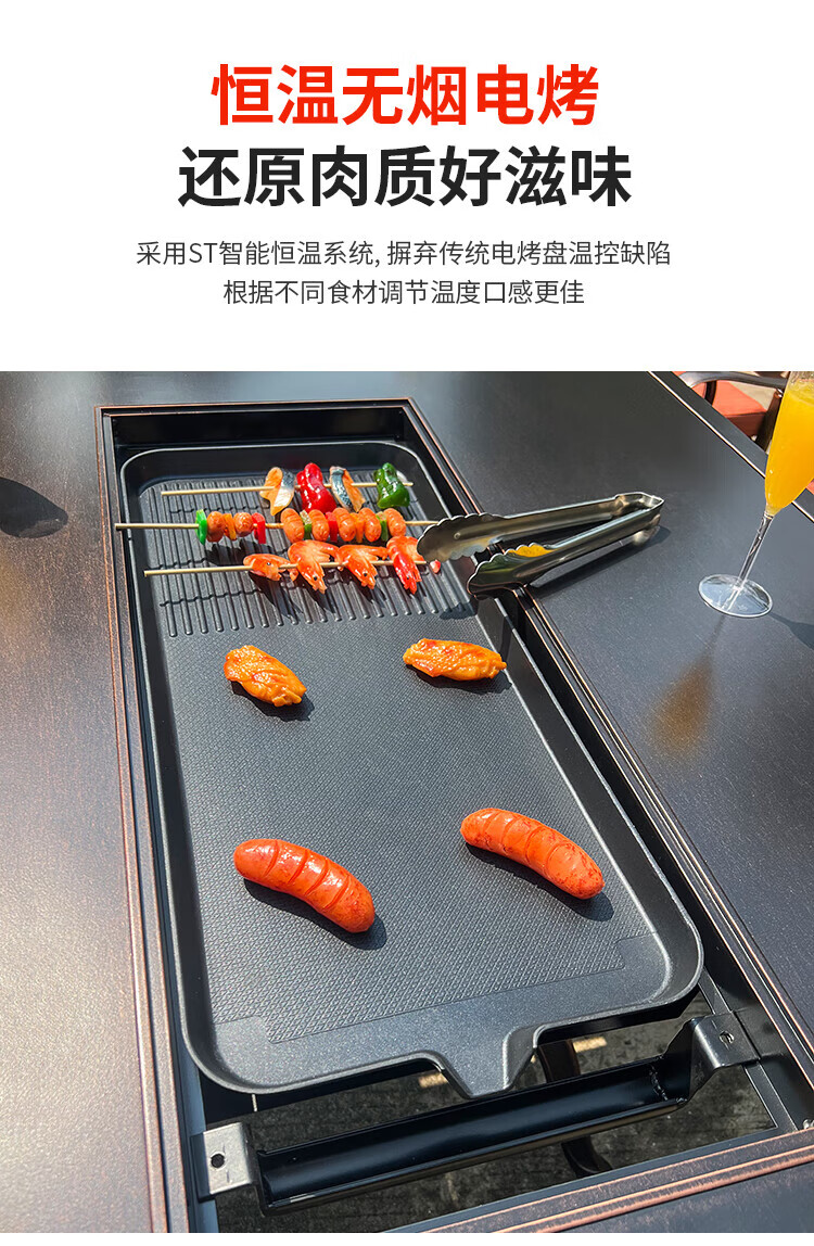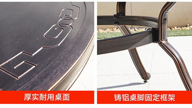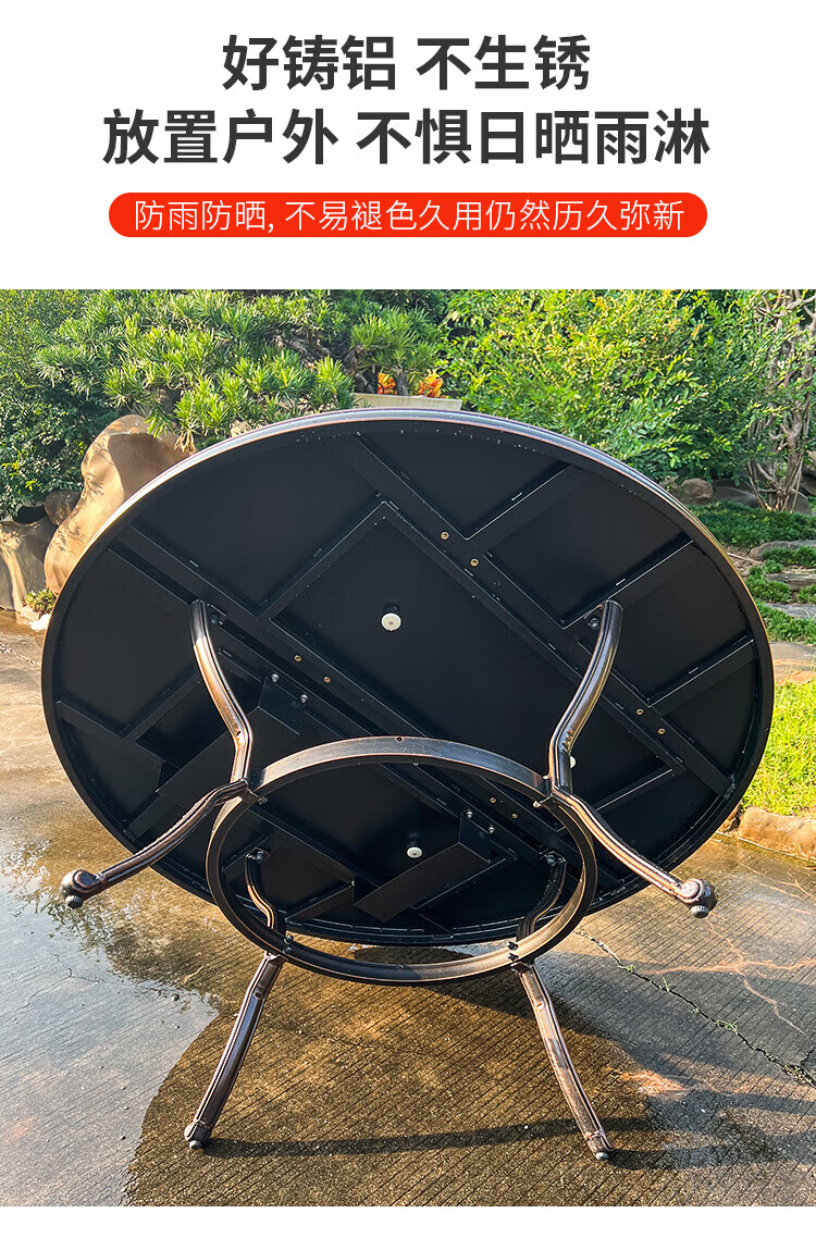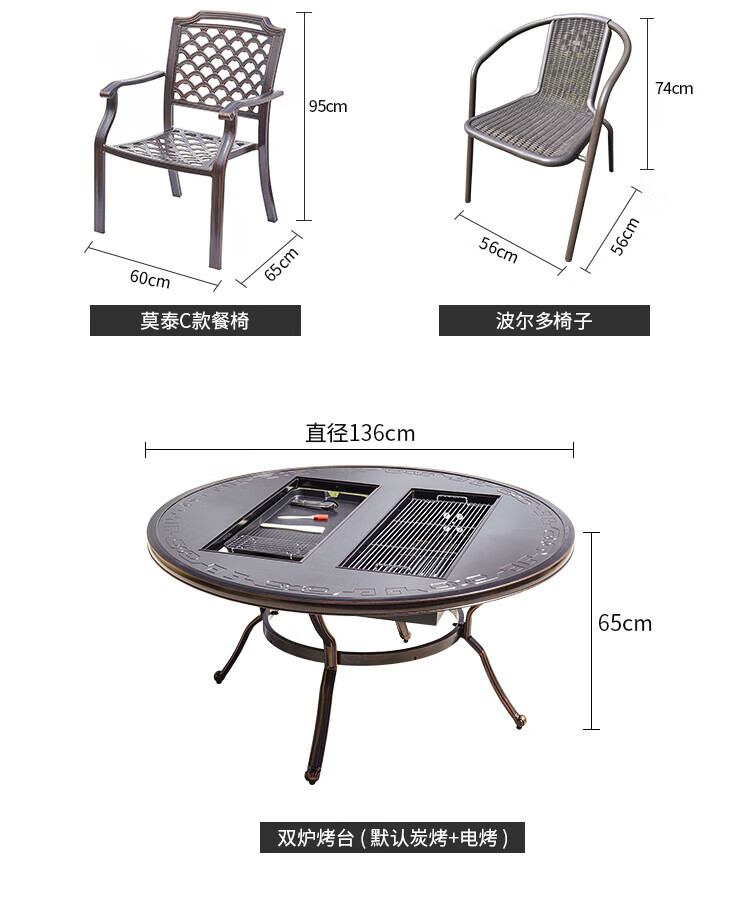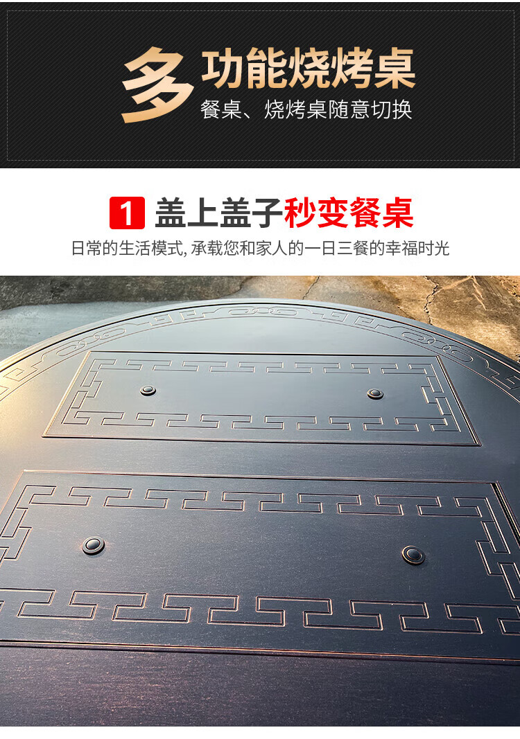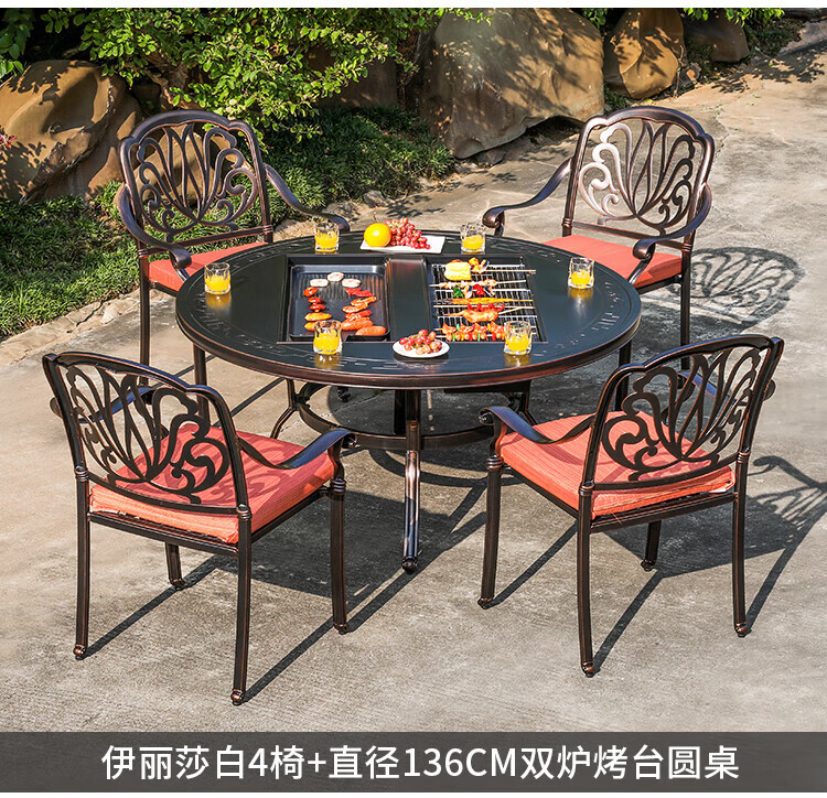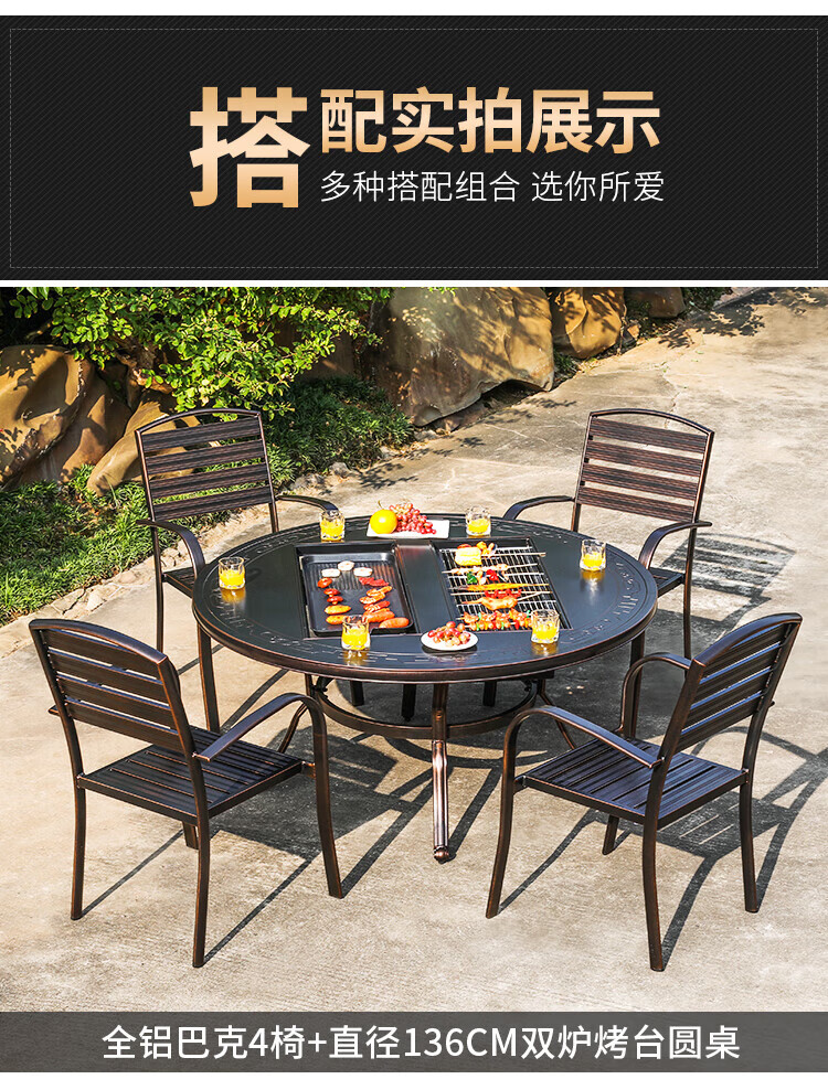 gosoo户外桌椅庭院别墅围炉煮茶餐桌烧烤桌电烤火锅铸铝6椅136cm双炉桌