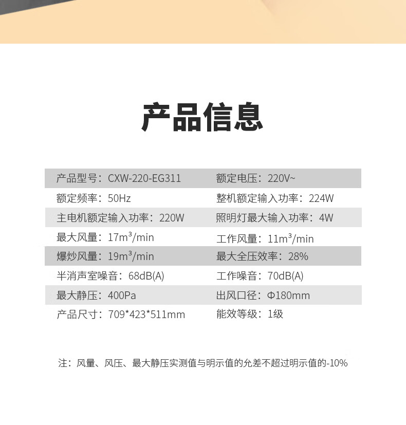 前锋(CHIFFO)家用油烟机 双进风吸烟三挡风量调节一体喷涂工艺一级能效近吸式侧吸CXW-220-EG311 小尺寸近吸式侧吸