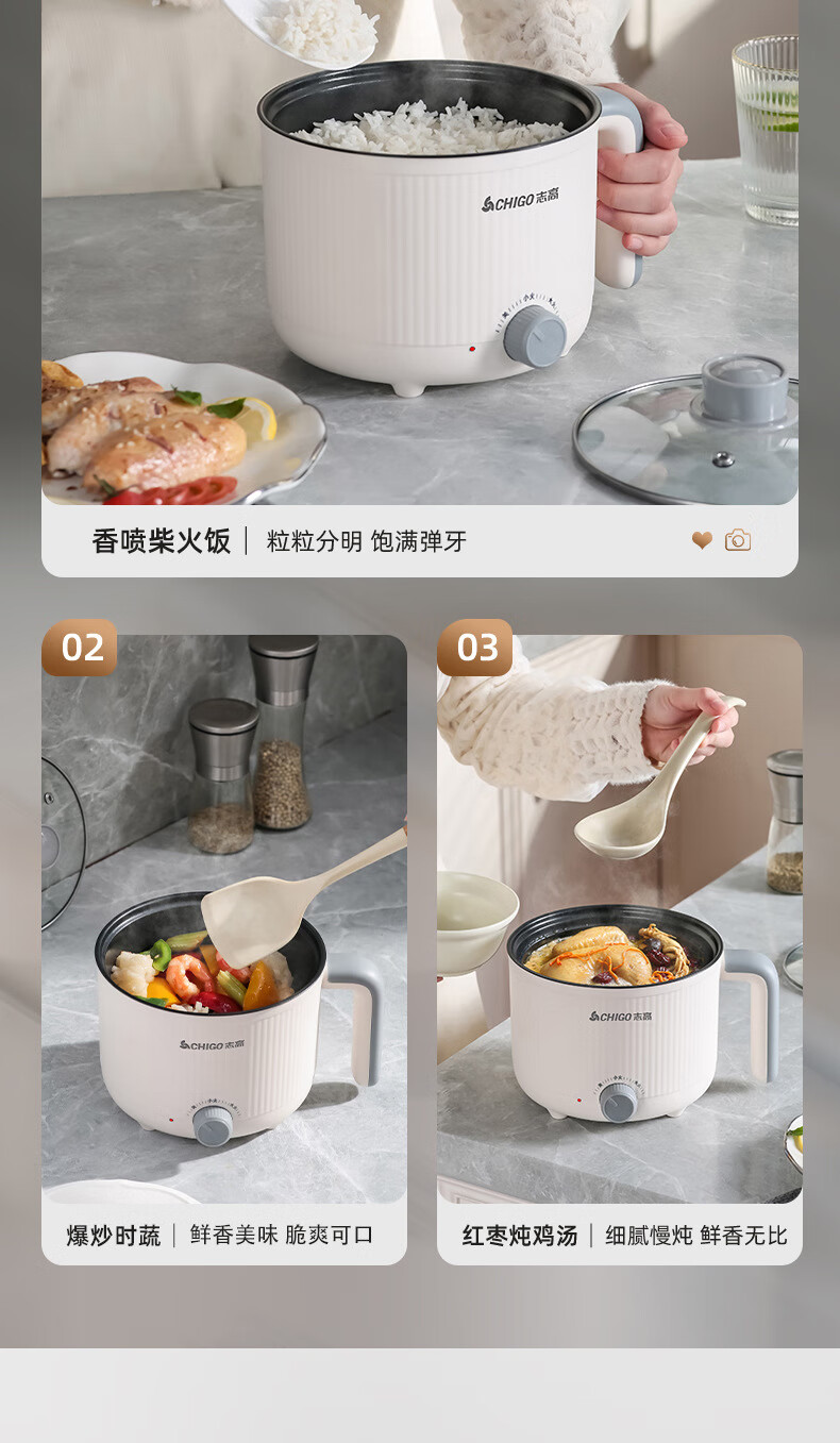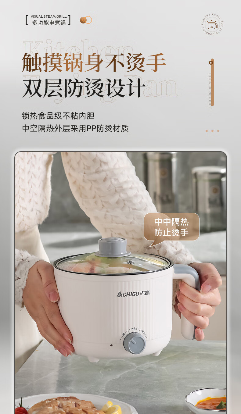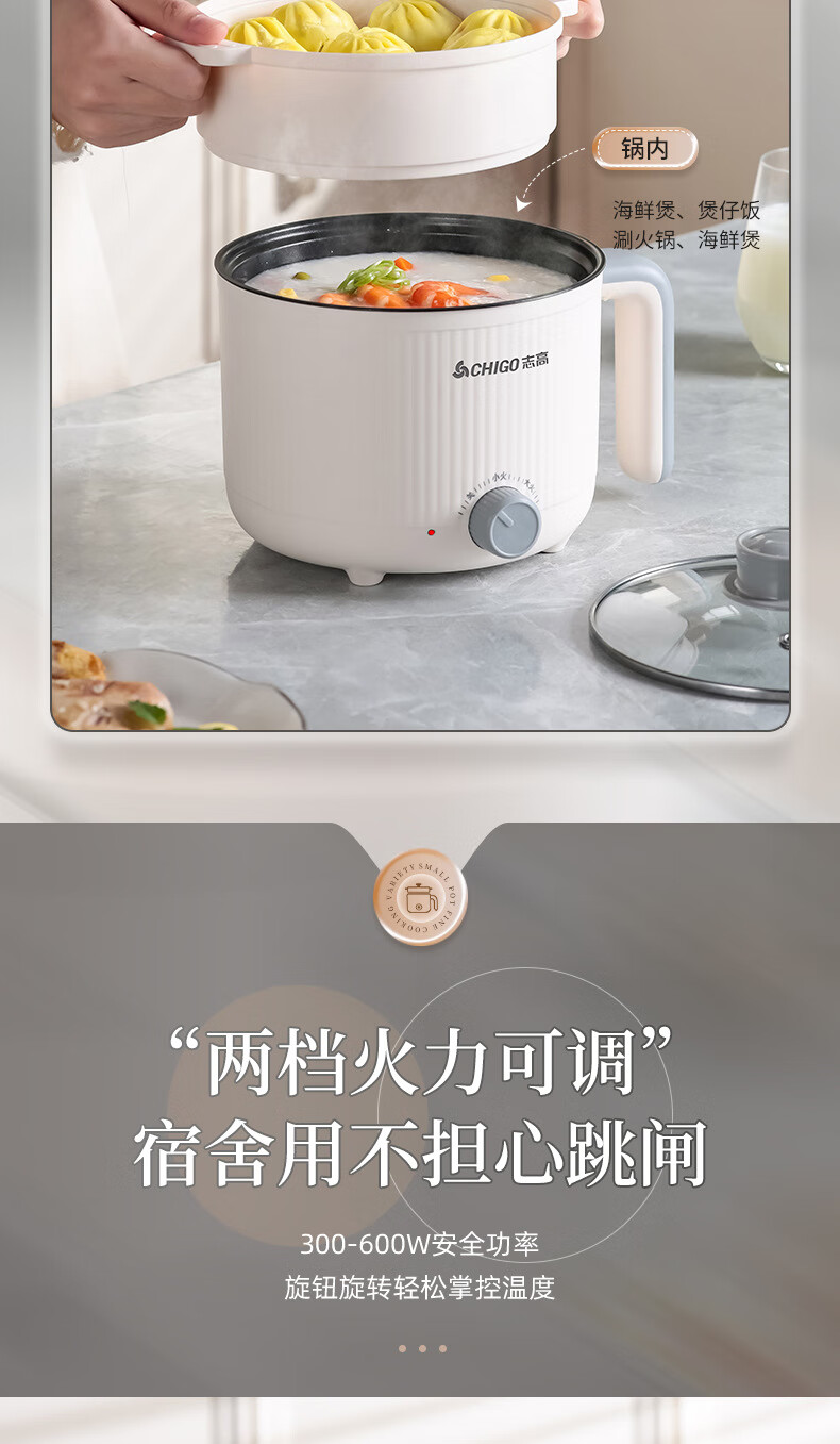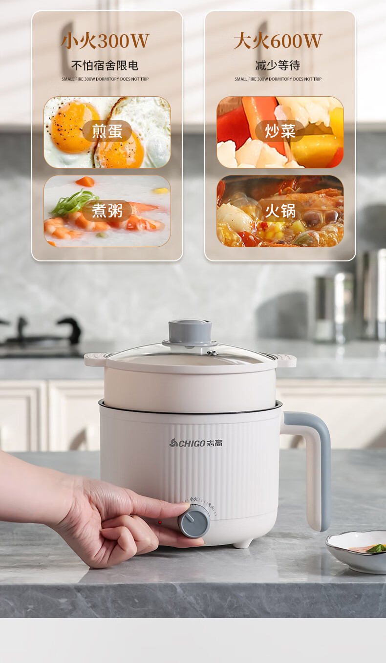 【现货现发】电煮锅家用宿舍小电锅多功能学生煮面锅炒菜不粘电火 【1.8L米白色】带蒸笼