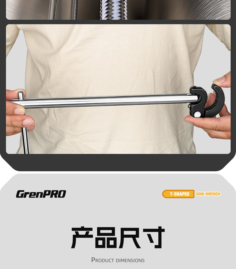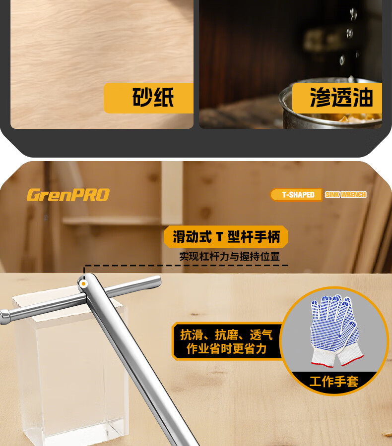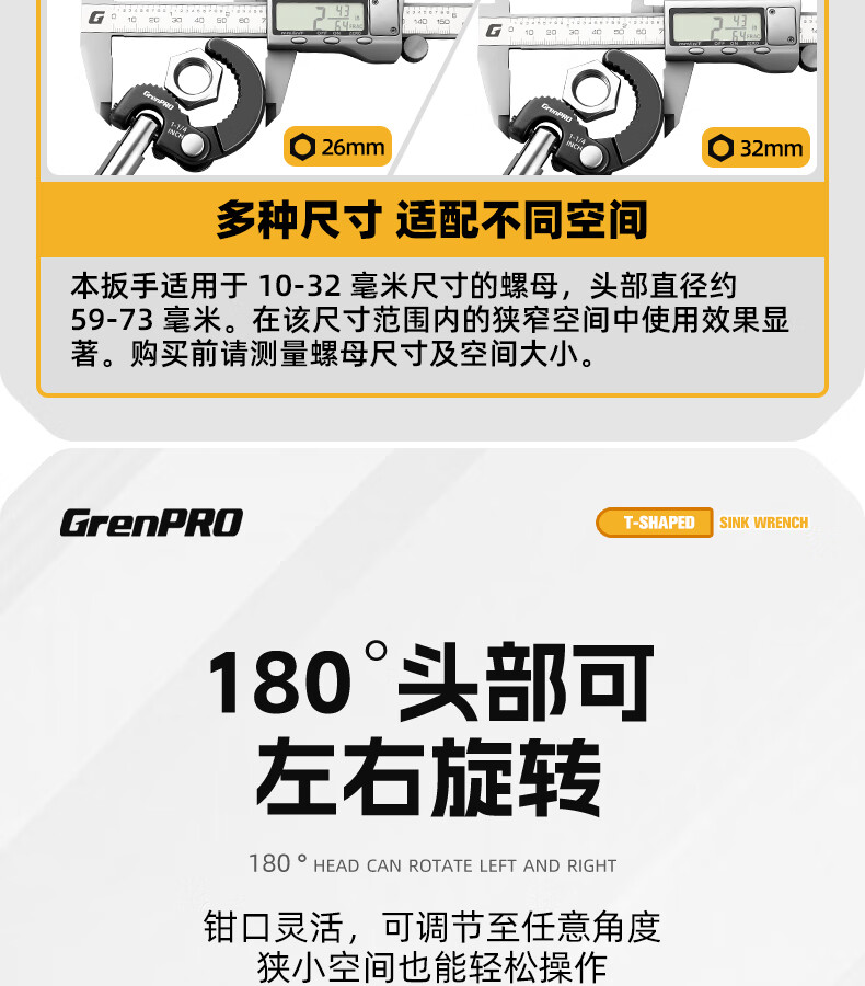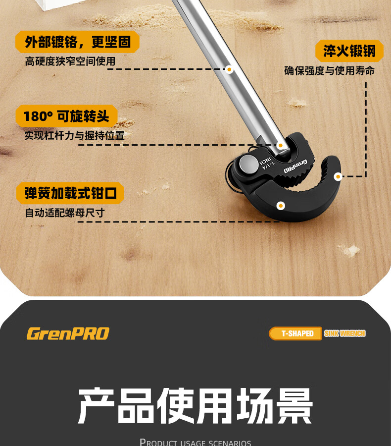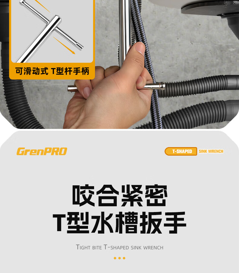 绿林(GREENER)T型活动扳手活口多功能活扳手正品卫浴专用板手狭小空间开口 【可旋转180°】T型自锁活扳手