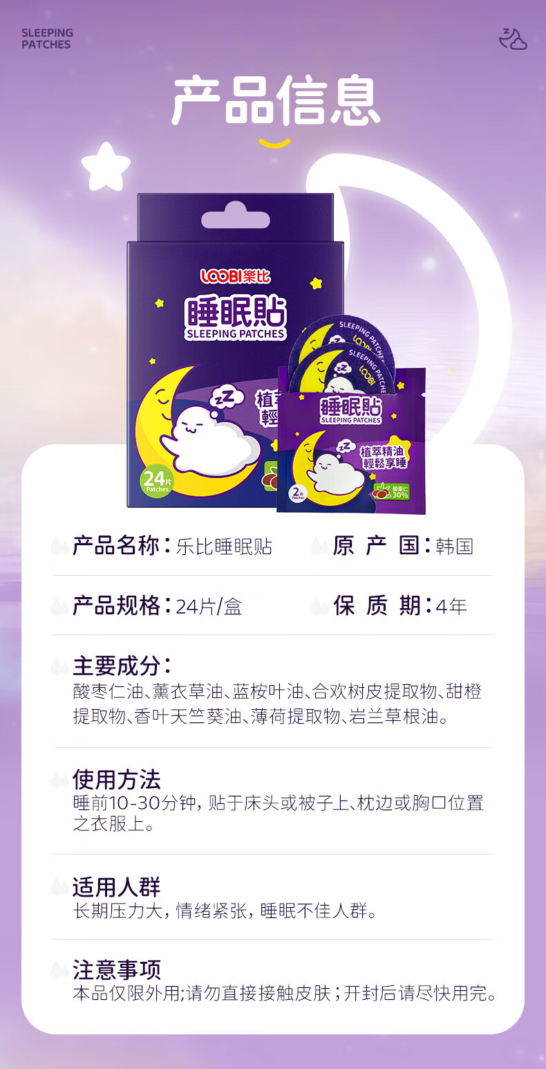乐比(LOOBI)睡眠贴深度睡眠贴精油晚安贴舒缓助眠成人儿童男女通用失眠多梦 【体验装】酸枣仁1盒12片