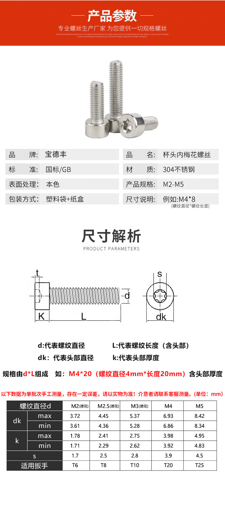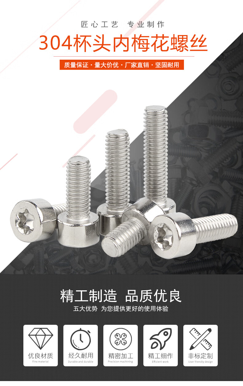 宝德丰304不锈钢防盗螺丝防拆内梅花杯头螺丝钉内六角花形圆柱头螺钉 搓花 M2X3[50只]