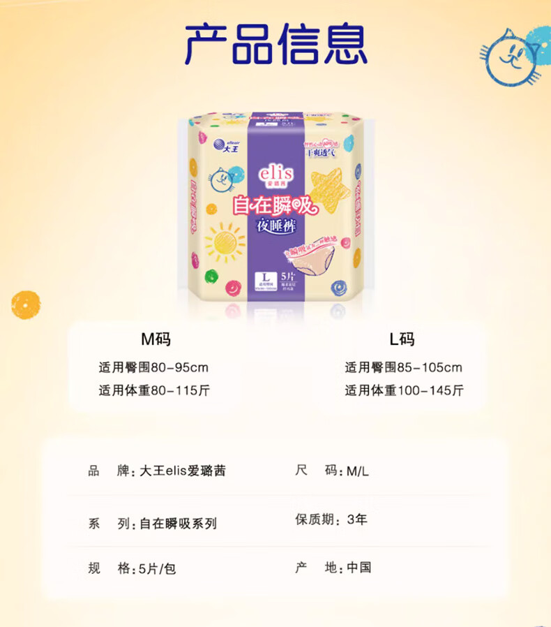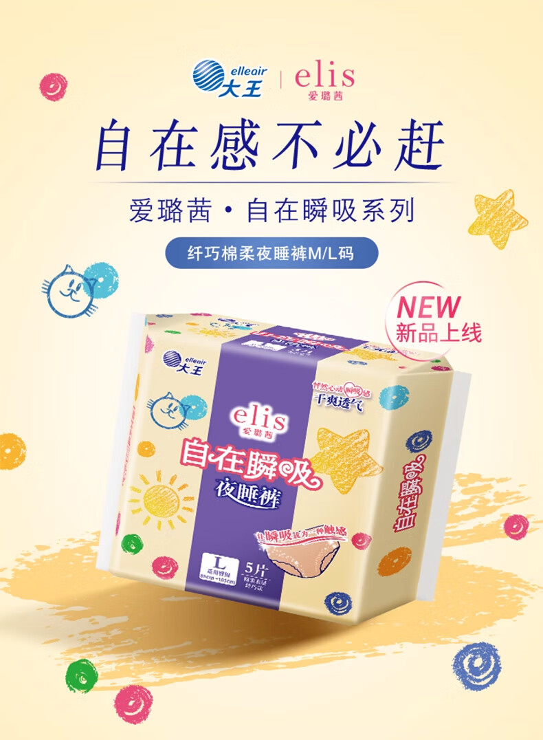 爱璐茜(elis)大王自在瞬吸安睡裤L码5条超薄夜用裤型卫生巾姨妈拉拉裤京东自营