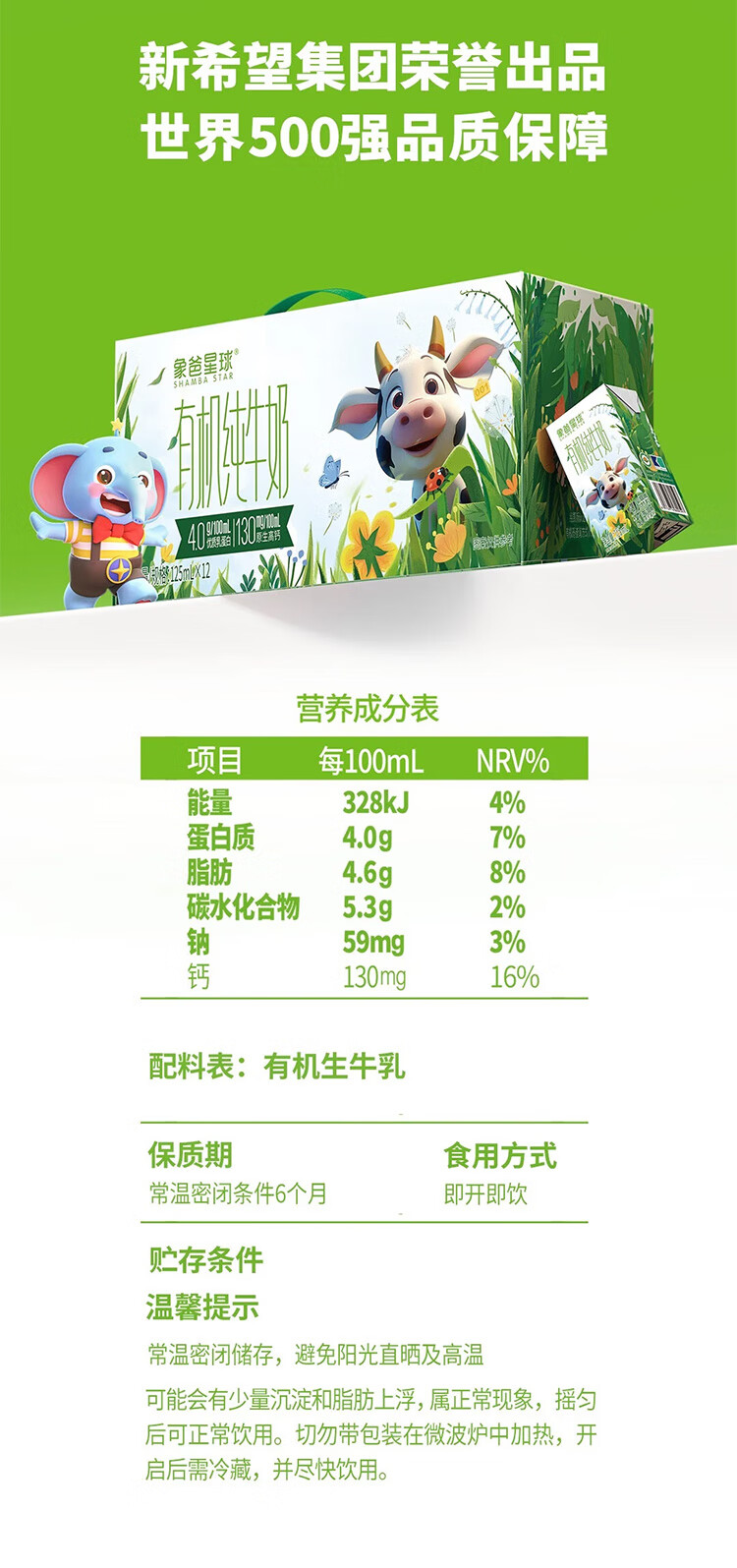 新希望4.0g蛋白质高钙儿童全脂有机纯牛奶125ml*12盒 礼盒装送礼