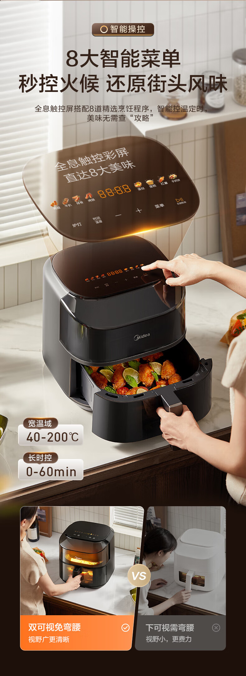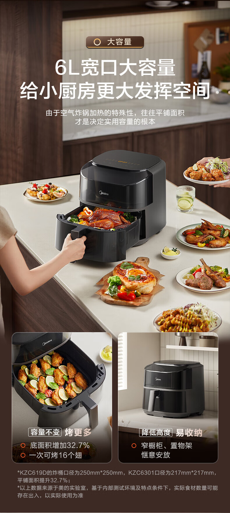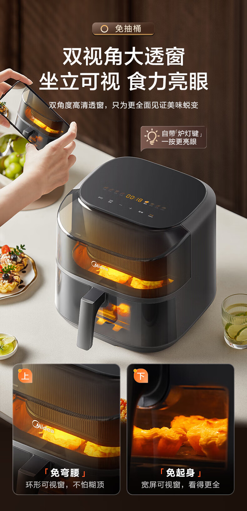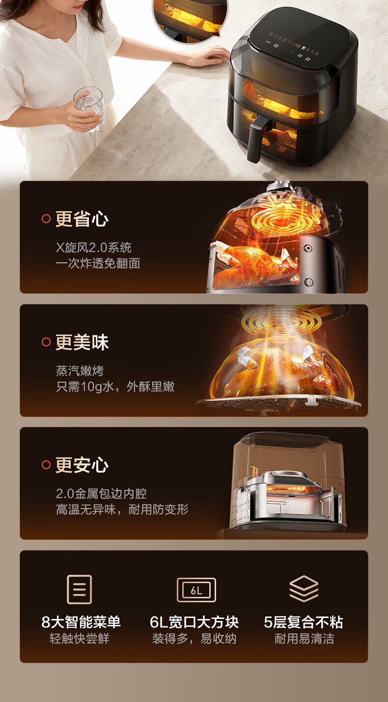 美的(Midea)家用X旋风2.0空气炸锅25年新款 蒸汽嫩烤 家用实用宽口大容量6L 上下双可视2.0金属内腔 KZC6019D 【双可视】 6L
