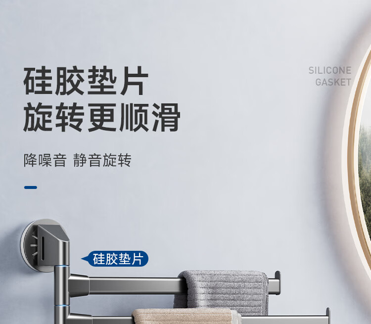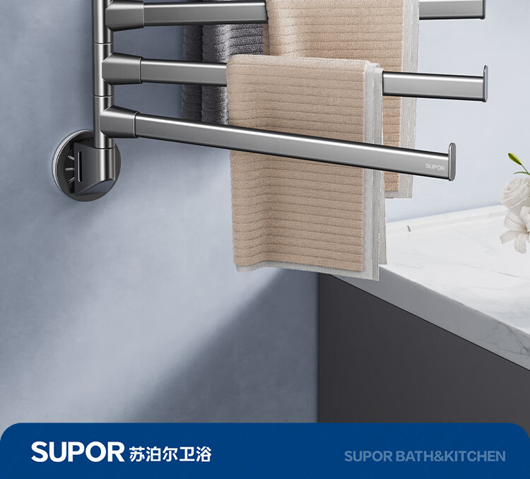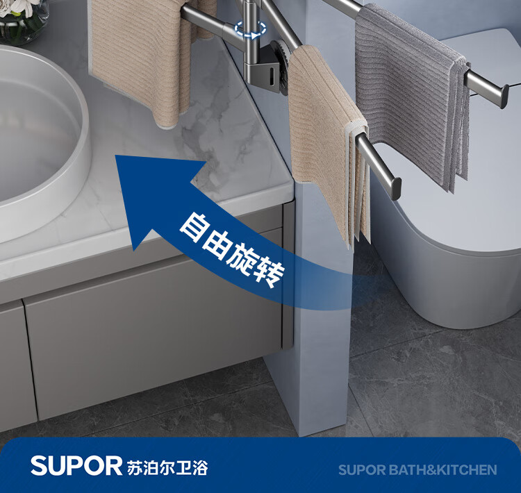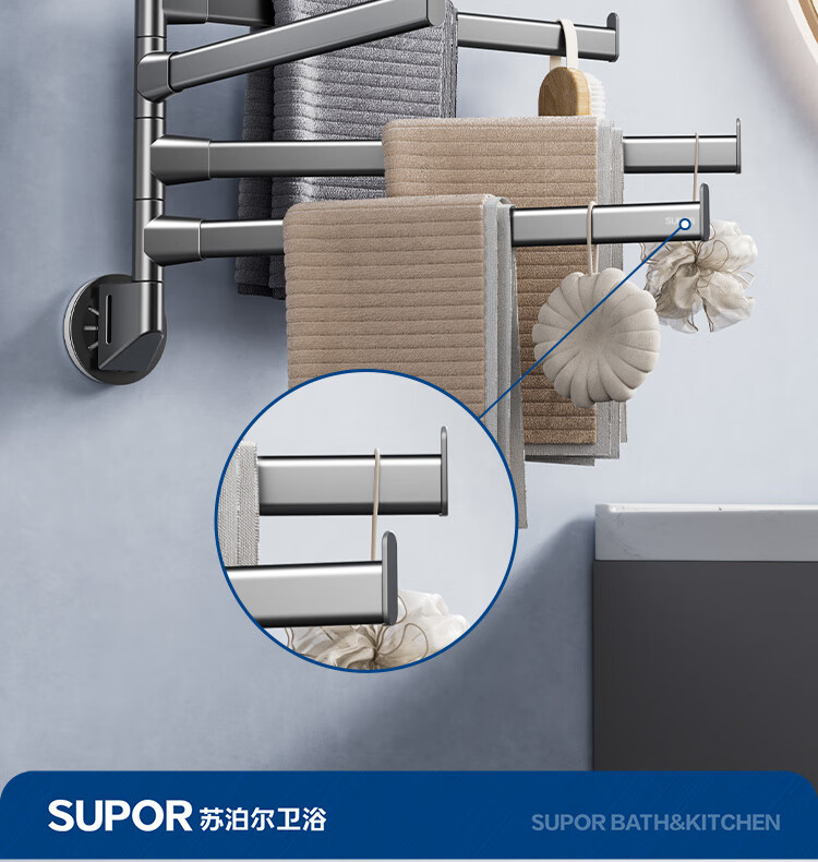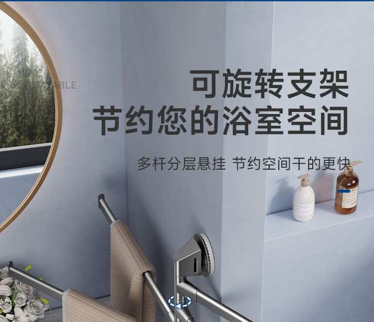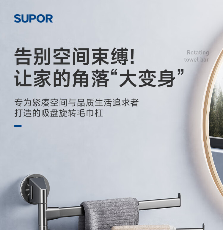 苏泊尔毛巾架卫生间免打孔壁挂可旋转浴室毛巾单杆厕所洗手间收纳 枪灰|吸盘旋转毛巾架3杆
