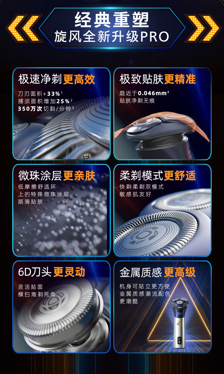 飞利浦(PHILIPS)电动剃须刀旋风3系PRO刮胡刀 风驰切剃6D浮动刀头 中秋礼物 生日礼物送老公 送男友 国家补贴