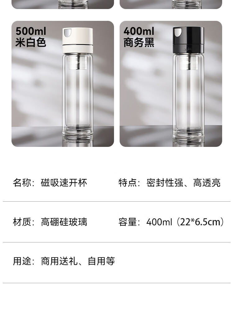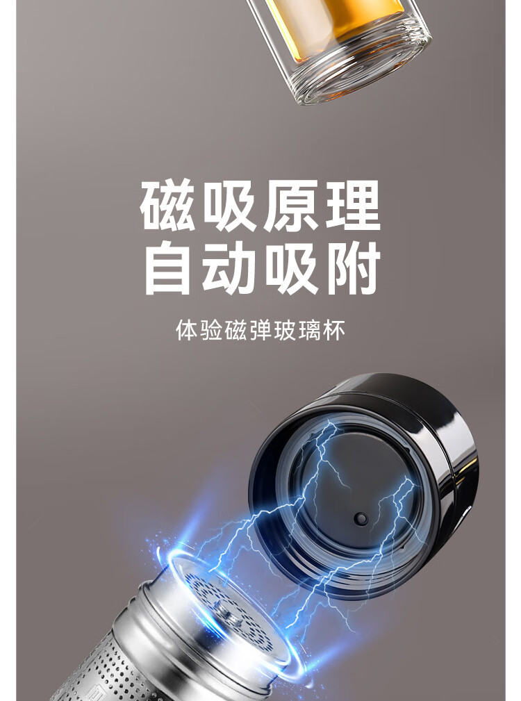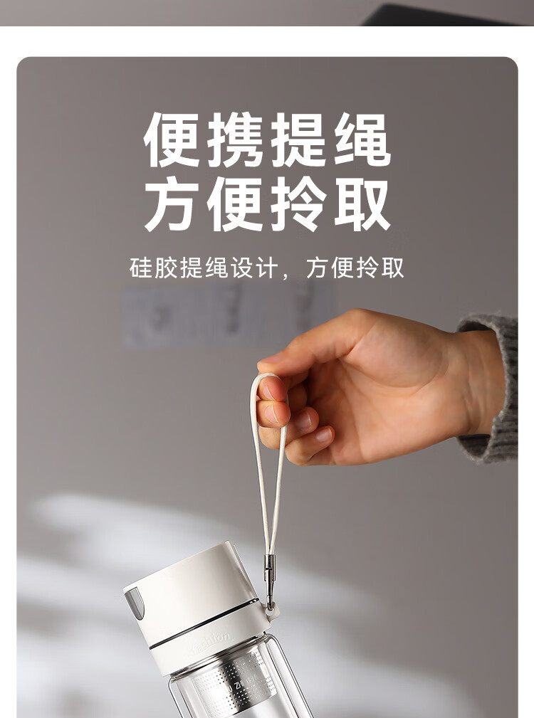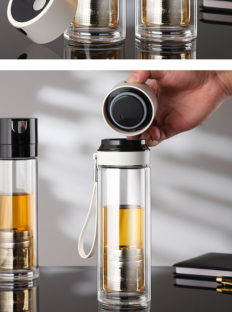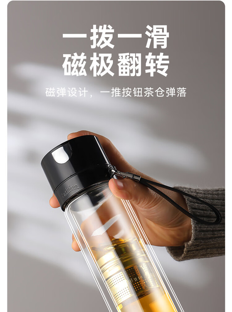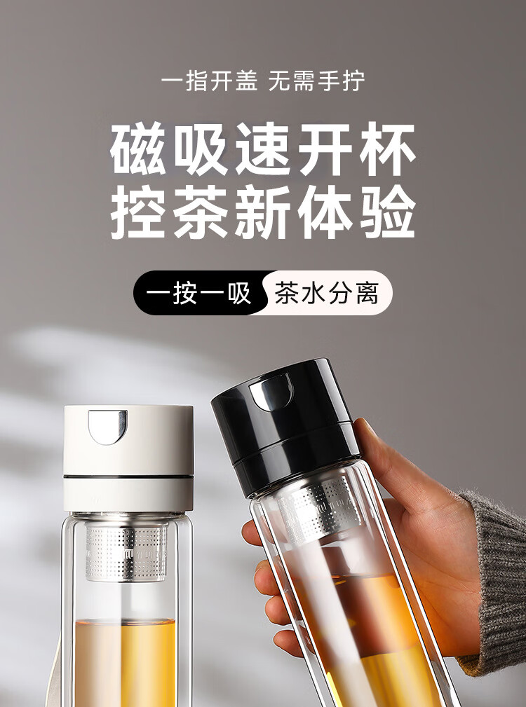 创建磁吸炮弹泡茶杯一键开盖玻璃杯大容量高硼硅水杯车载茶水分离杯子 白色400ml带提绳