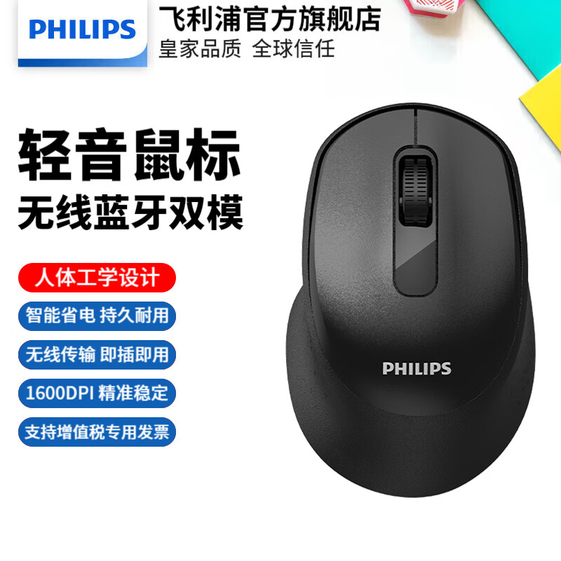 飞利浦(PHILIPS)M590蓝牙鼠标无线鼠标双模办公家用轻音鼠标电池款苹果mac台式电脑笔记本通用鼠标WF13B 黑色(送电池)