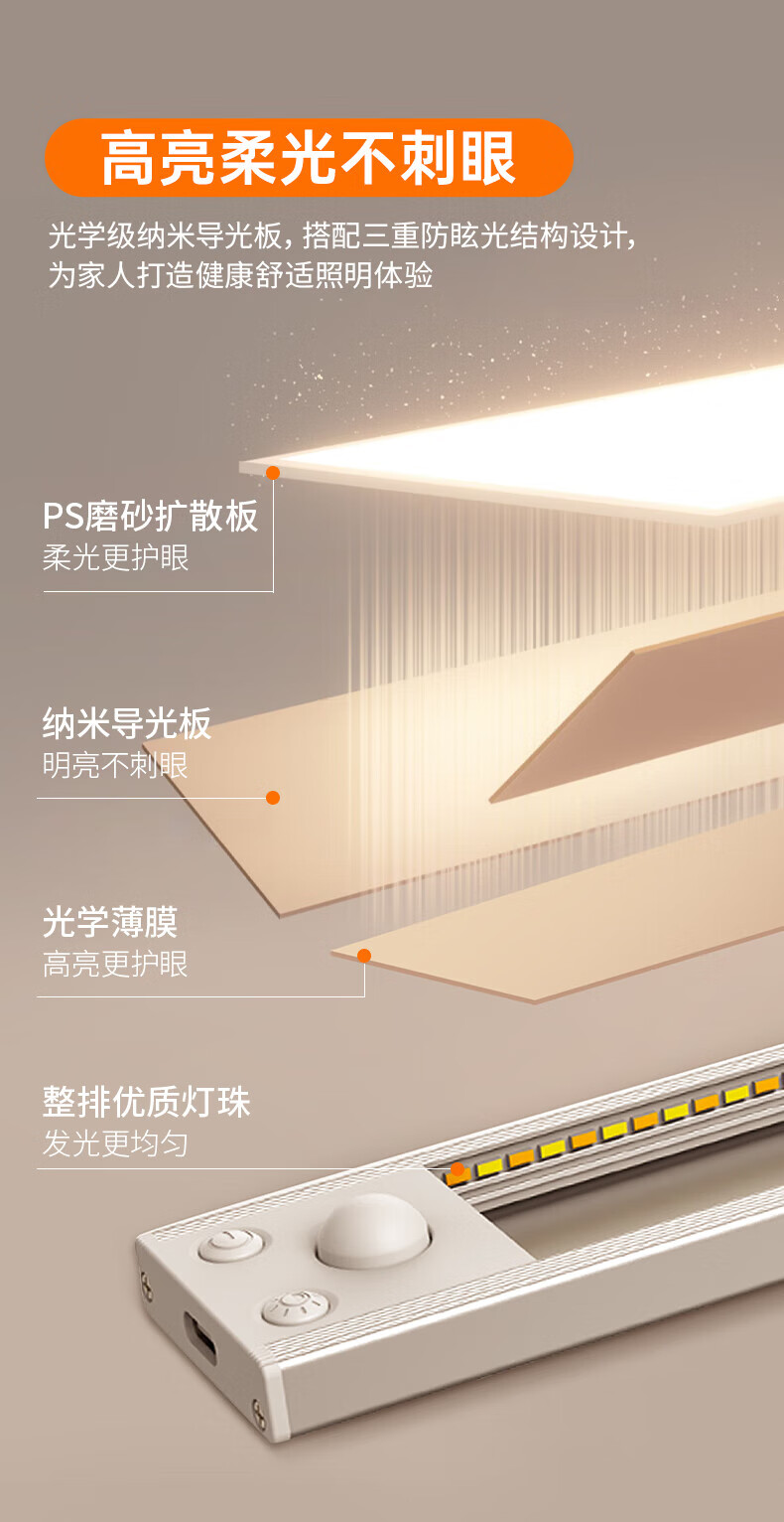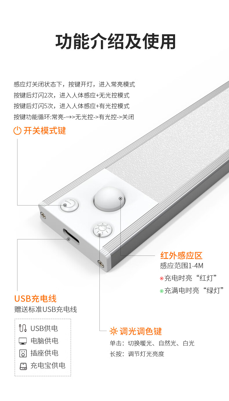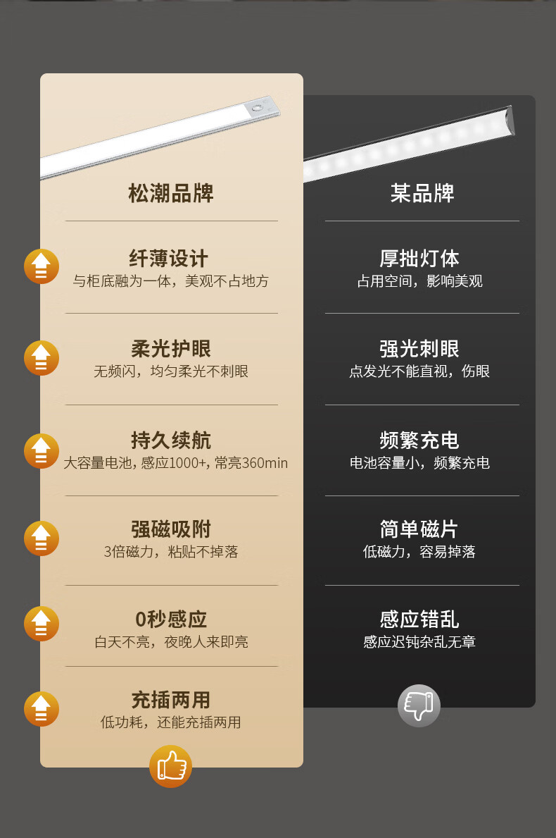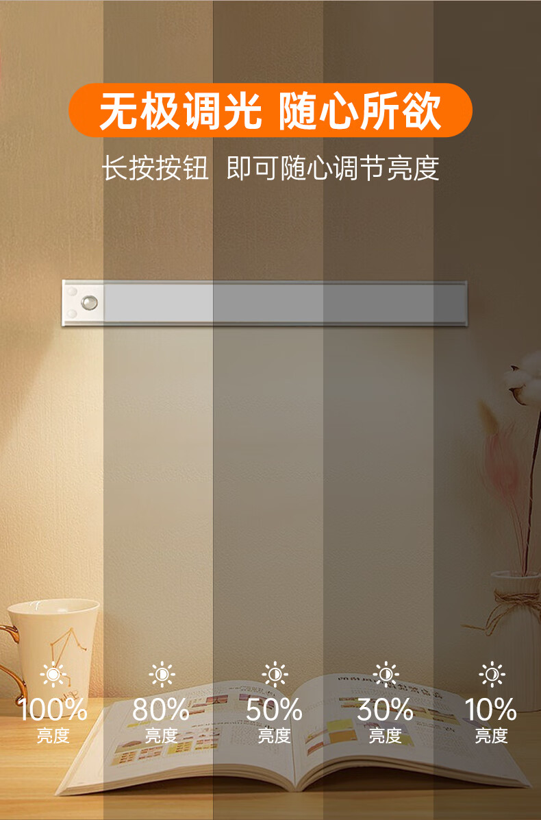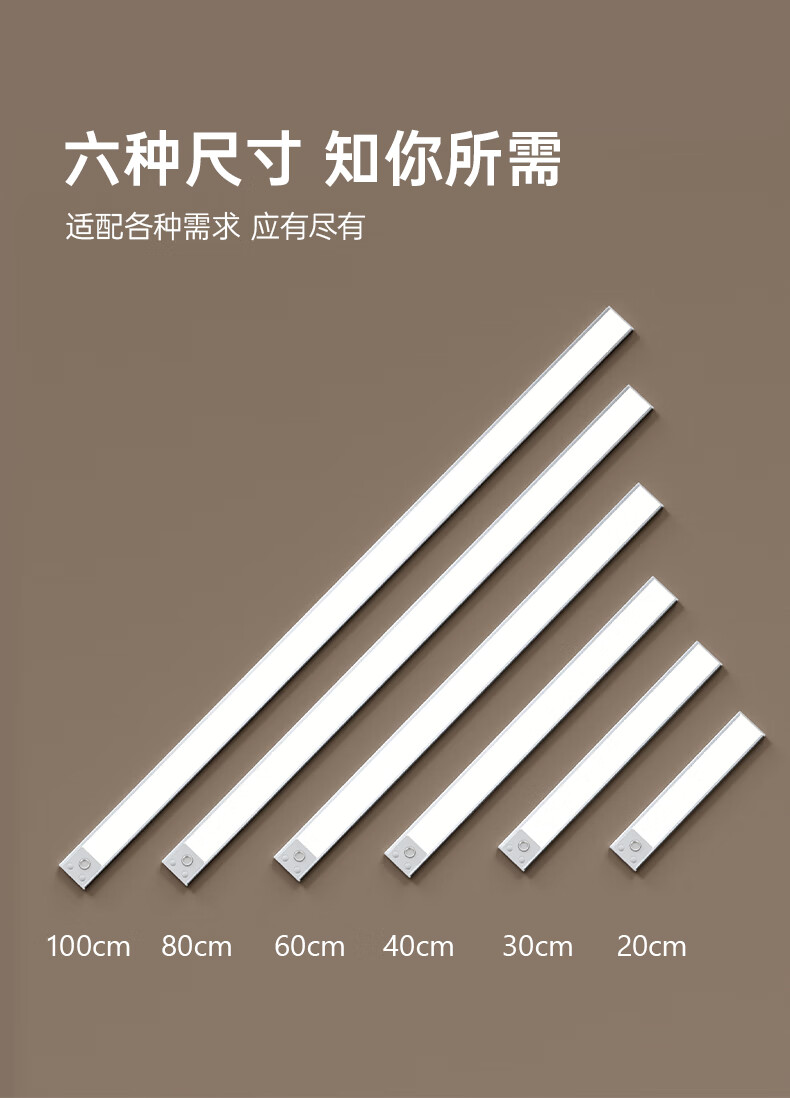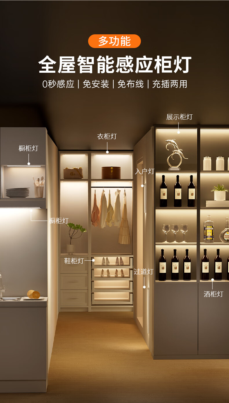 松潮橱柜灯人体感应灯带磁吸充电免布线衣柜酒柜鞋柜玄关灯小夜灯氛围 清晰白光/高续航版+人体+光感 升级版橱柜灯60cm