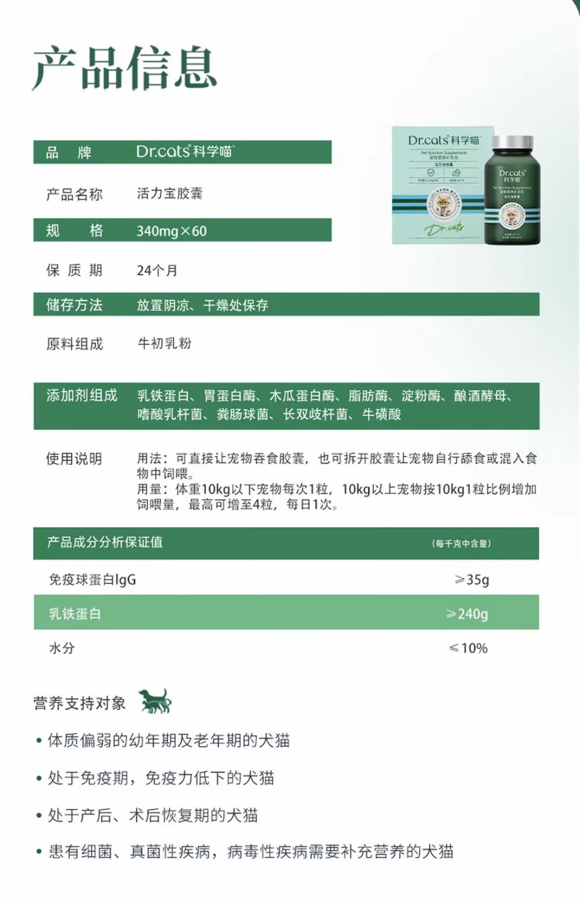 科学喵Dr.cats活力宝进口乳铁蛋白免疫调节含益生菌牛磺酸 【乳铁蛋白】60粒+活力宝7粒+冰箱贴盲盒+宠物湿巾