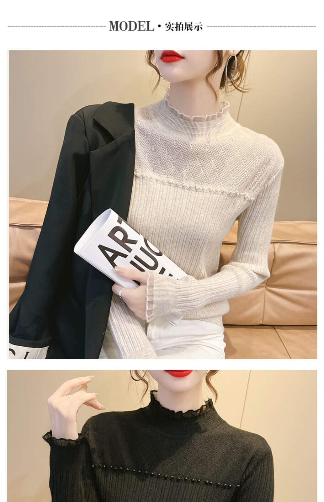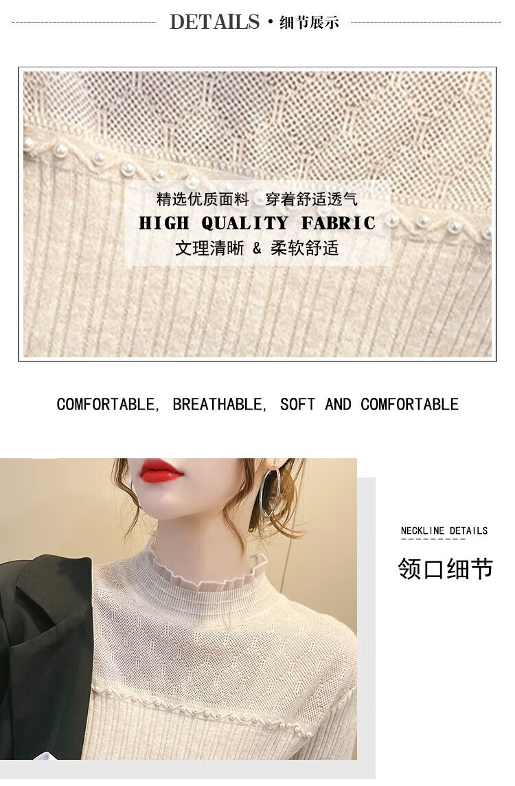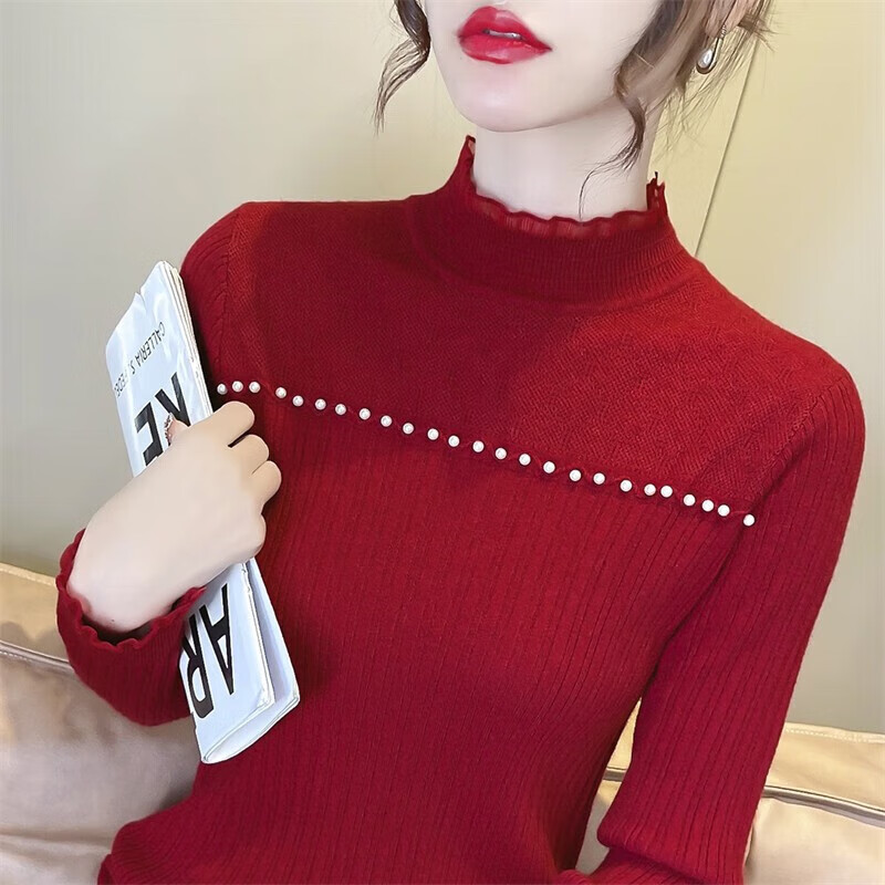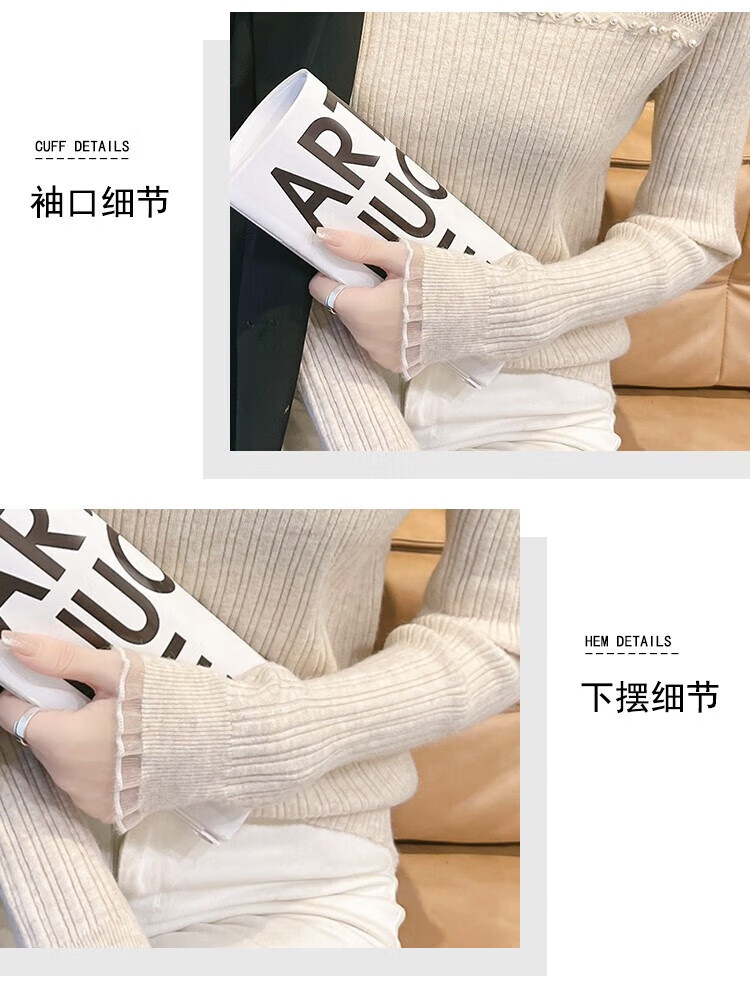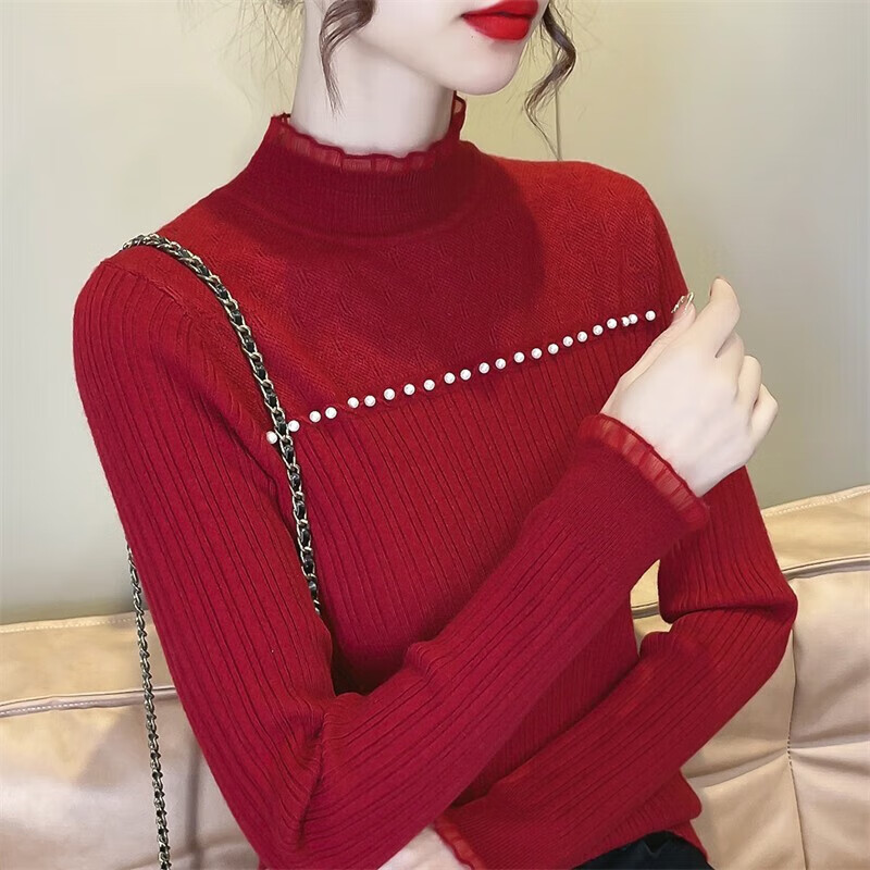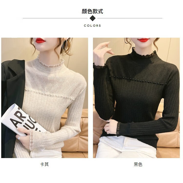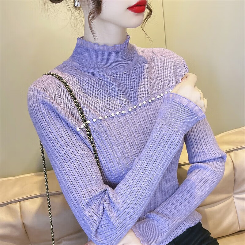 香影芬半高领蕾丝拼接打底衫女秋冬新款毛衣女士修身半高领针织内搭上衣 紫色 L (建议105-115斤)