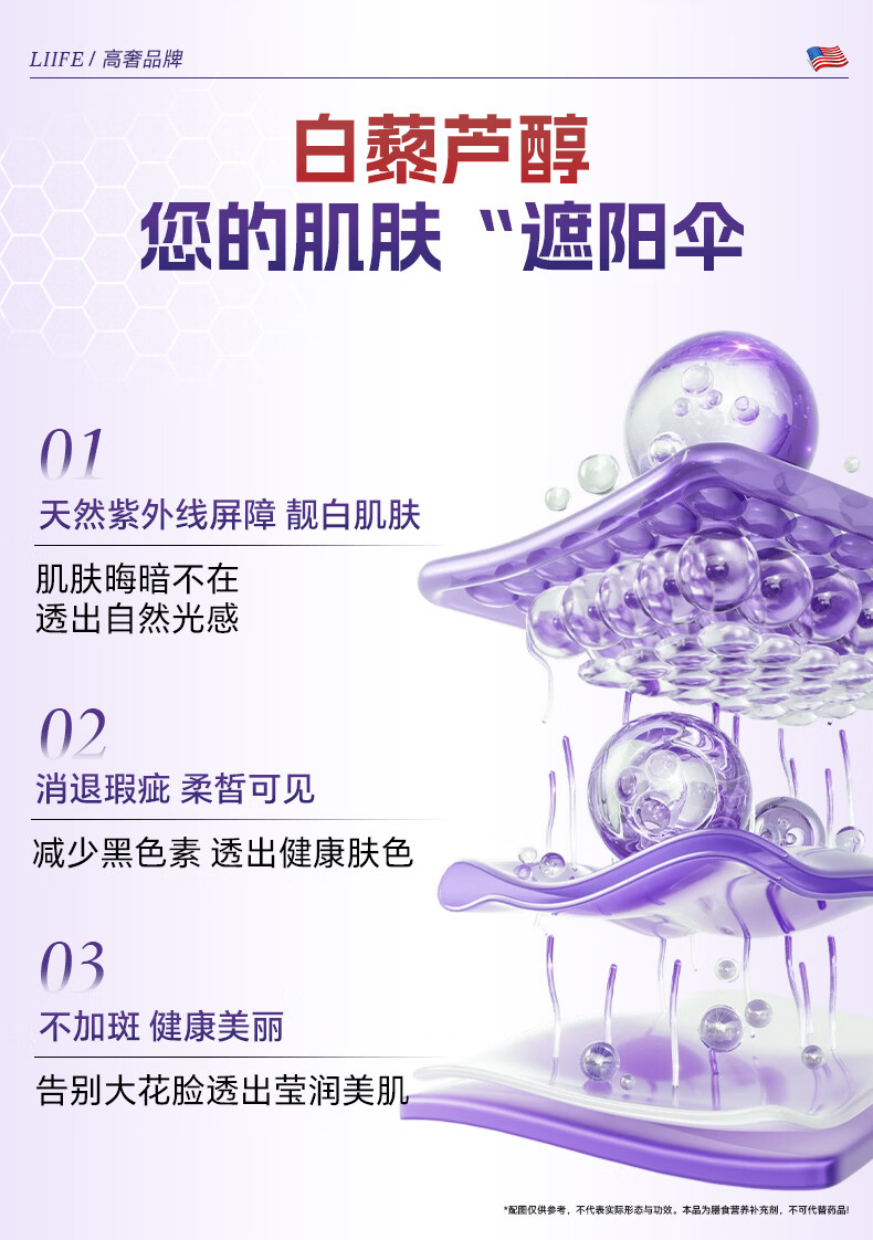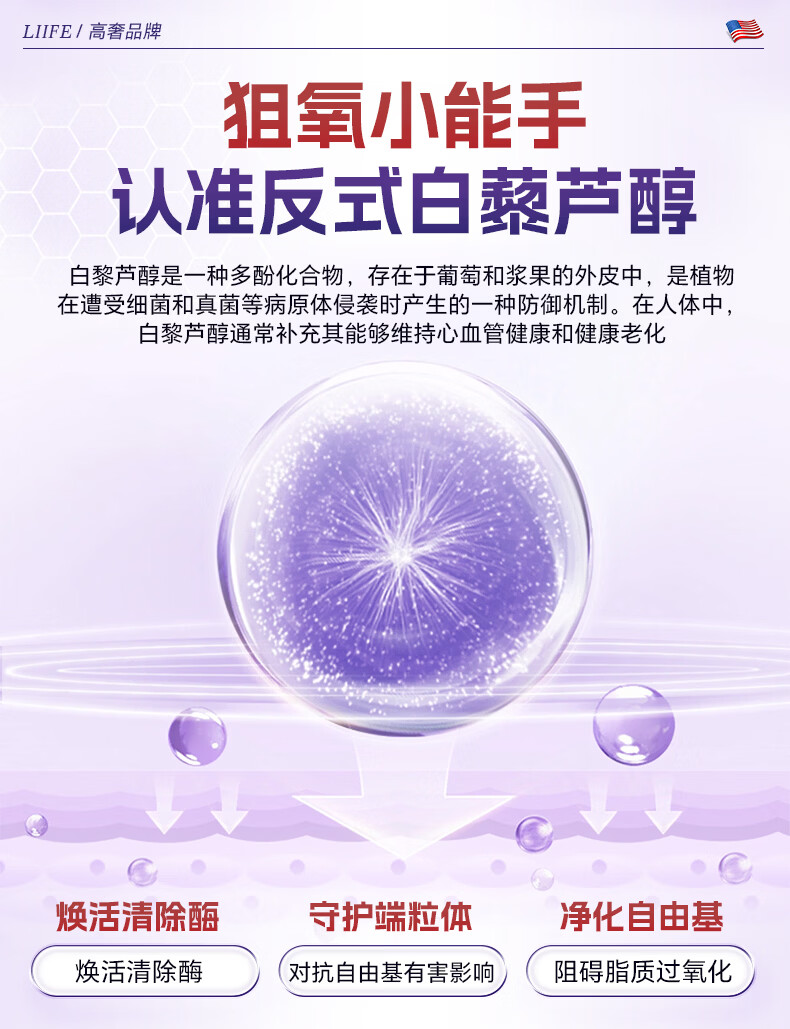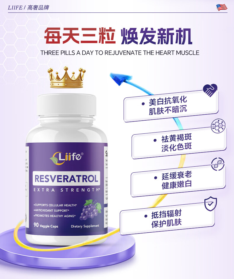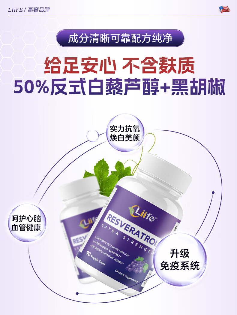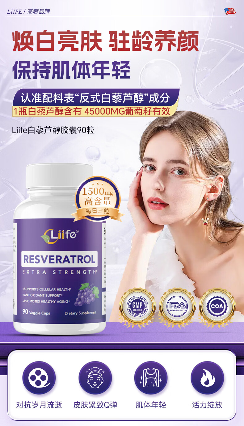 Liife厉孚白藜芦醇美白丸葡萄籽精华成人女淡斑去黄抗衰老氧化提亮肌肤 【吃出冷白皮】白藜芦醇 90粒*2瓶