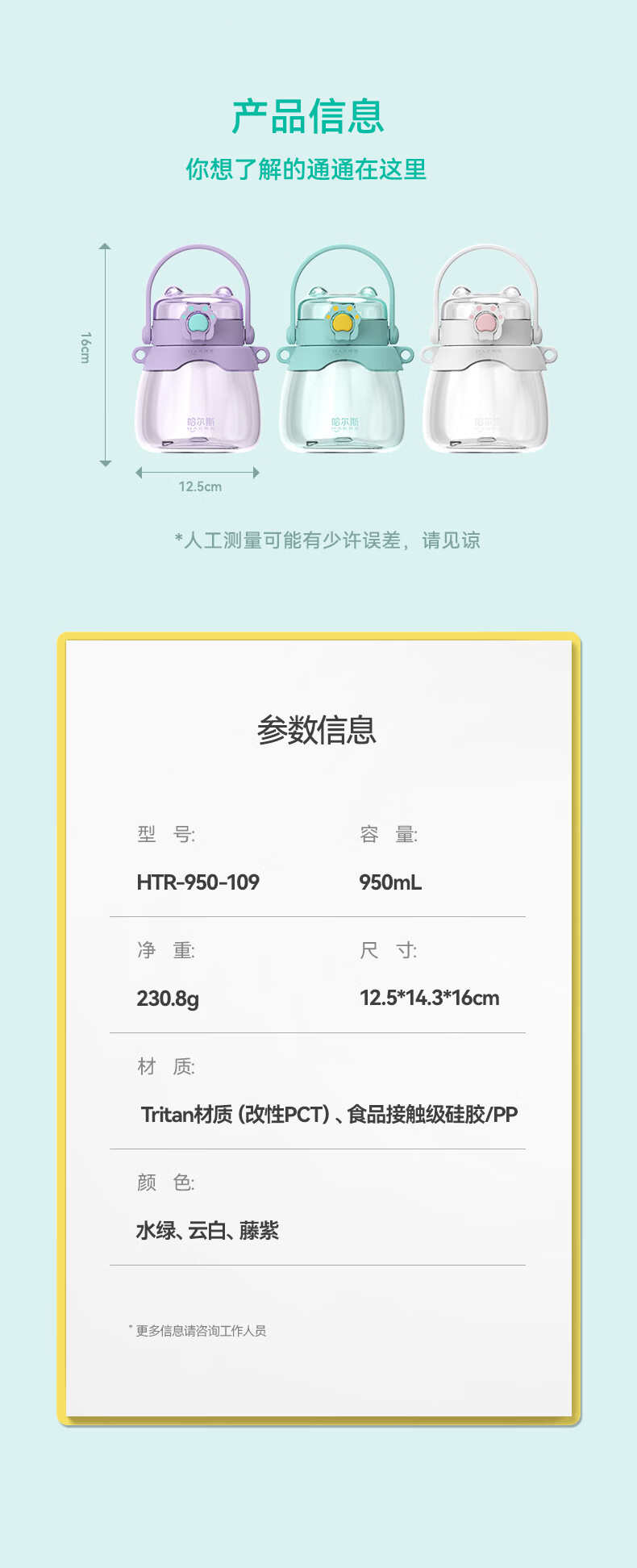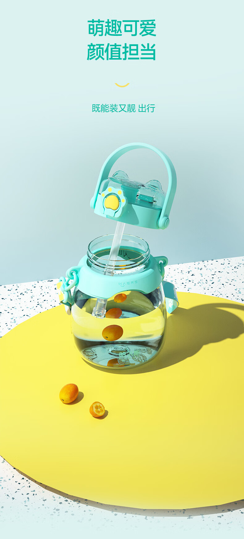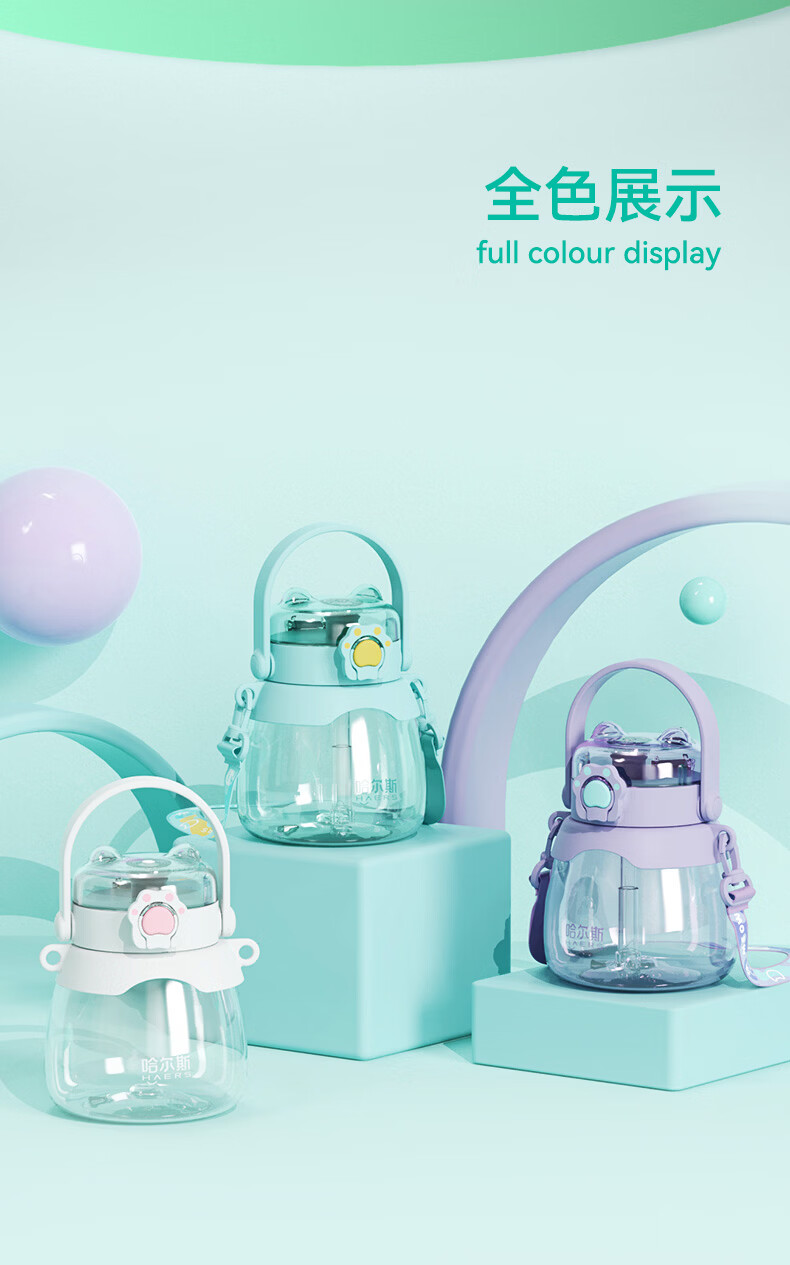 哈尔斯(HAERS)猫爪大肚杯大容量水杯塑料吸管杯夏季女学生儿童运动户外水壶杯子 HTR-950-109藤紫 950ml