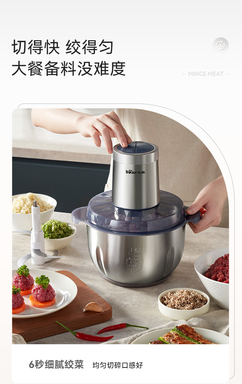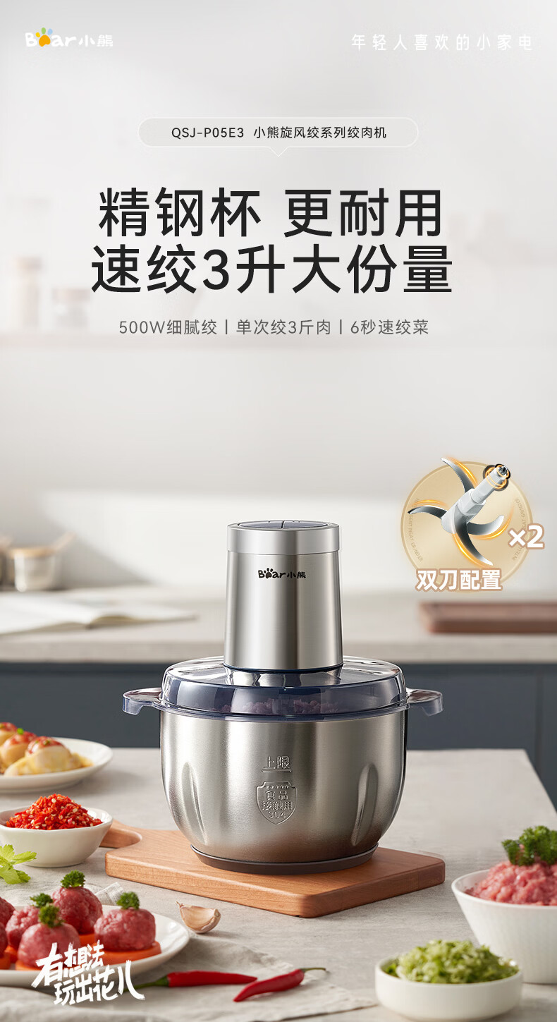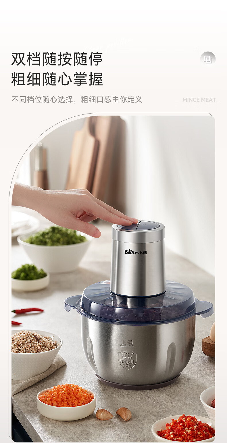 小熊(Bear)绞肉机家用 碎肉机电动搅拌机饺子肉馅蒜蓉机 搅肉机 绞肉绞菜多功能一体机 3L全钢杯 QSJ-P05E3