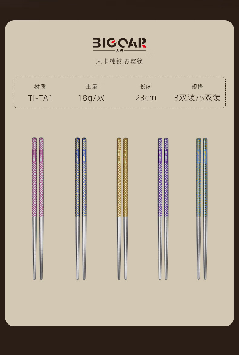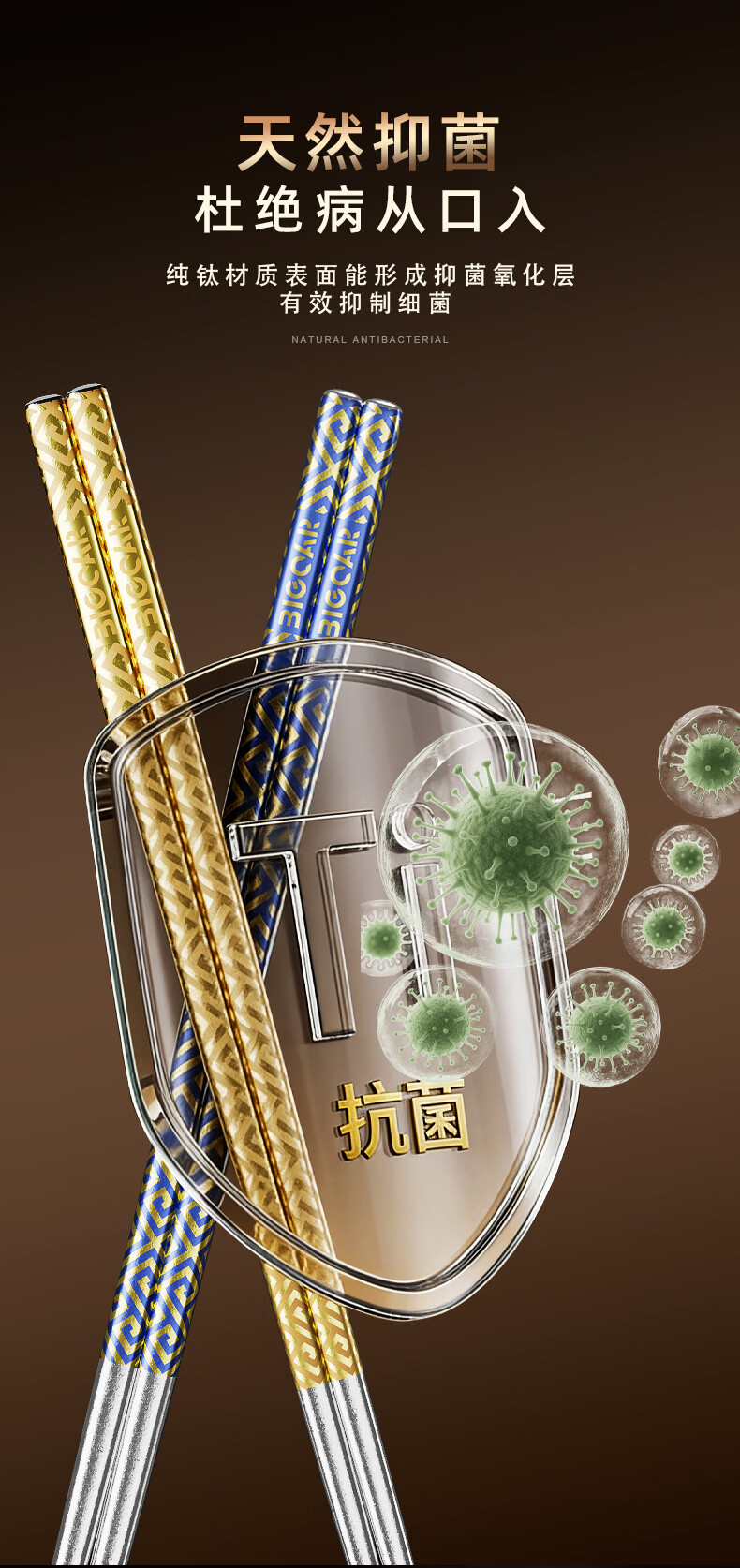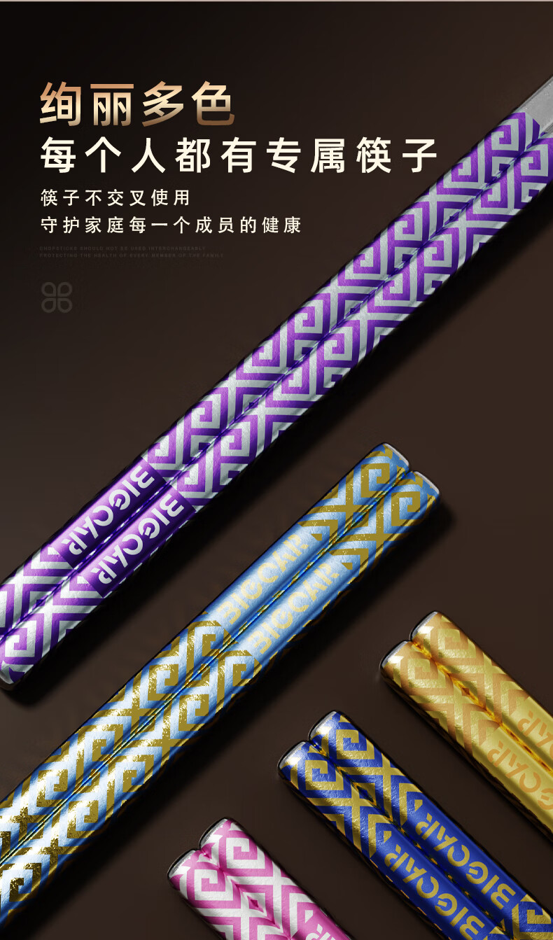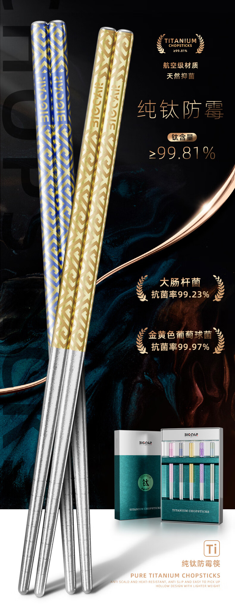 大卡纯钛筷子抗菌防霉高级筷子套装家用高档钛质筷子健康金属筷防滑筷 彩色纯钛筷子礼盒装 紫金青 3双