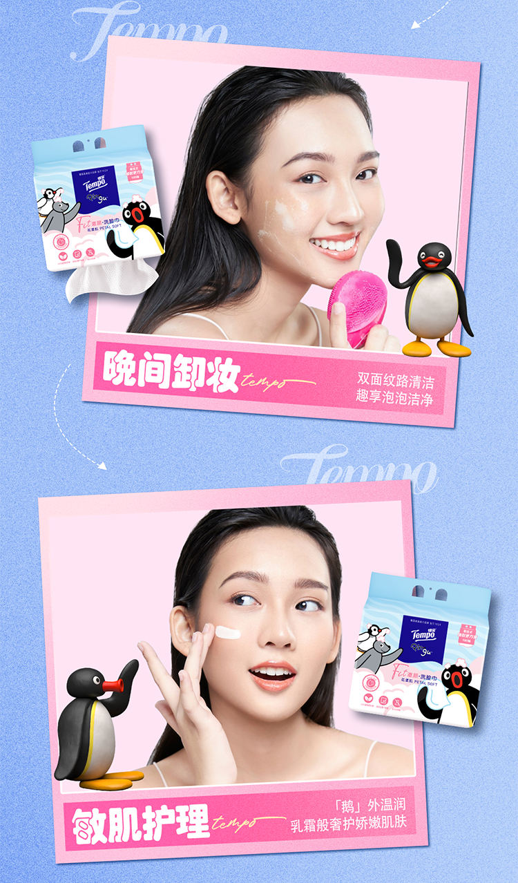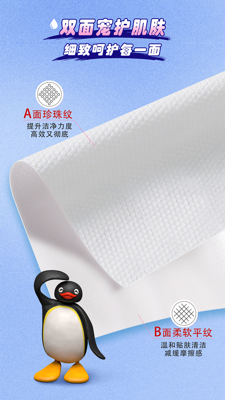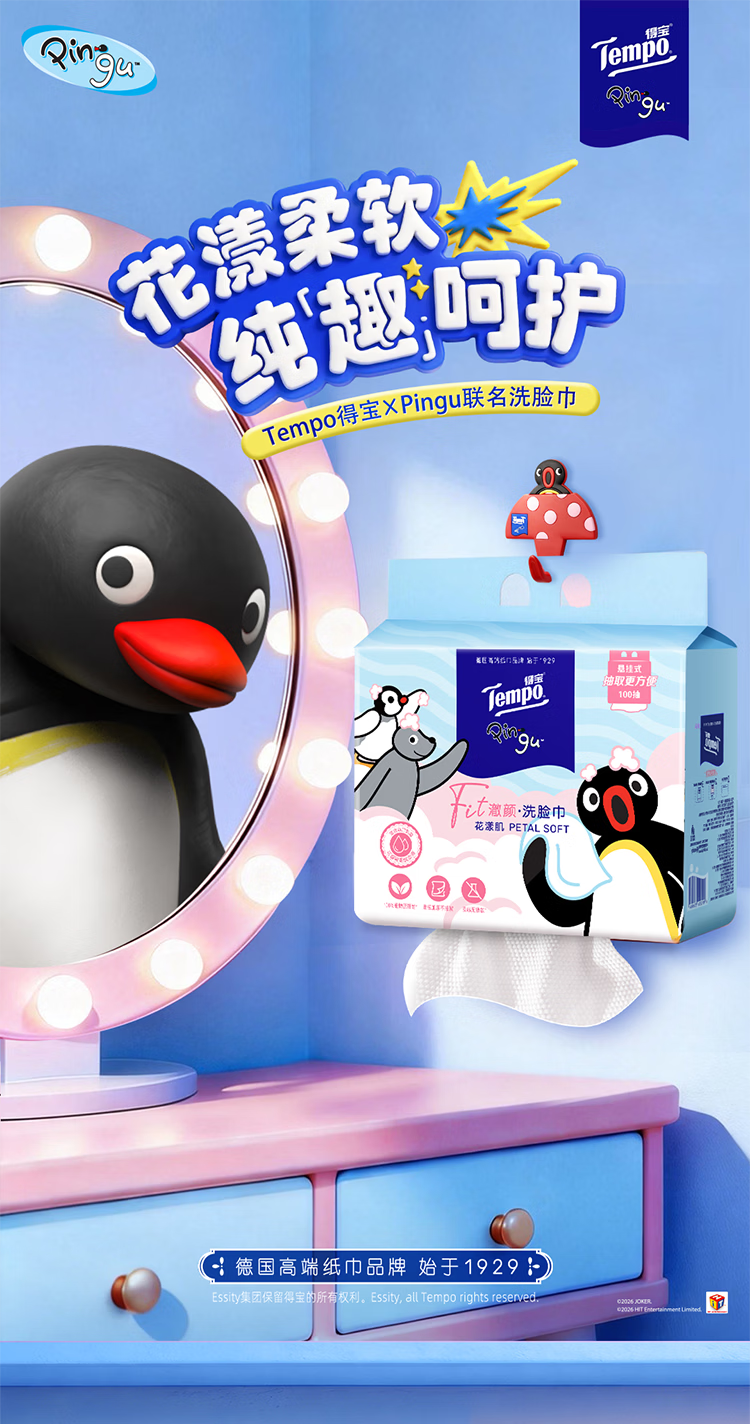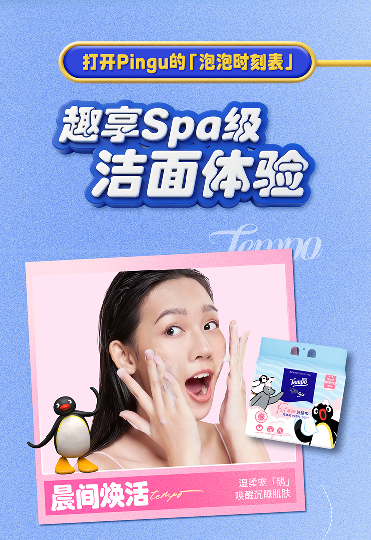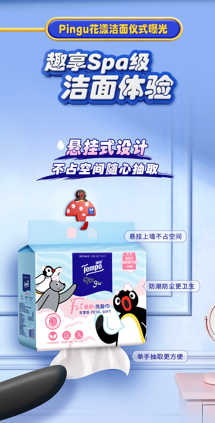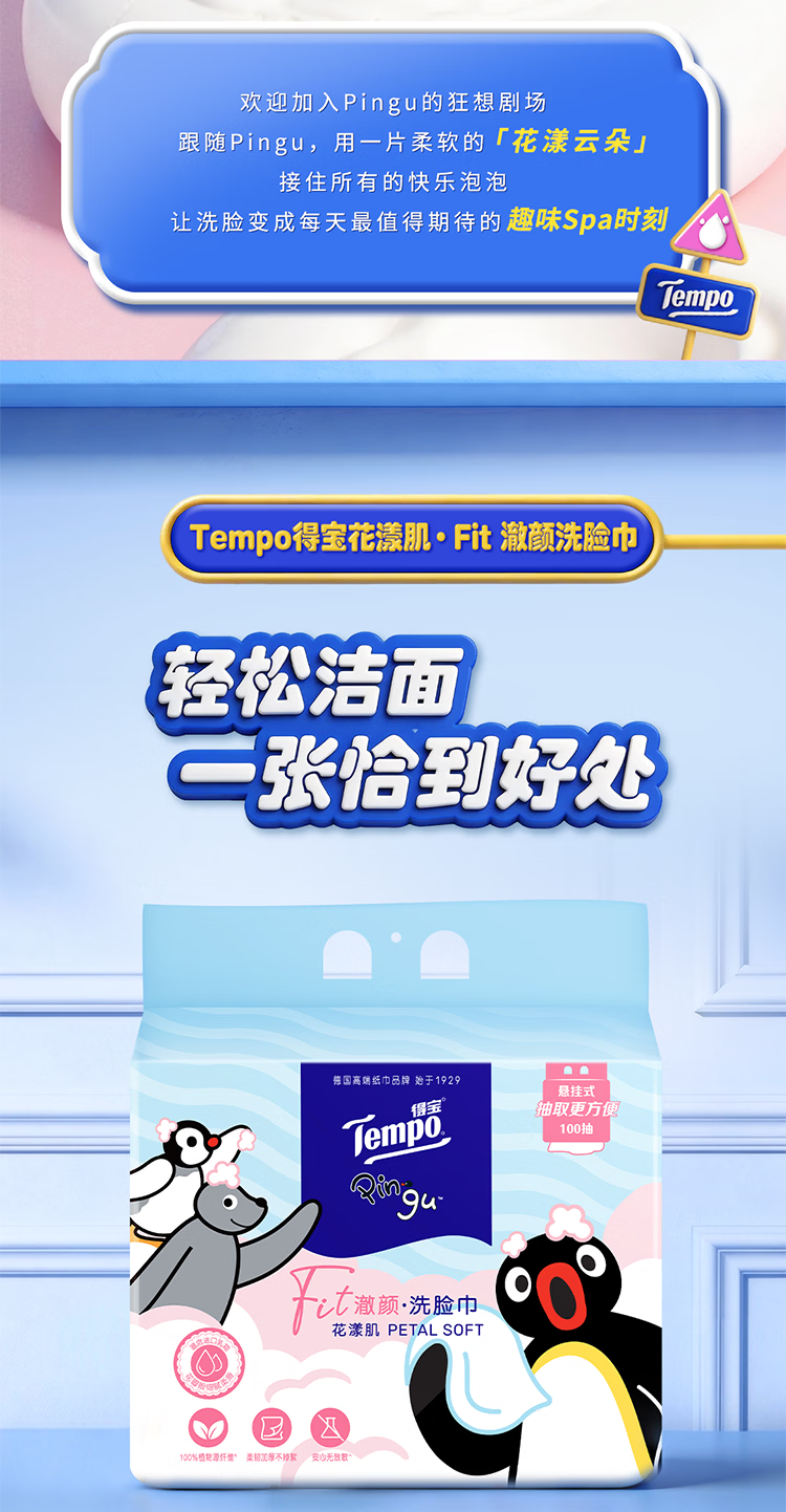 得宝(TEMPO)Pingu联名洗脸巾 100抽/提XL码珍珠纹乳霜绵柔巾 悬挂一次性