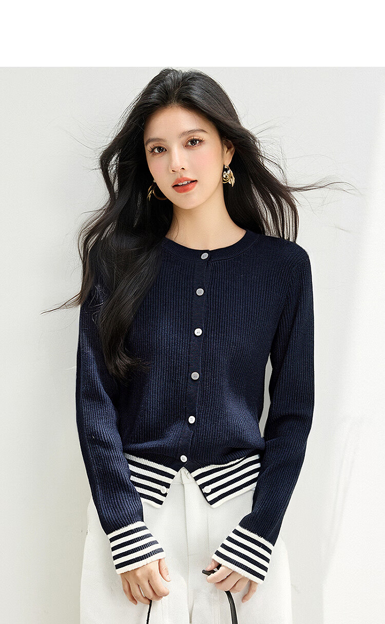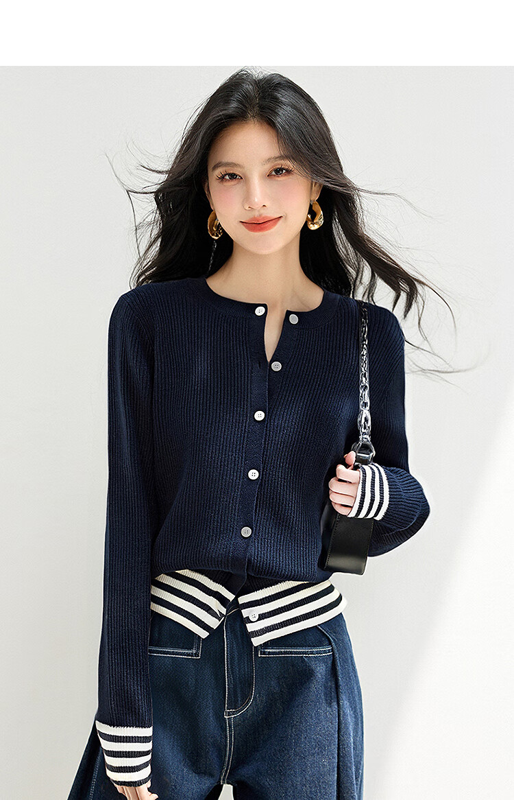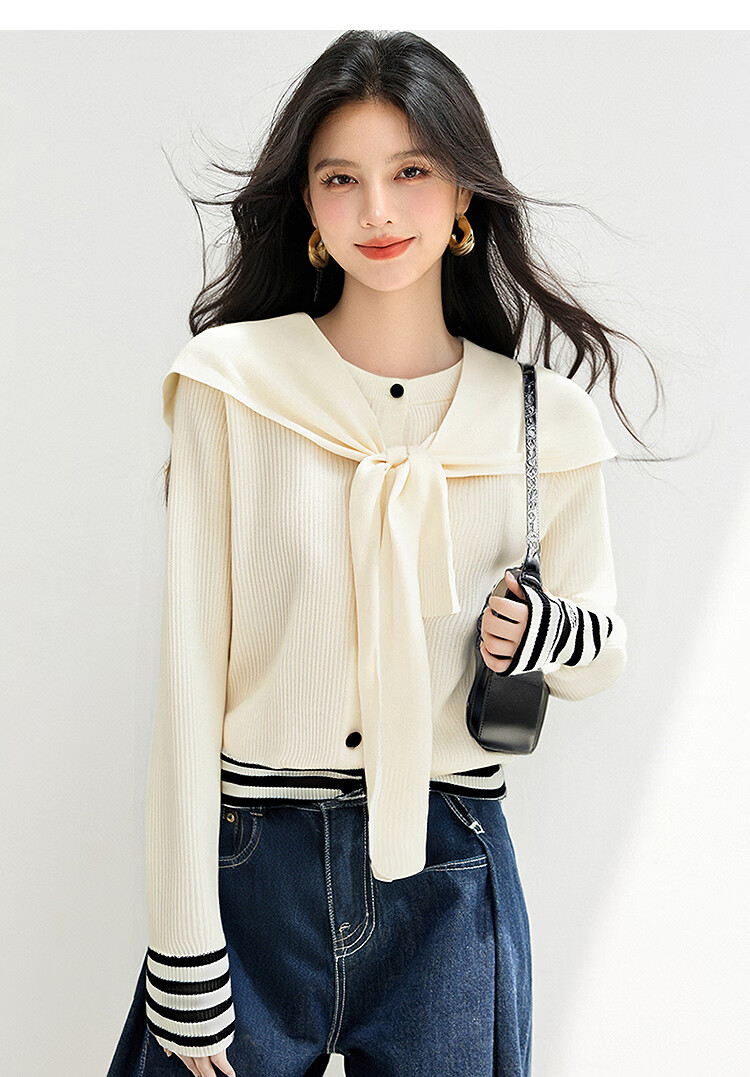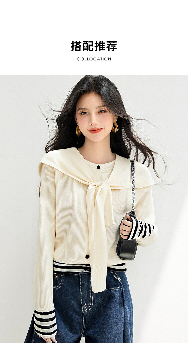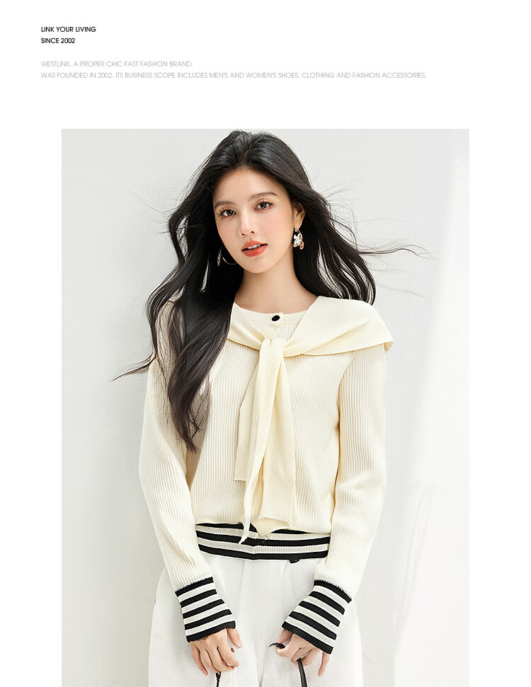 西遇(Westlink)西遇针织开衫外套女2025年秋季新款披肩圆领条纹拼接短款毛衣 杏色 (预售15天) M (160)