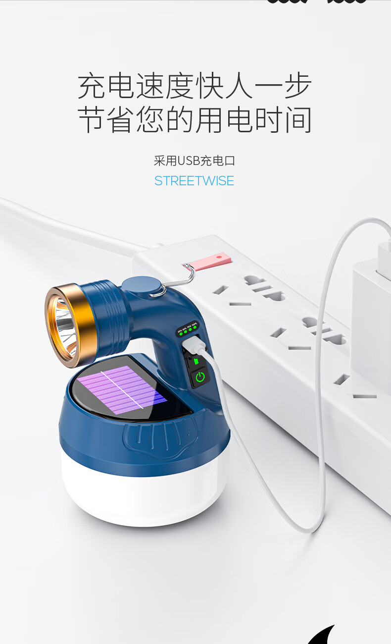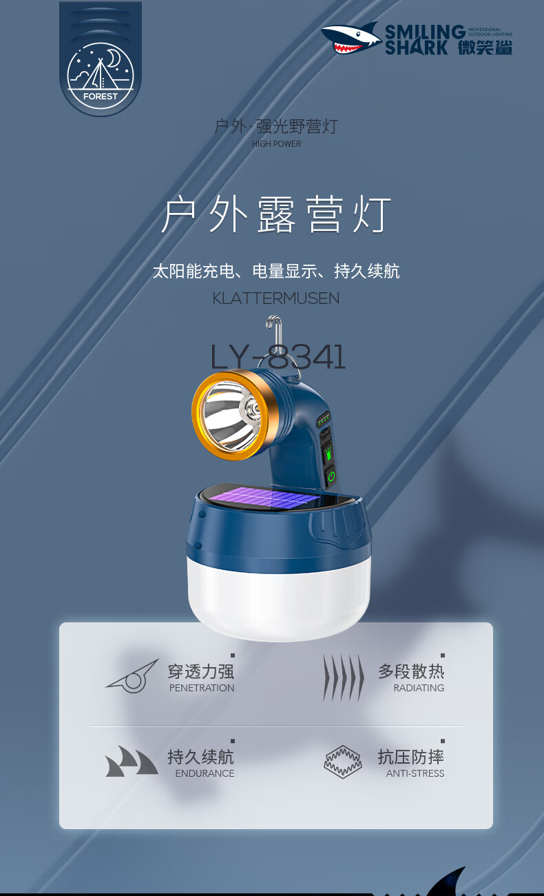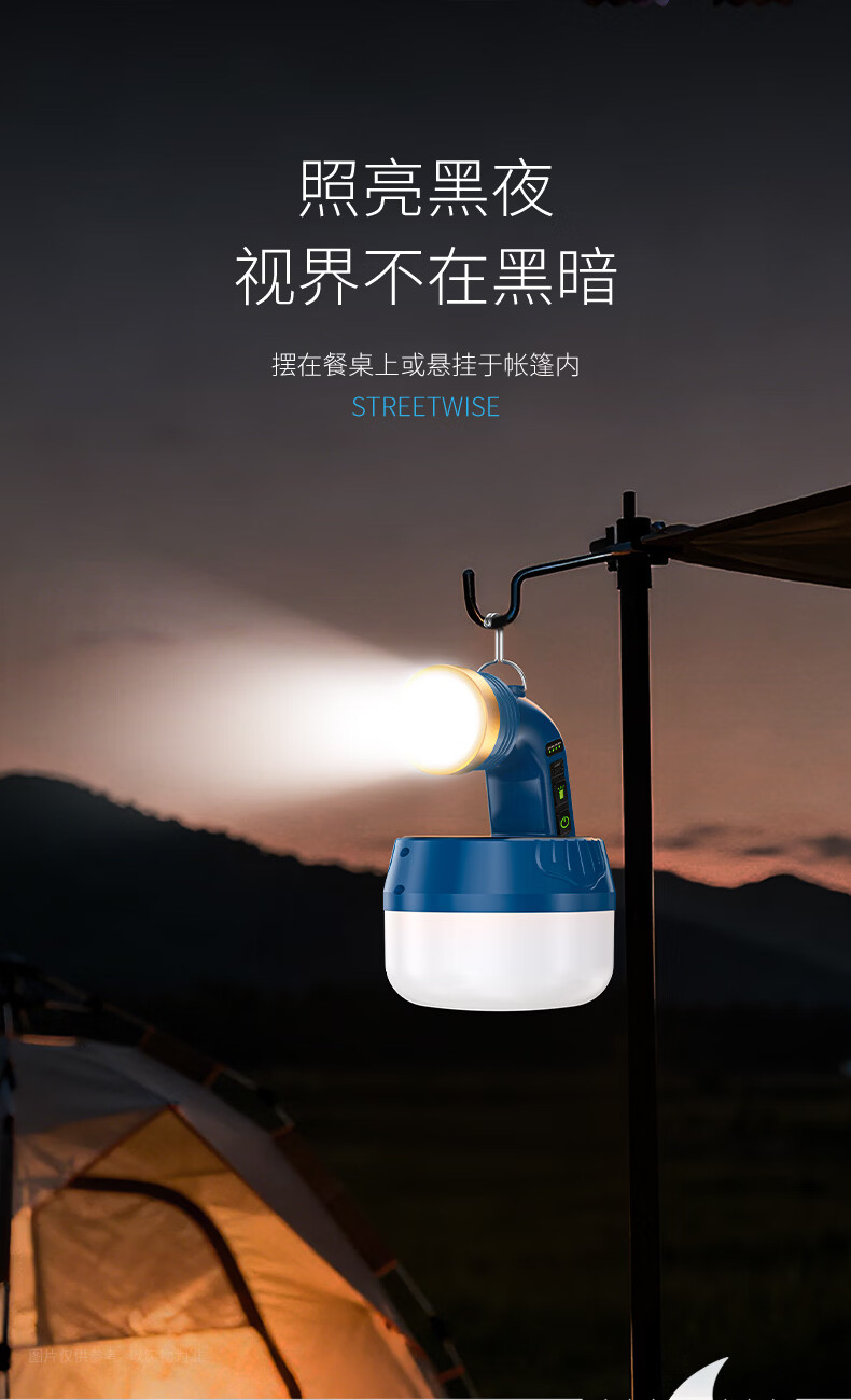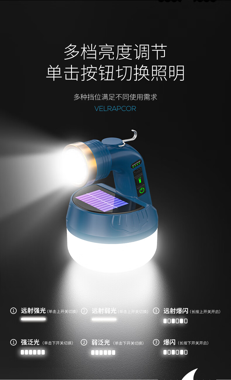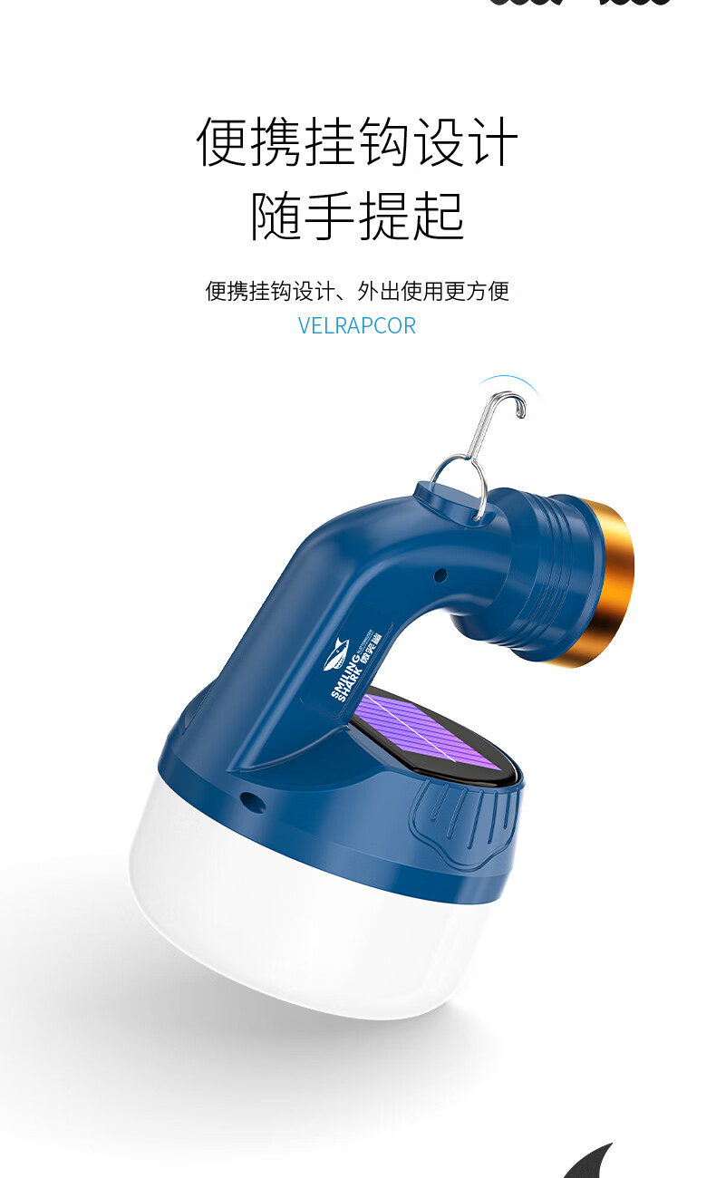 微笑鲨太阳能充电露营灯强光手提户外超亮长续航营地摆摊便携帐篷照明灯 可太阳能充电【蓝色款】泛光照明+挂钩