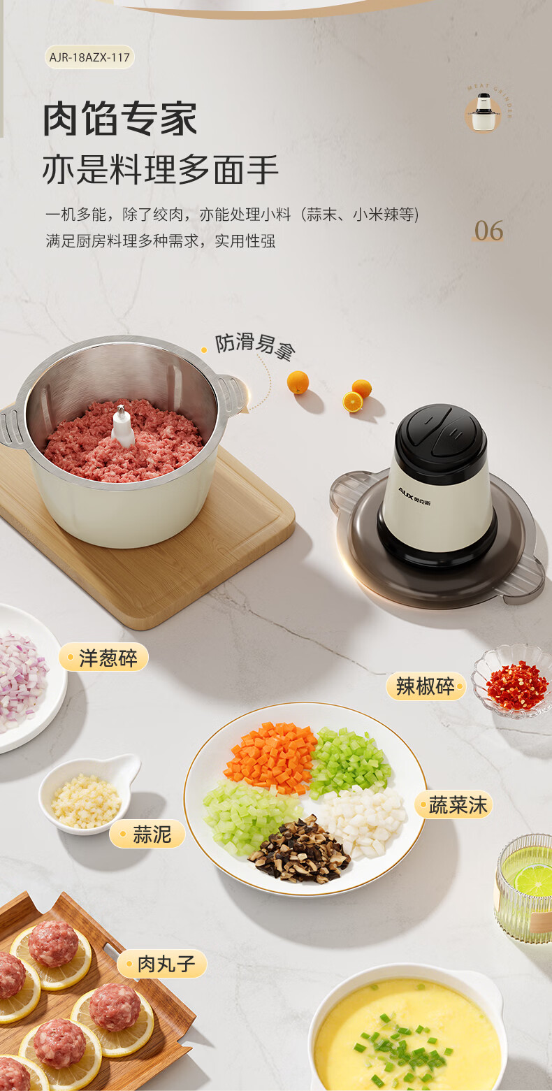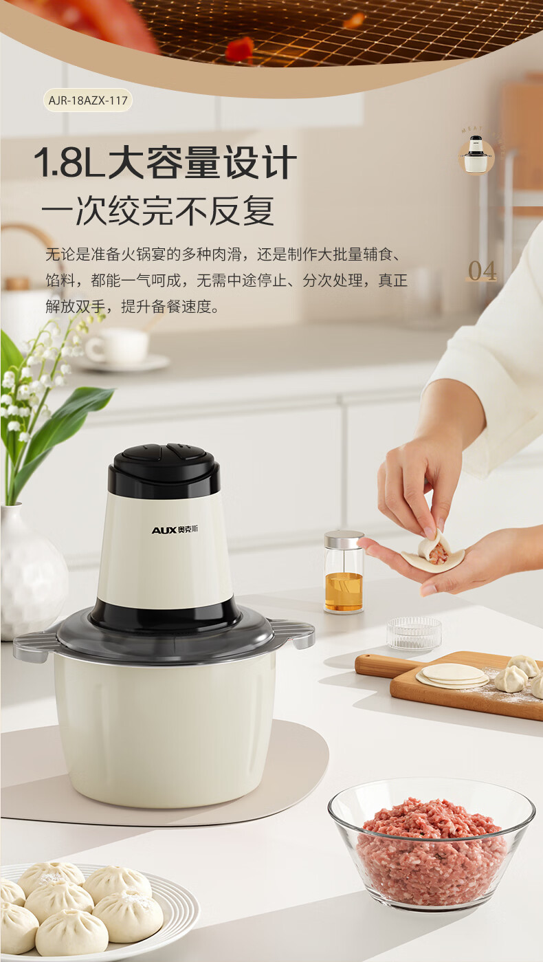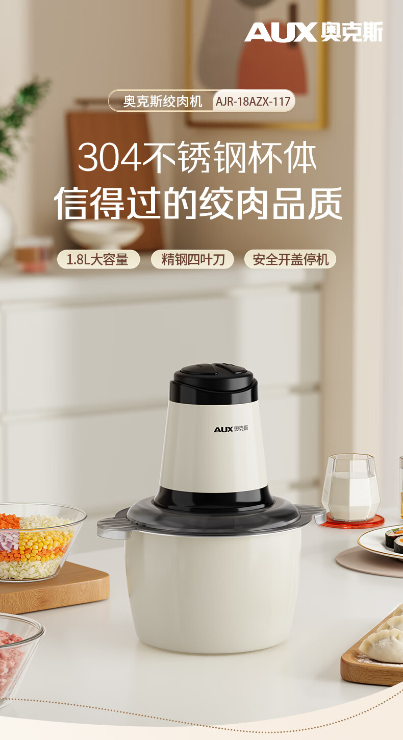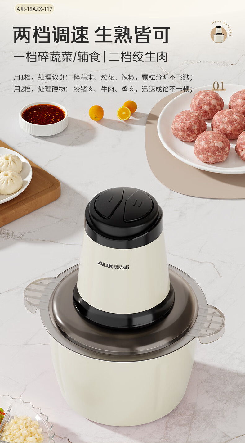 奥克斯(AUX)绞肉机家用小型不锈钢绞馅机碎肉机电动多功能辅食料理机 打肉机肉馅蒜蓉机AJR-18AZX-117白色双刀