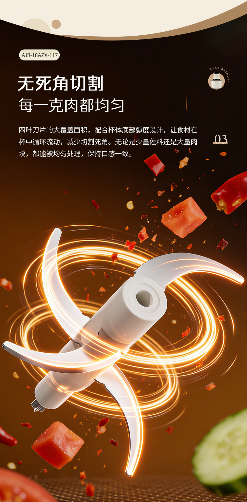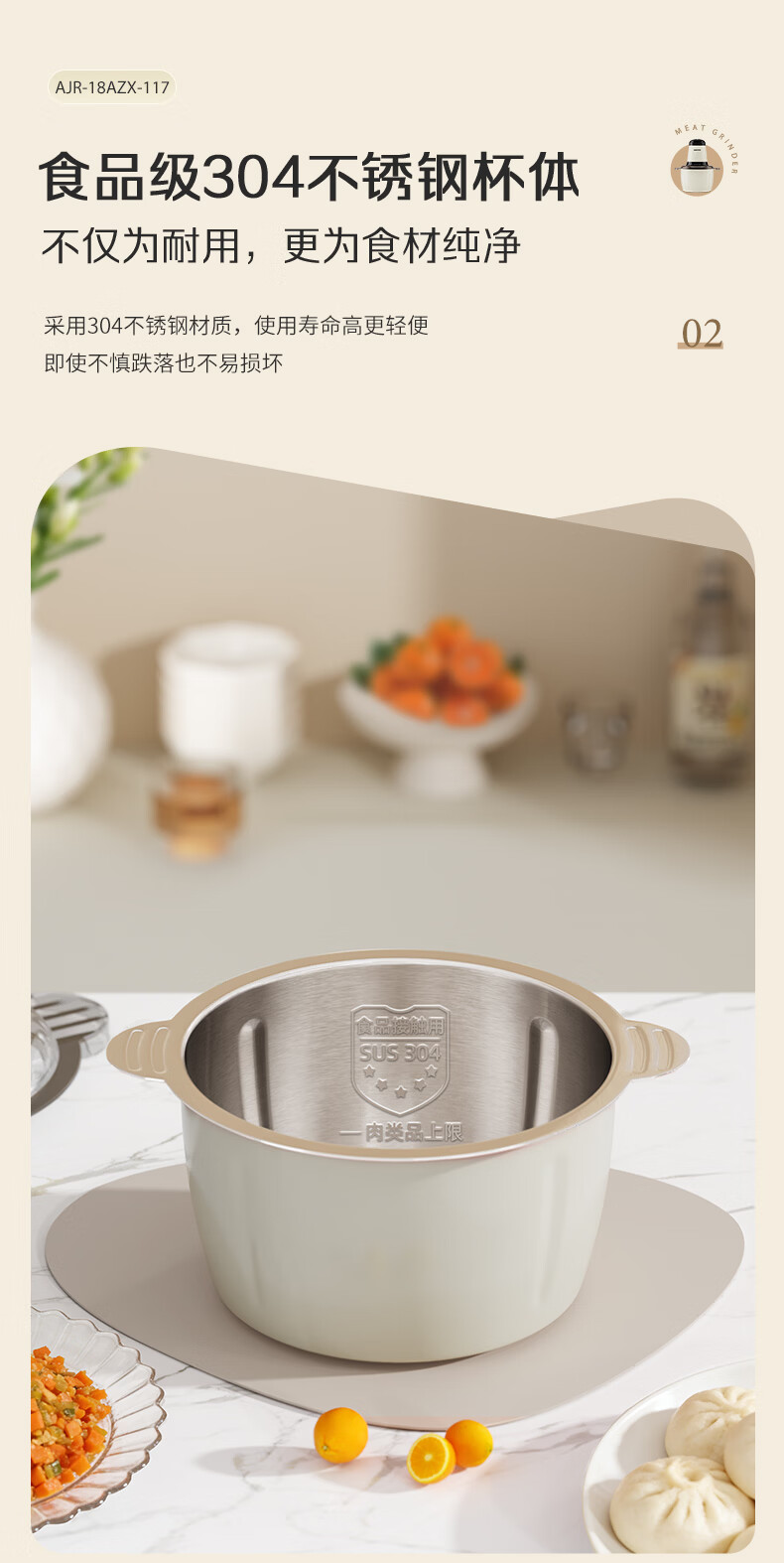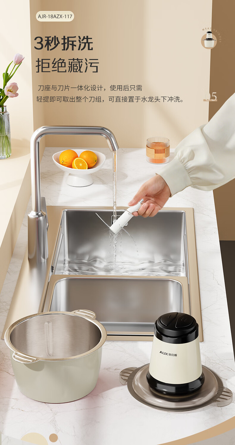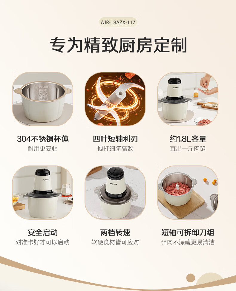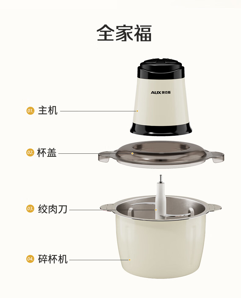 奥克斯(AUX)绞肉机家用小型不锈钢绞馅机碎肉机电动多功能辅食料理机 打肉机肉馅蒜蓉机AJR-18AZX-117白色双刀