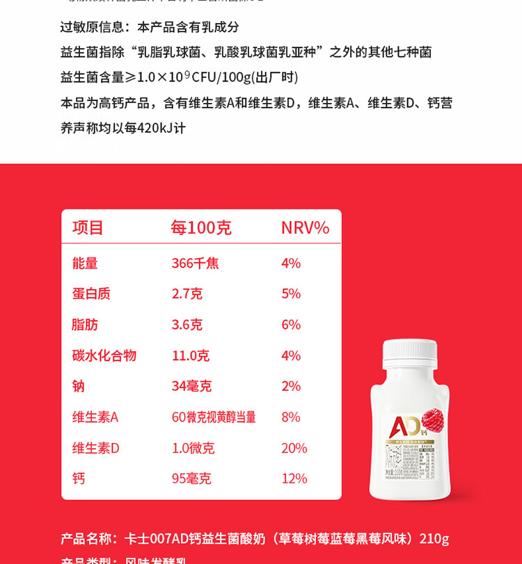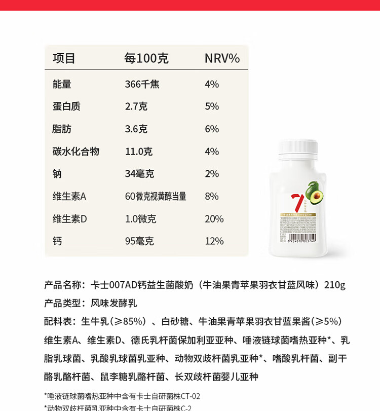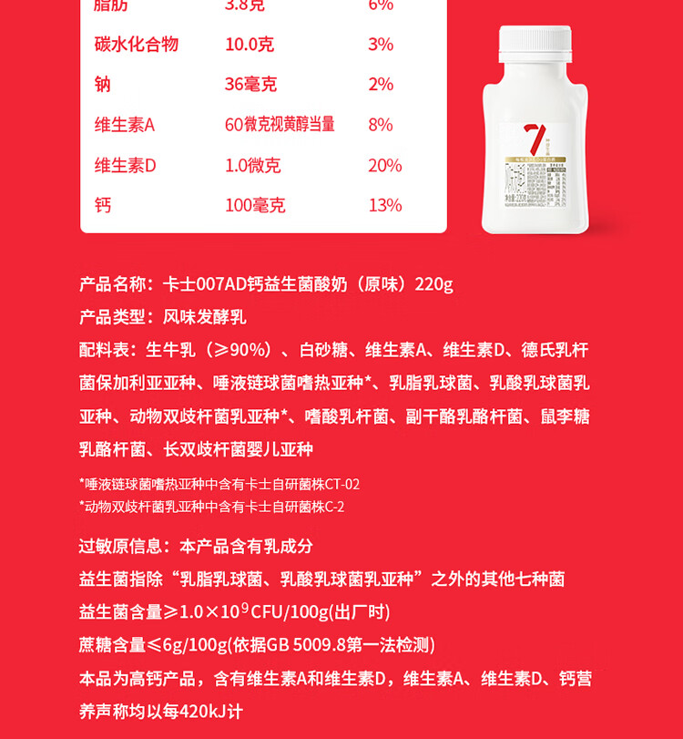 卡士(CLASSY.KISS)007AD钙益生菌酸奶220g*2瓶 原味 低温酸奶