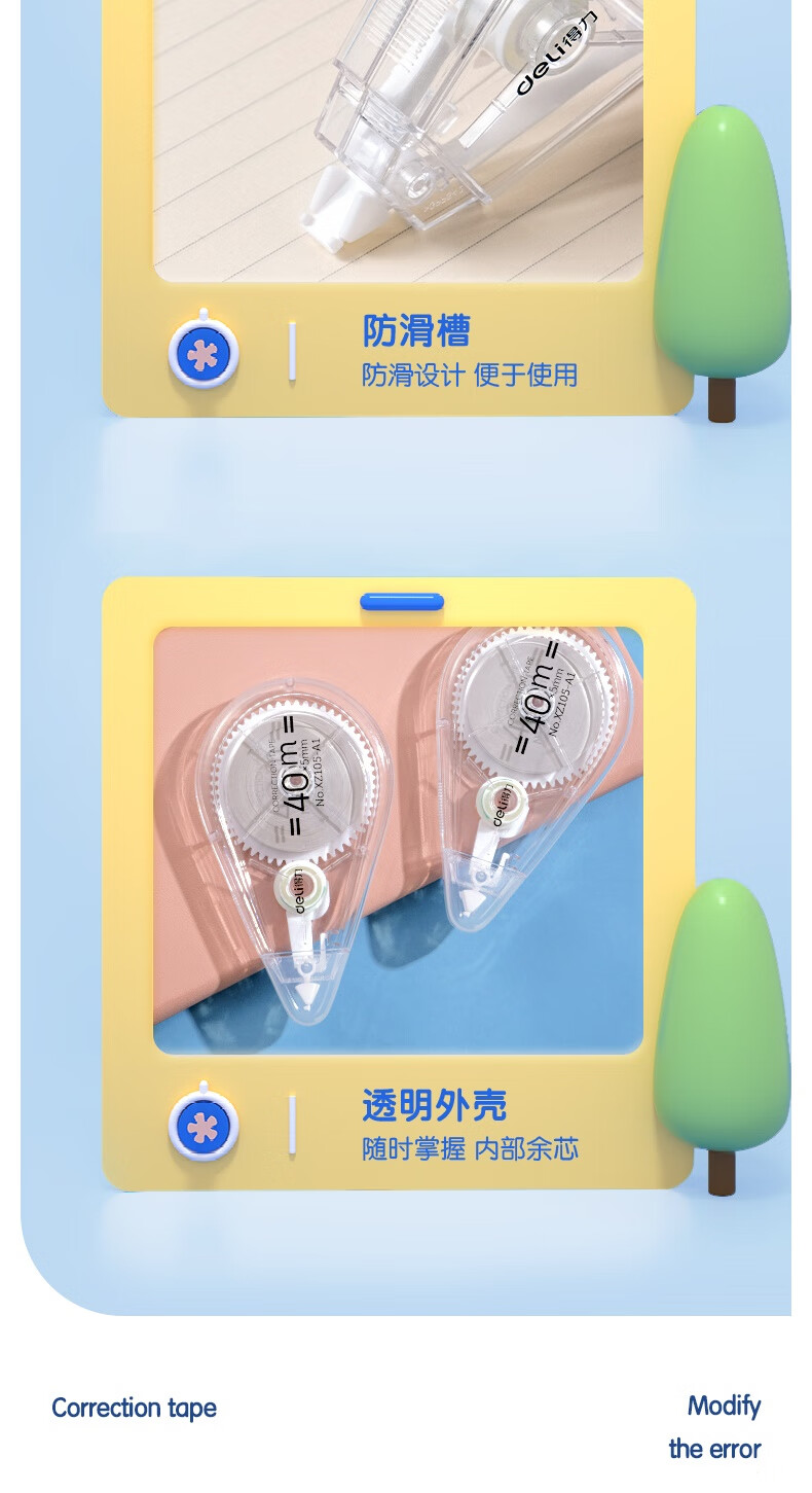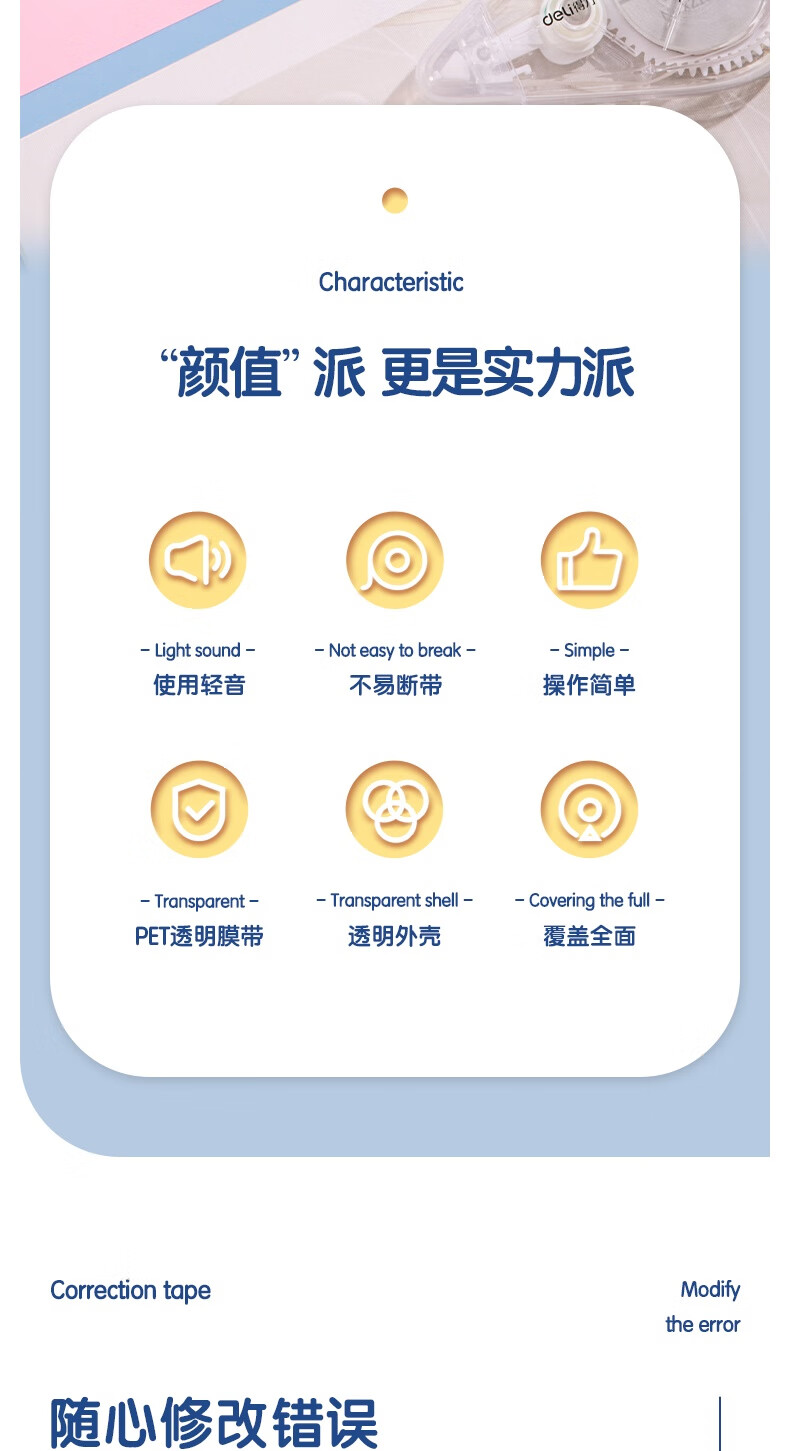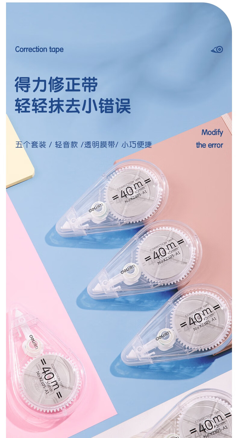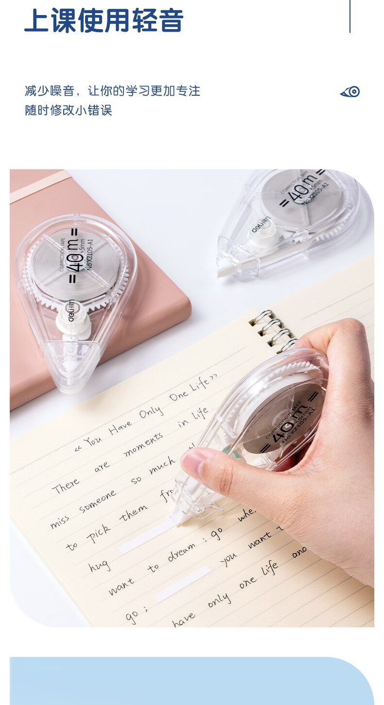 得力(deli)【全网低价】200米大容量修正带超长 开学文具低噪消音改正带 顺滑不断带涂改带 5只装修正带